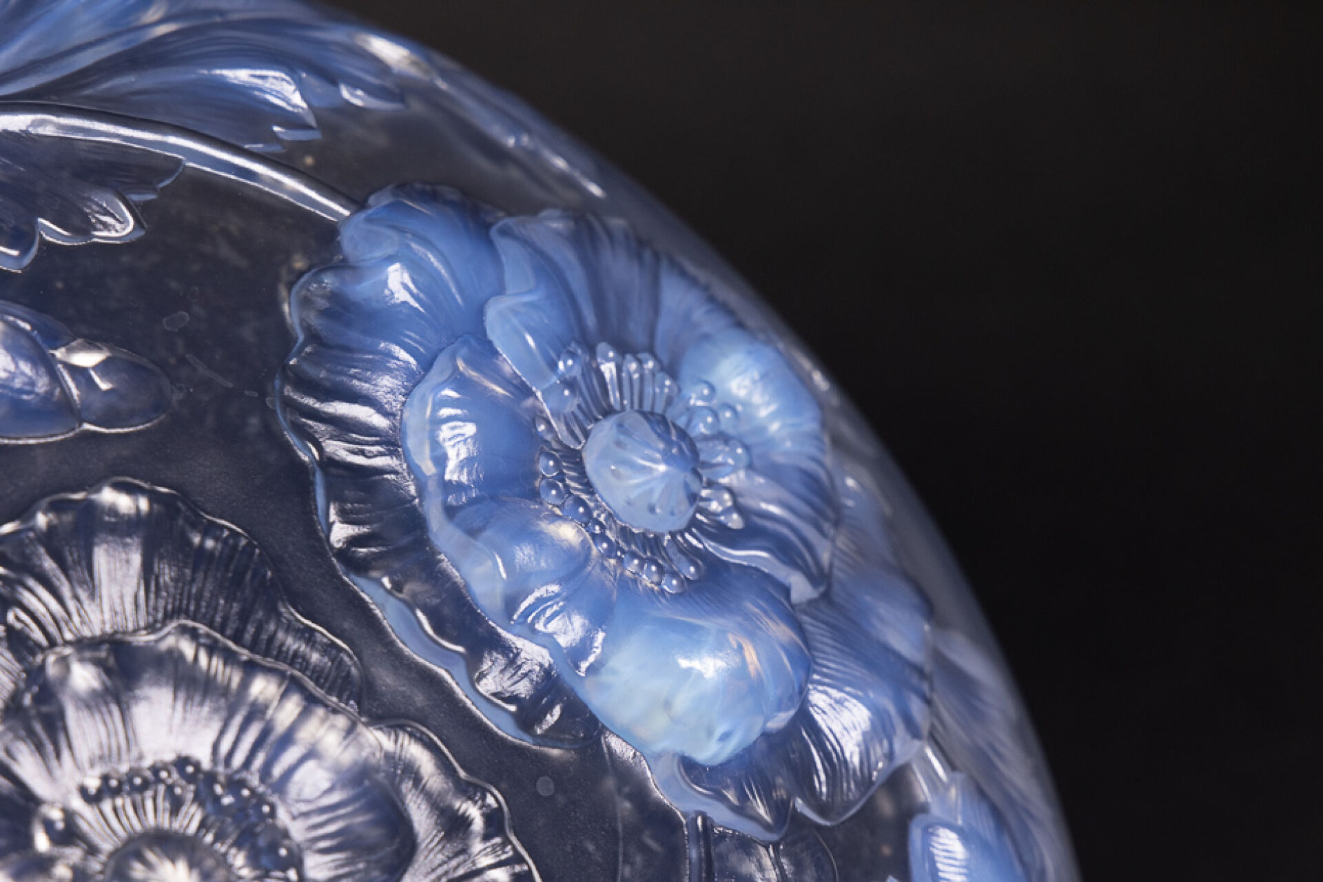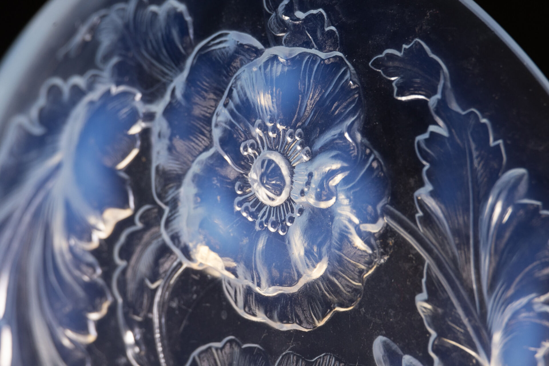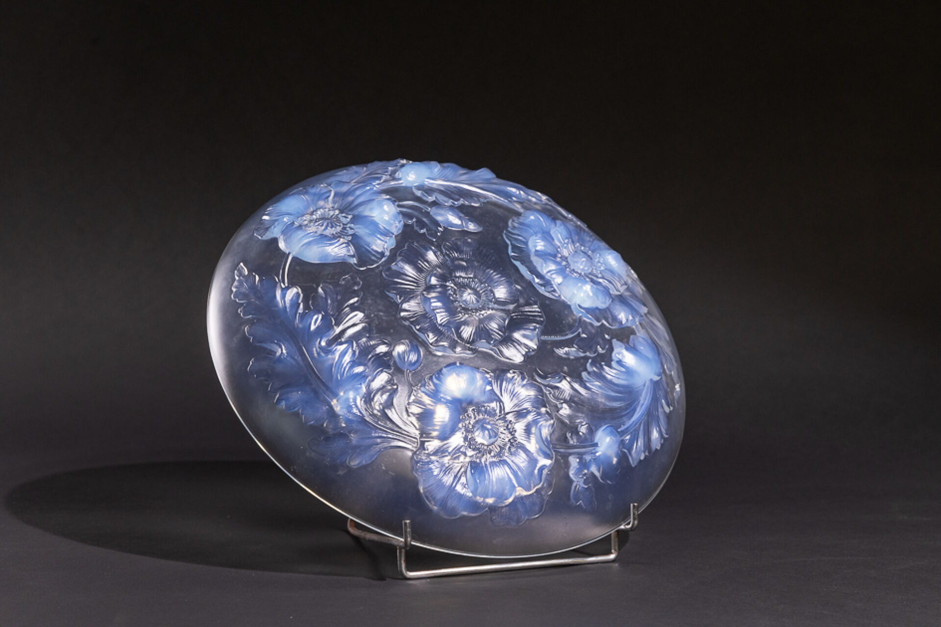 VERLYS France. Coupe circulaire en verre opalescent à décor de pavots tournoyant. Diam. : 35 cm