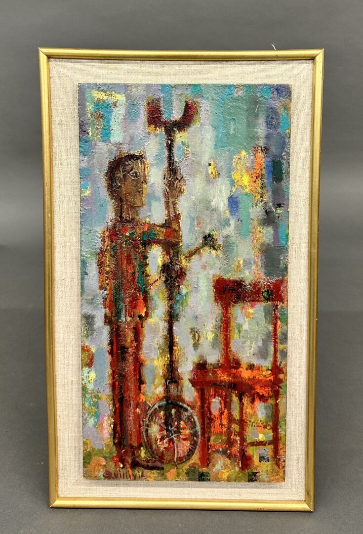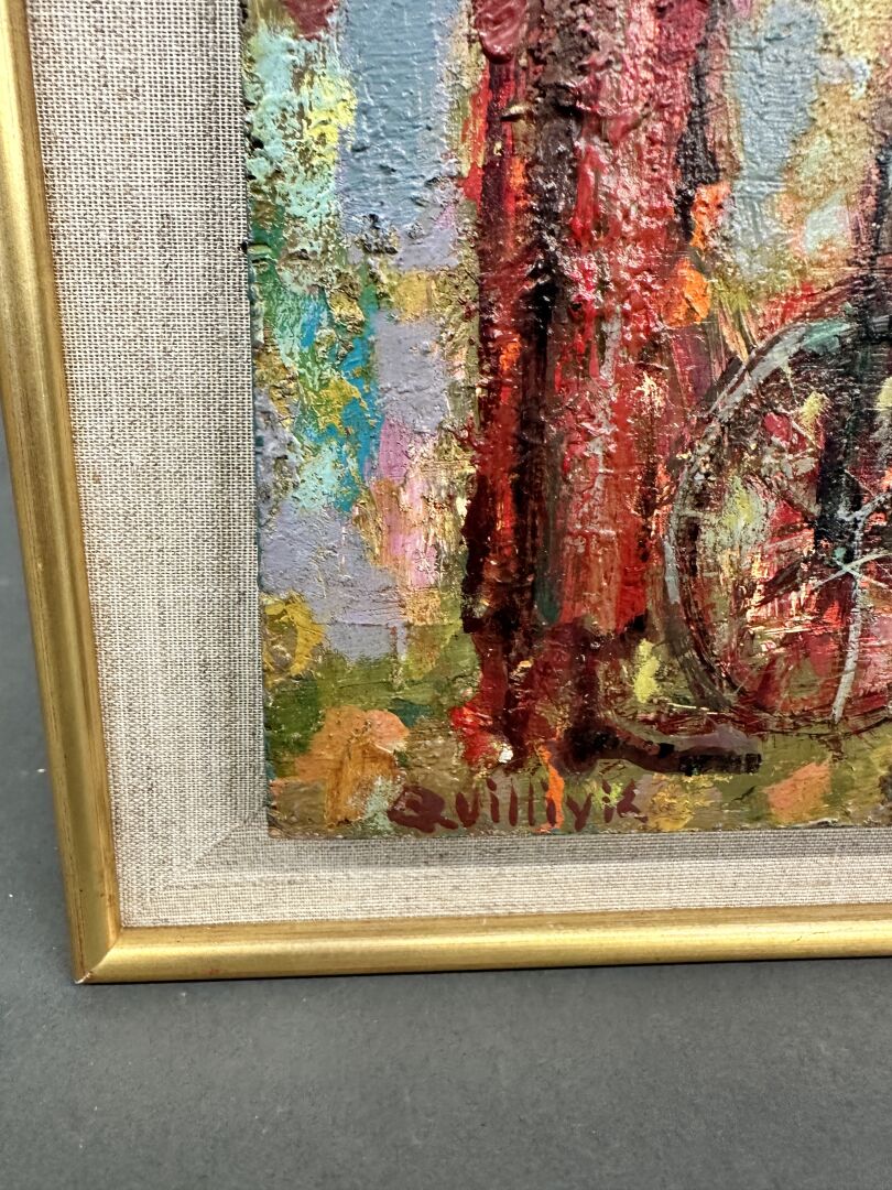 René QUIVILLIC (1879-1969) Monocycliste Dim. : 42,5 cm - 21,5 cm Huile sur panneau signée en bas à gauche.
