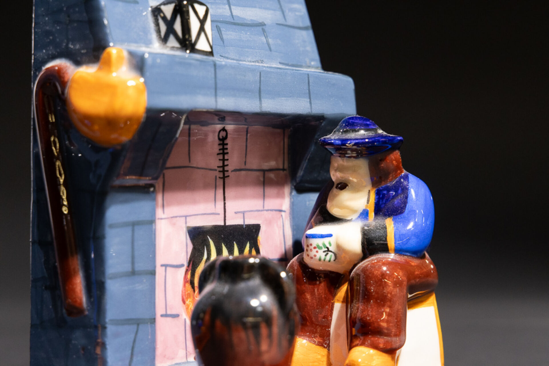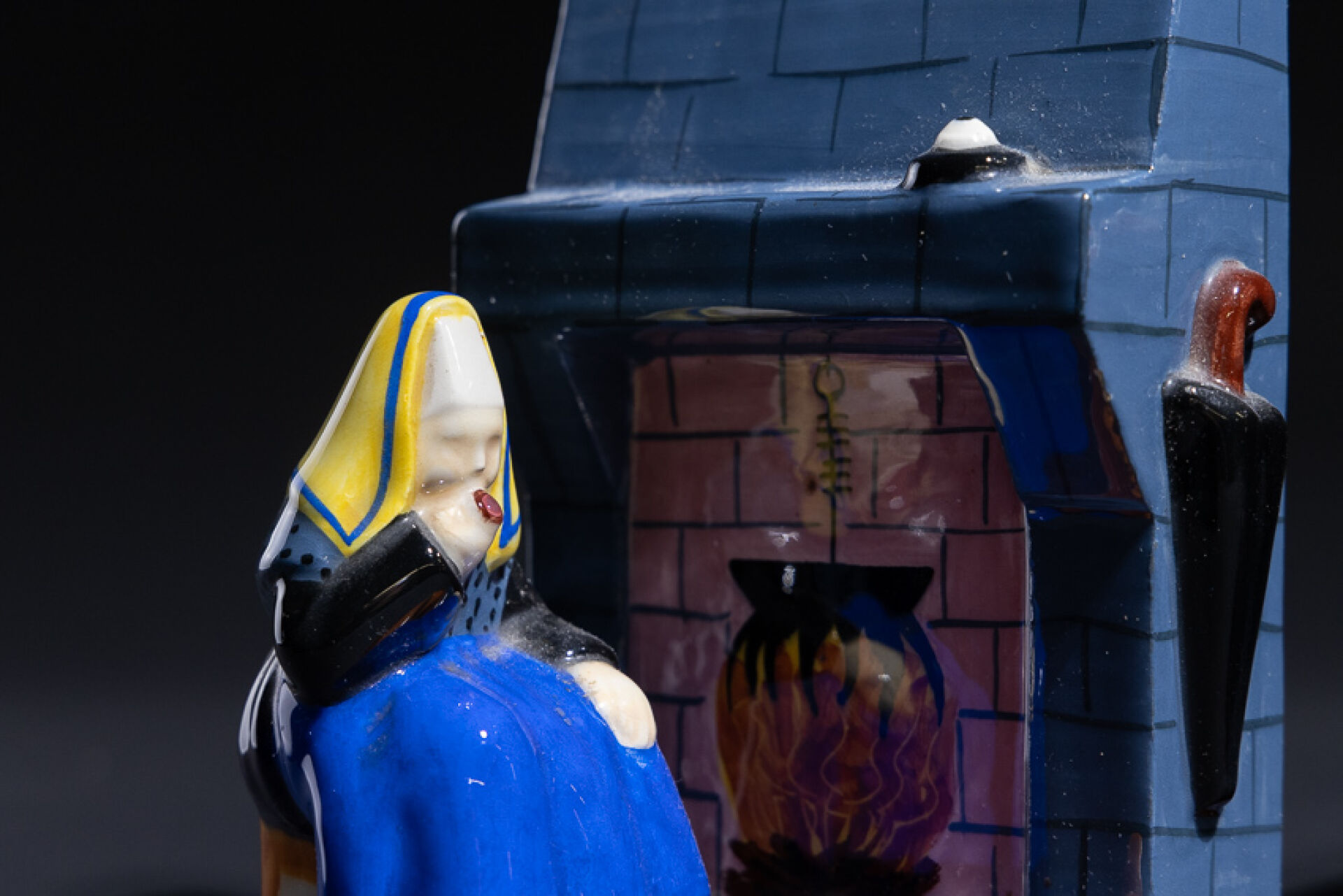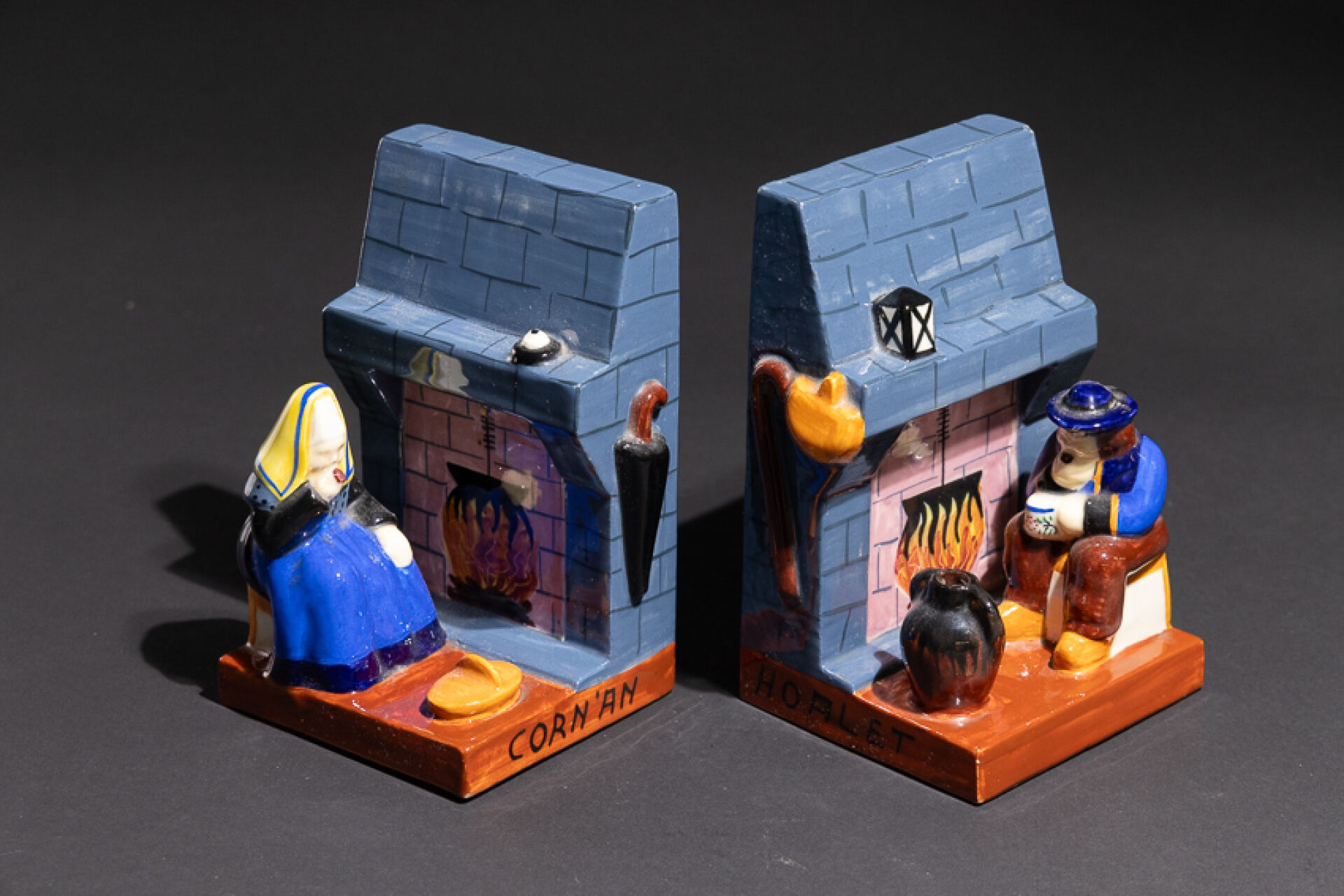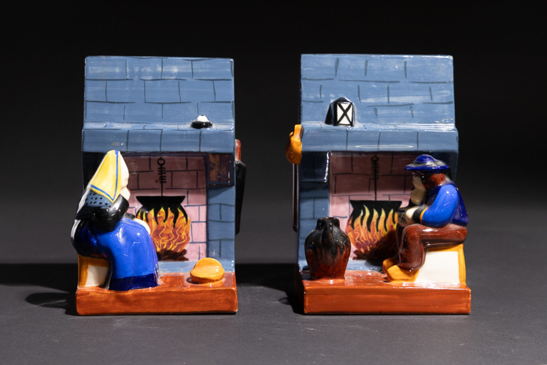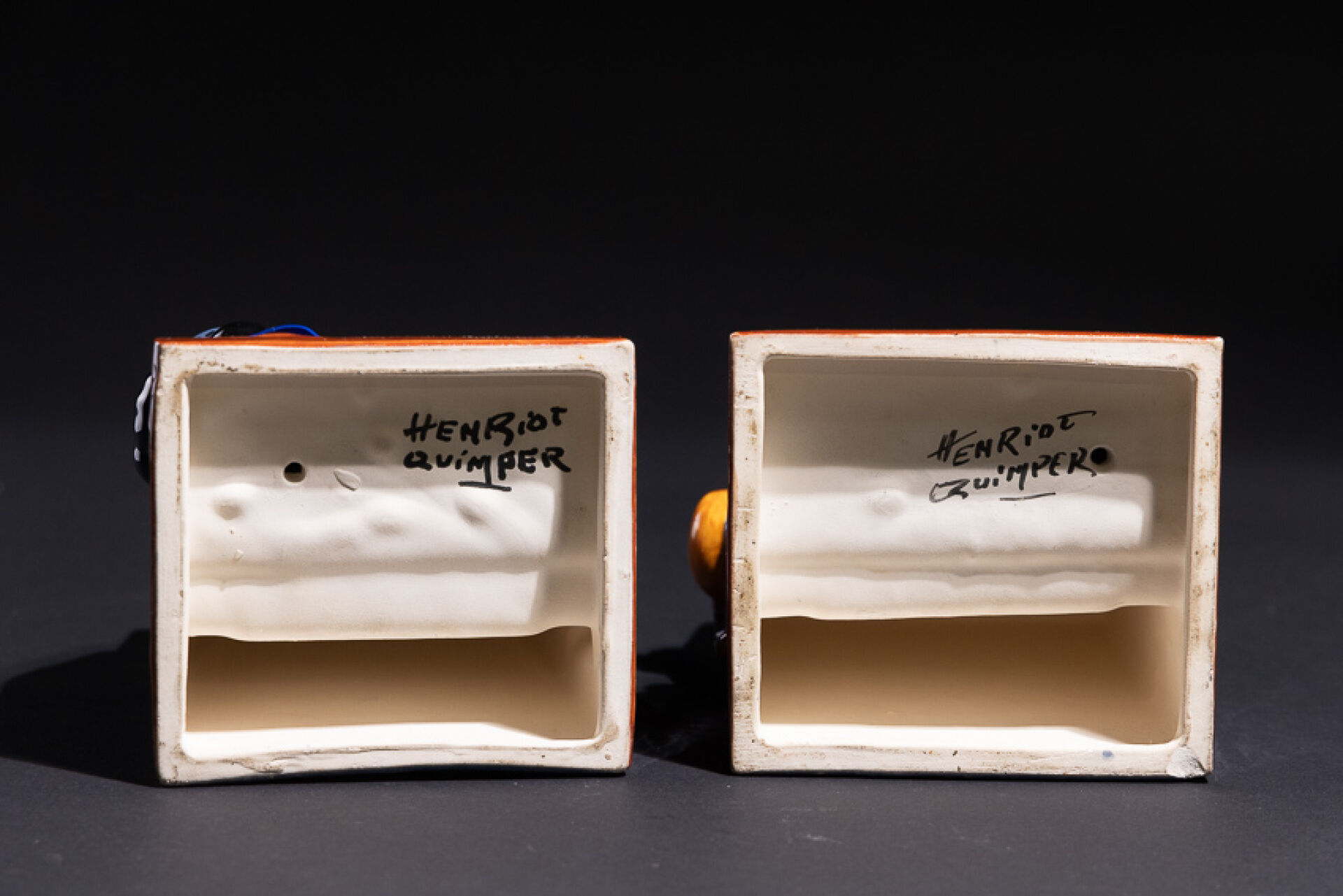 HENRIOT à Quimper. Paire de serre-livres en faïence polychrome figurant un couple près de l'âtre. Marqué sur la base CORN'AN HOALET et au revers HENRIOT à QUIMPER (éclats et restaurations). Haut. : 18.5 cm - Larg. : 11.5 cm - Prof. : 10.5 cm