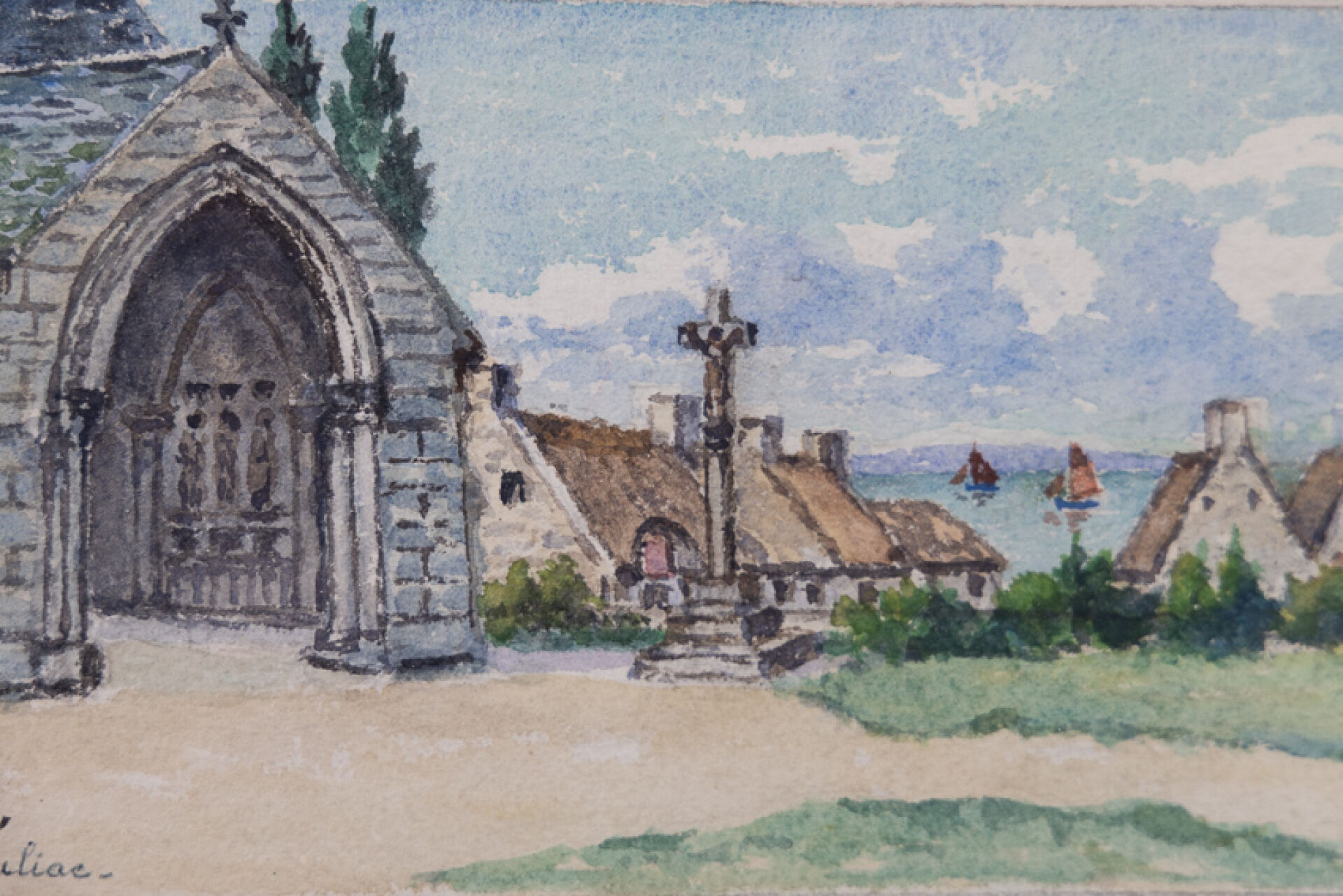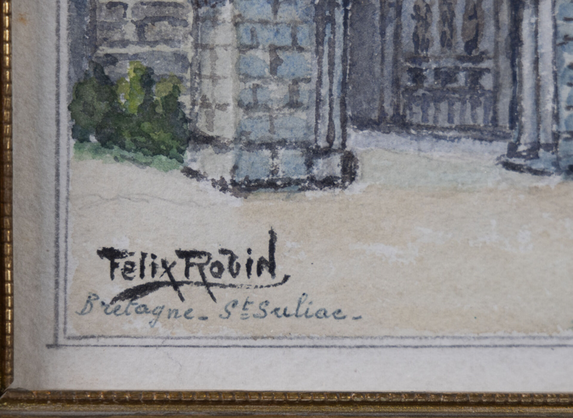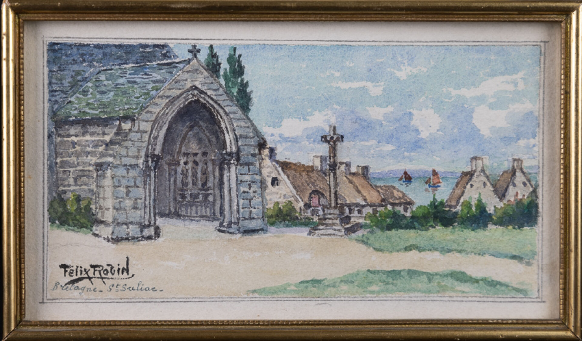 Félix ROBIN (XXe siècle). Saint Suliac en Bretagne - Calvaire. Aquarelle signée. Haut. : 12.5 cm - Larg. : 24 cm