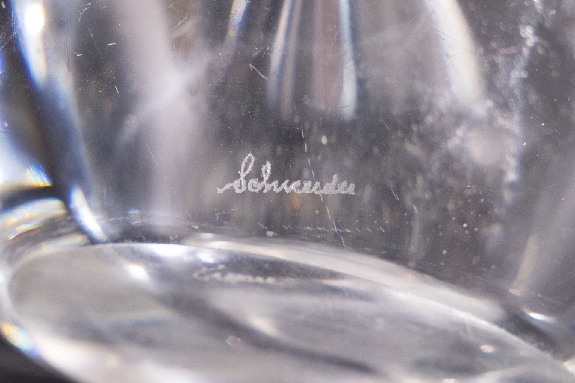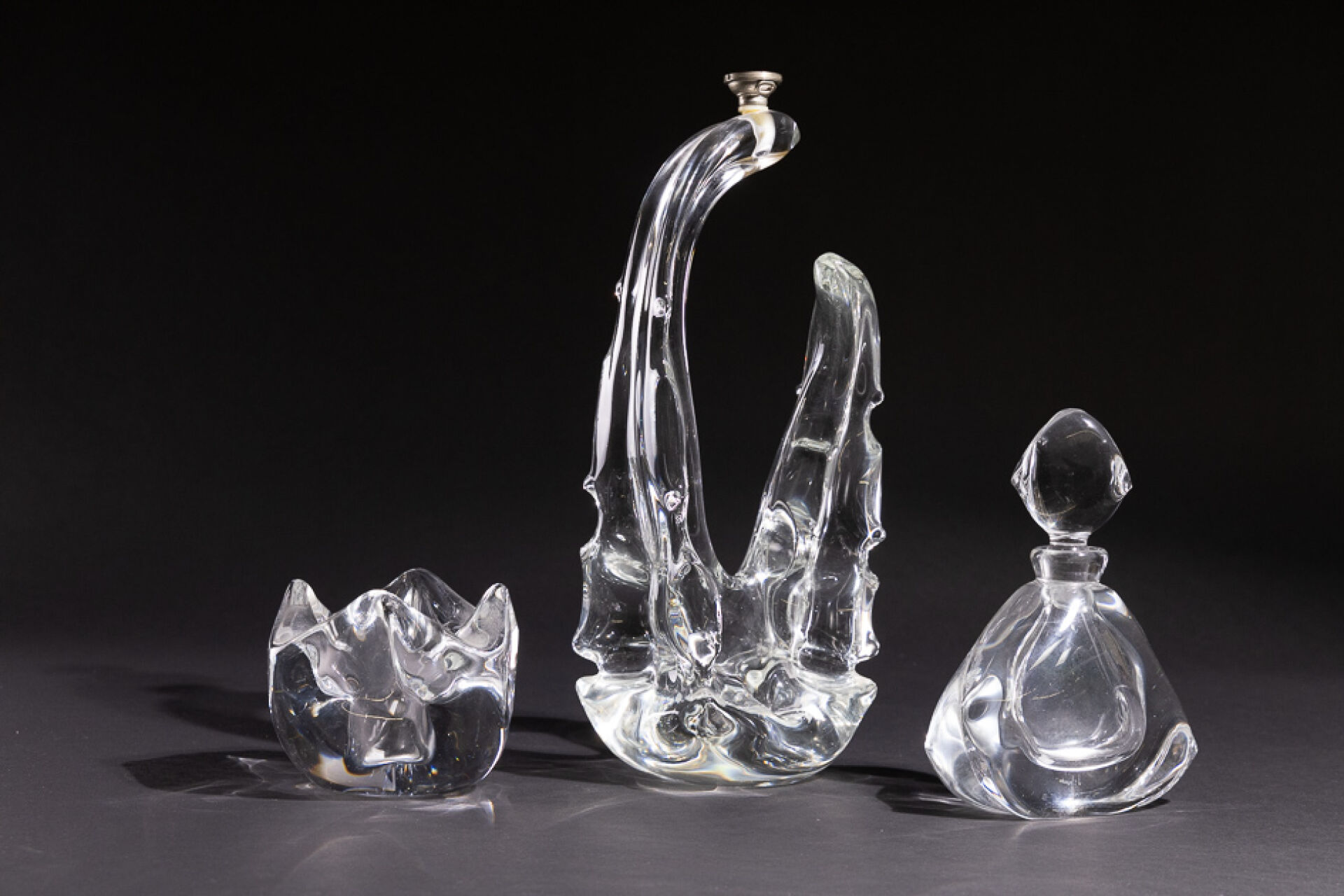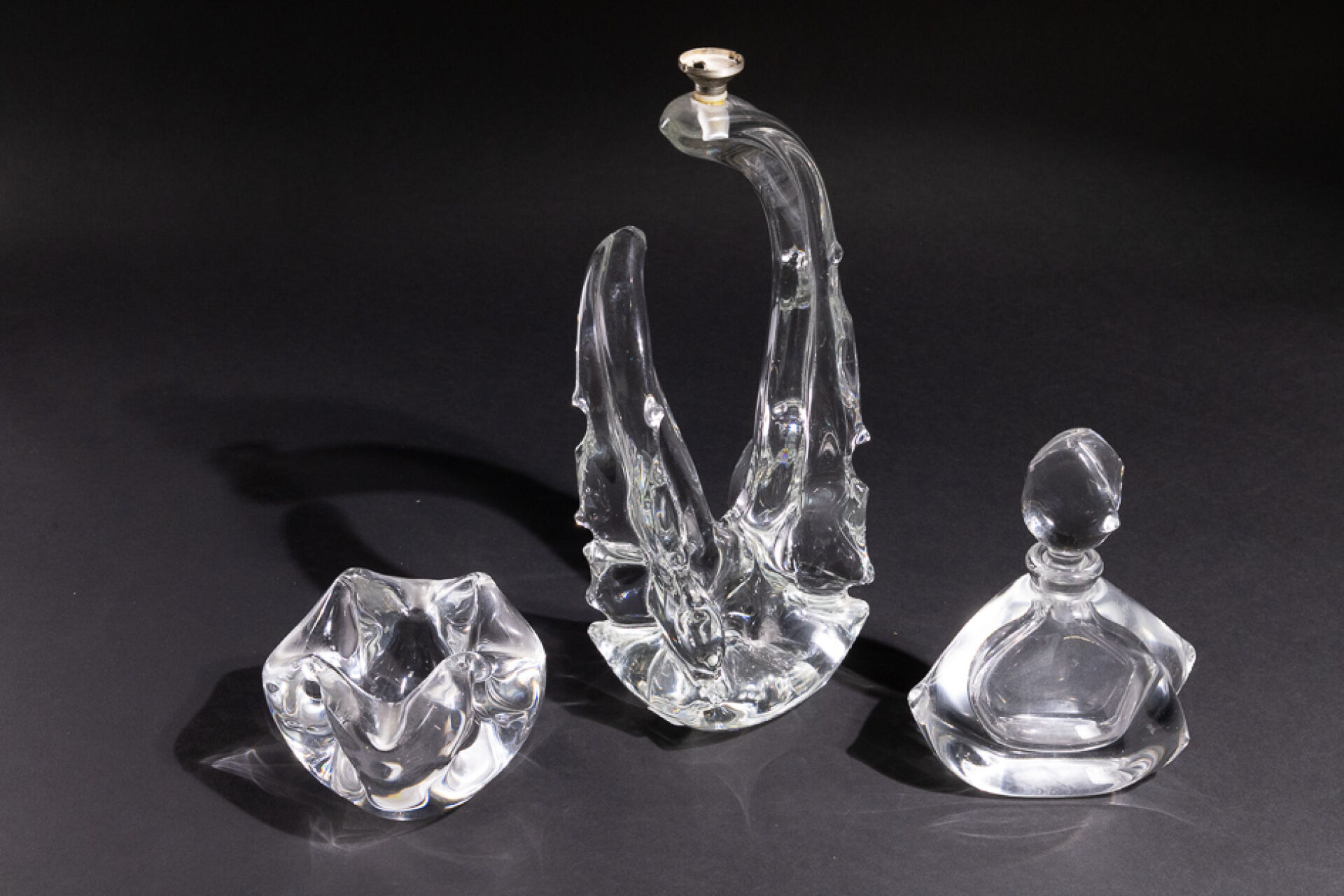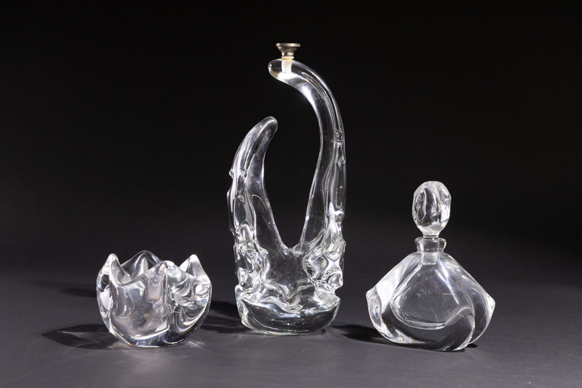 SCHNEIDER FRANCE. Trois objets en cristal, signés tels que : - Pied de lampe de forme libre. Haut. : 34 cm (manque système d'électrification). - Carafe triangulaire. Haut. : 19 cm - Vide-poche carré. Haut. : 10 cm