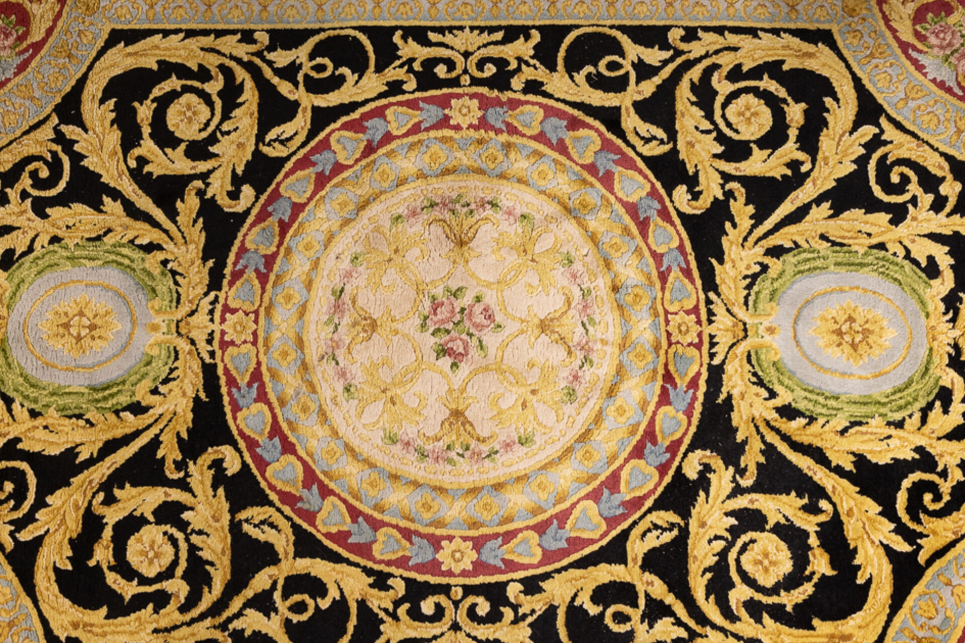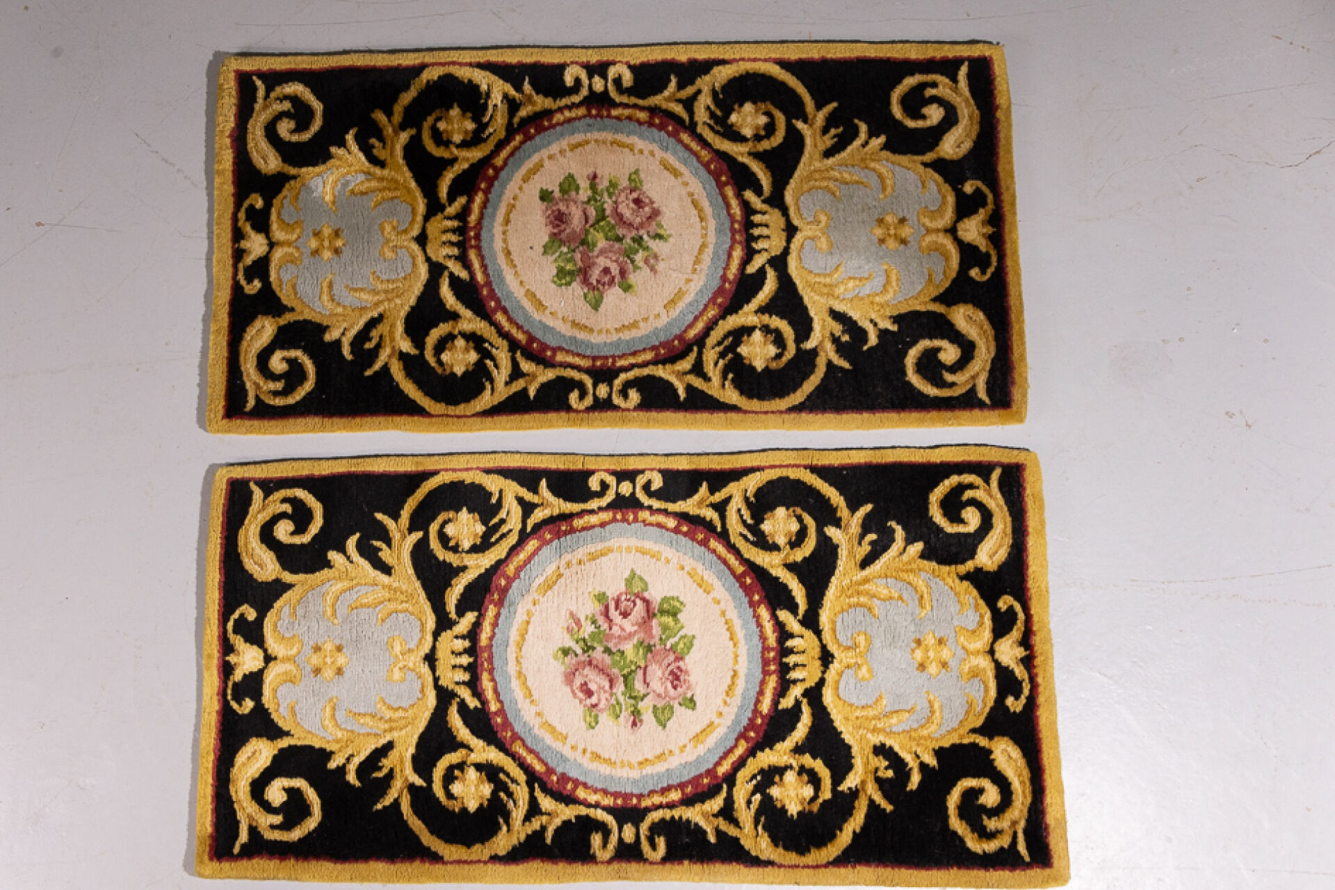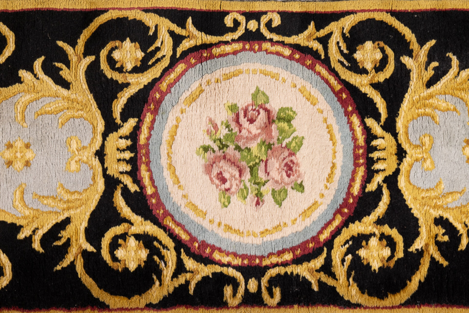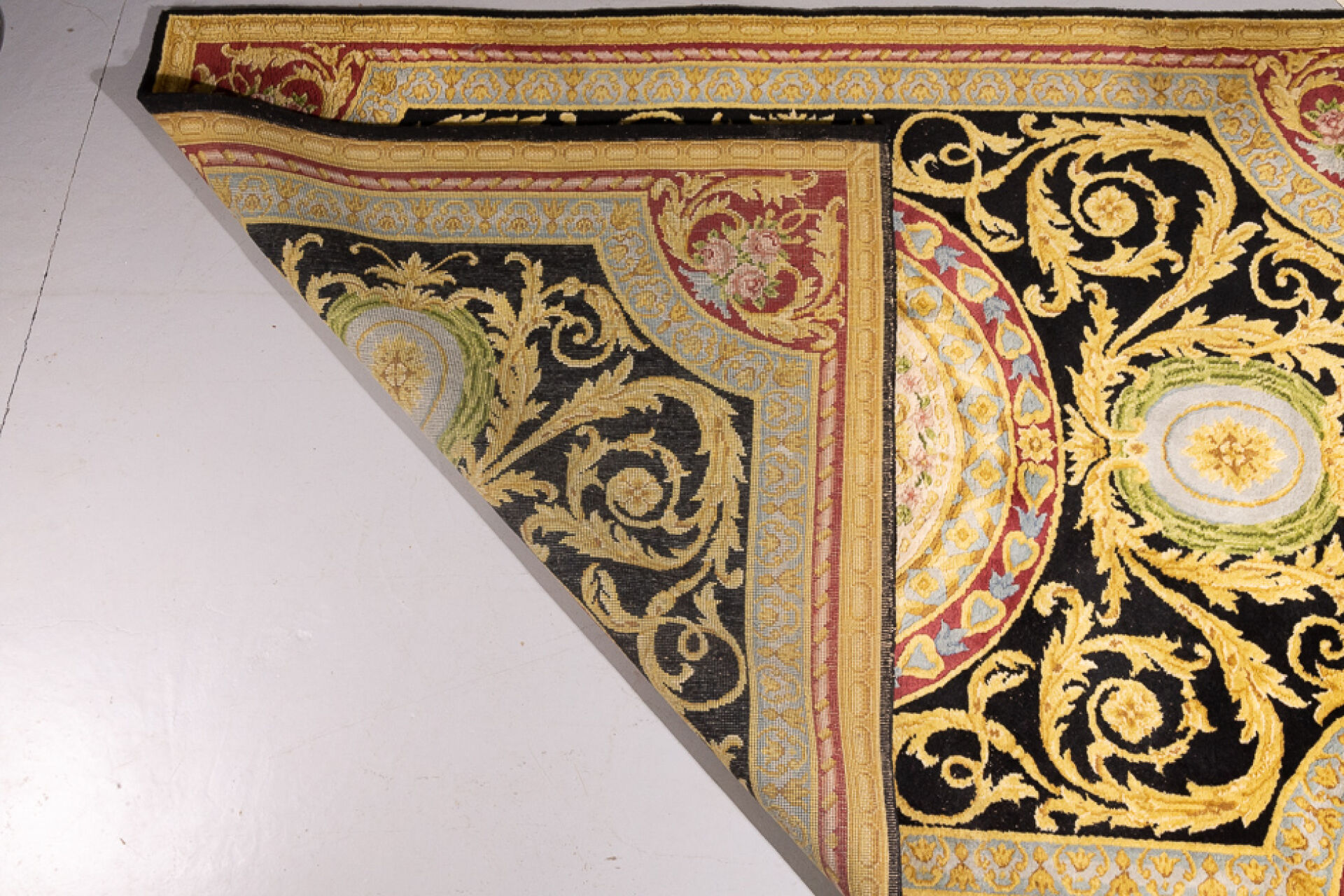 Dans le goût d'Aubusson. Tapis à décor d'un cartouche central fleuri encadré de volutes dorées sur fond noir. Dim. : 300 x 200 cm On joint : Dans le goût d'Aubusson deux descentes de lit au modèle. Dim. : 140 x 71 cm