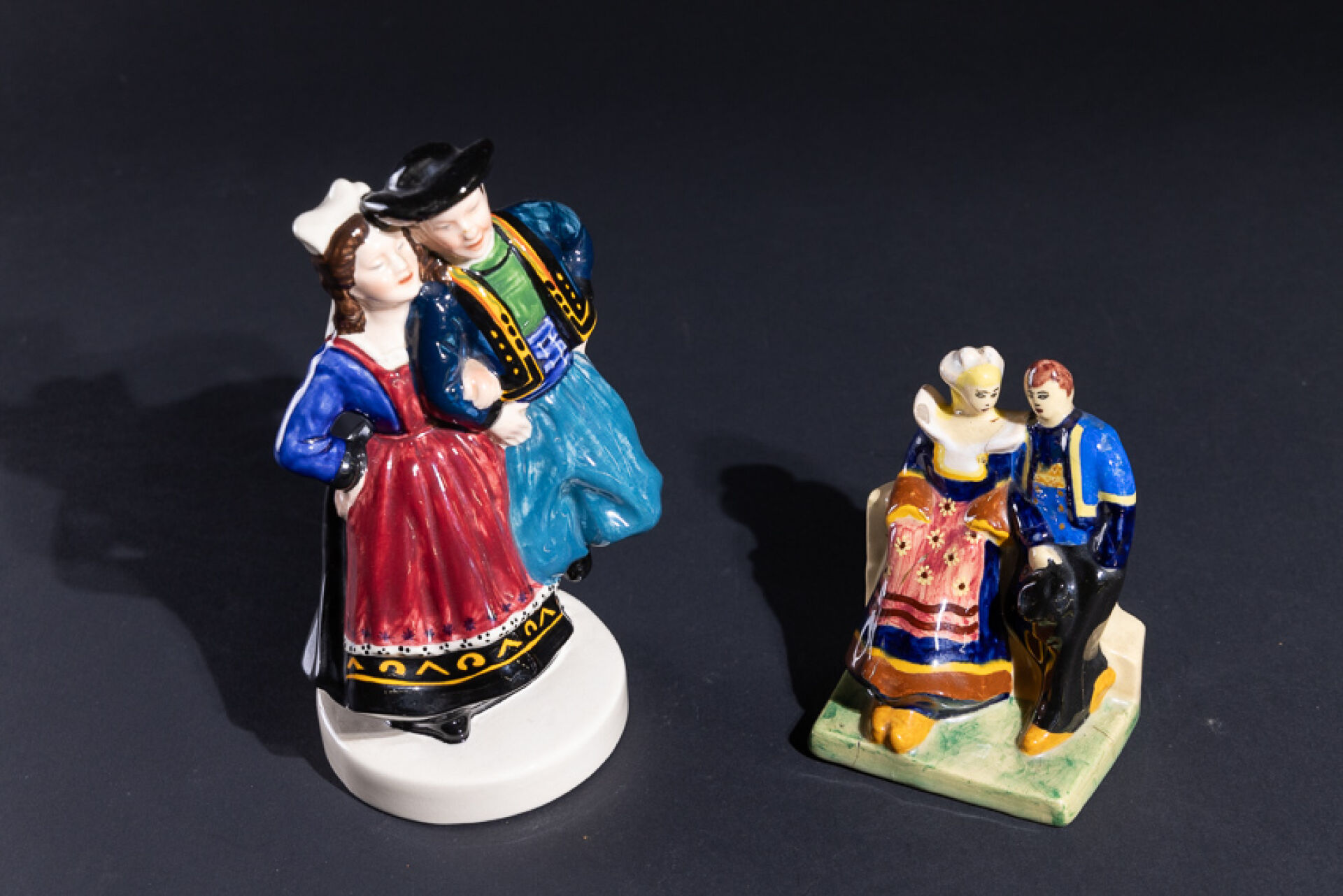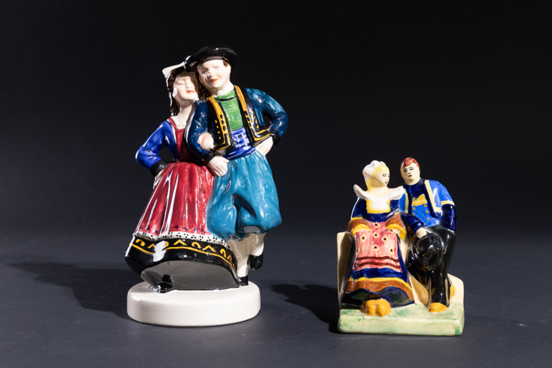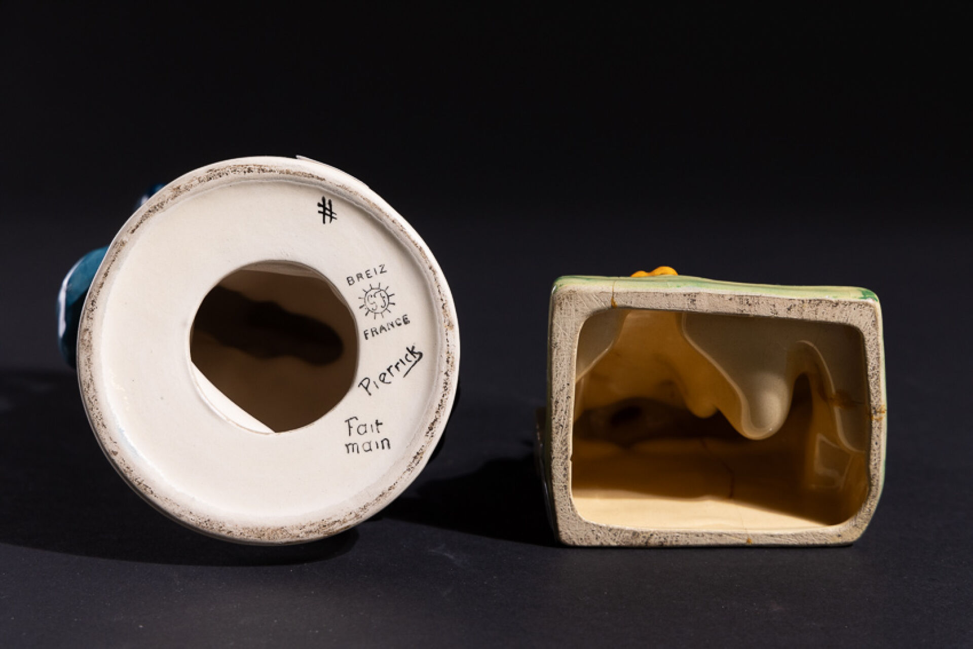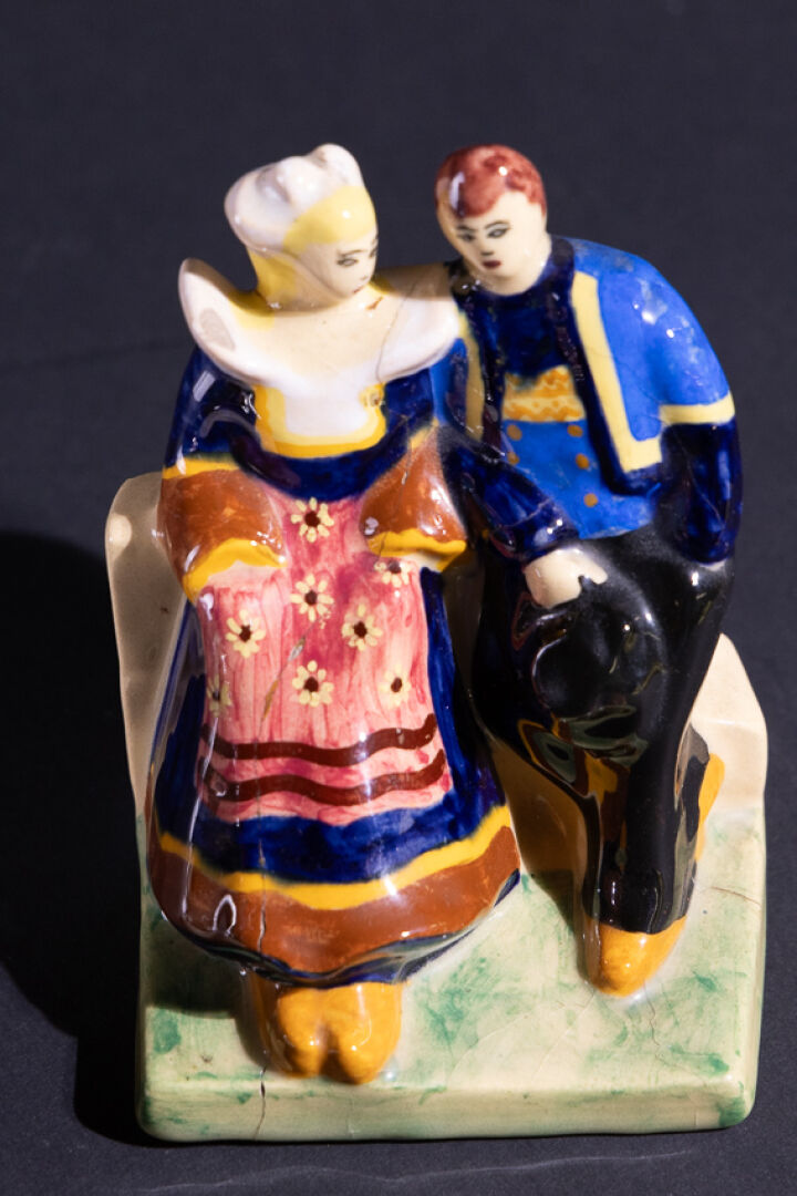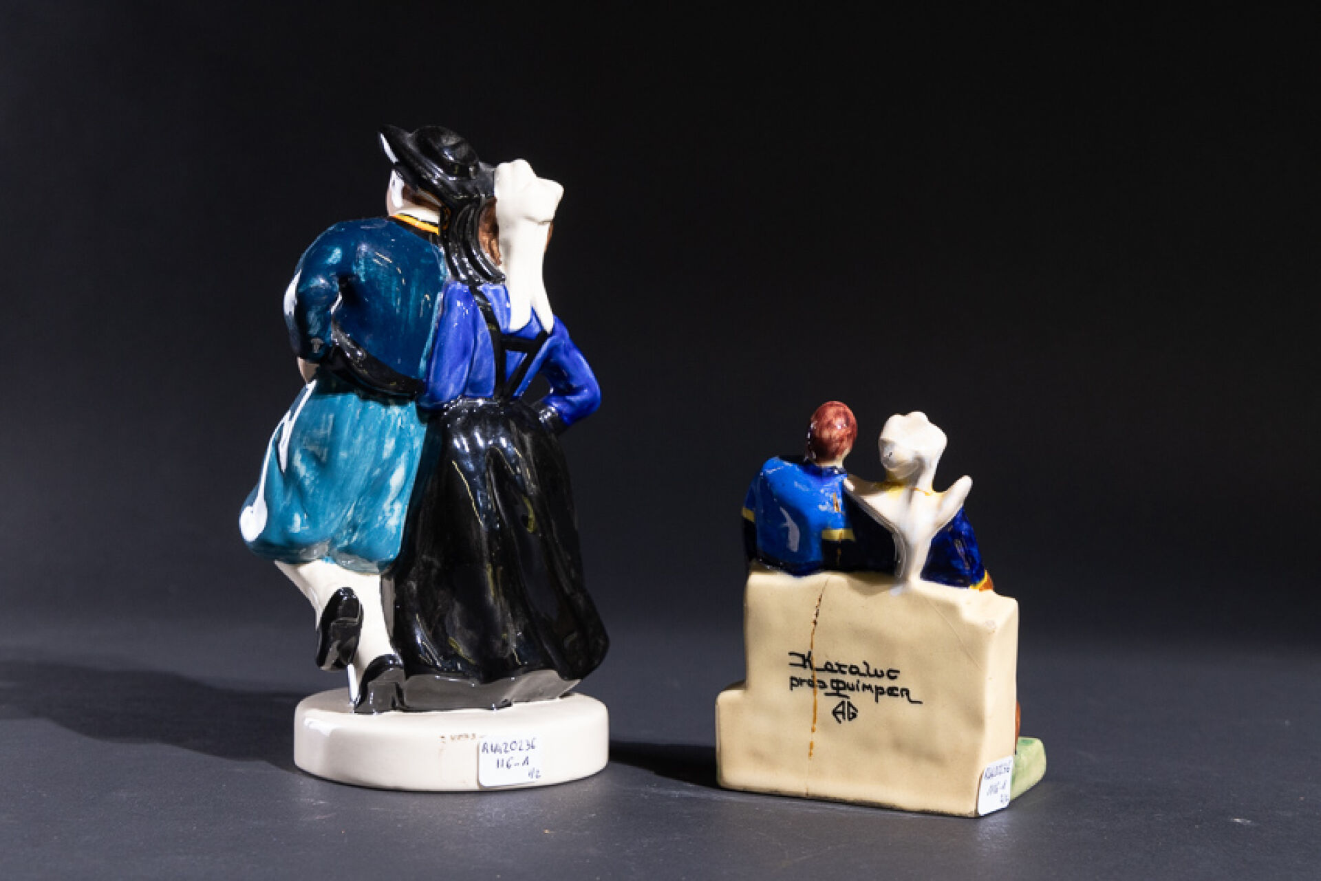 Ecole du XXe siècle. Couple de bretons dansant en faïence polychrome marqué sous la base PIERRICK. Haut. : 22,5 cm - Diam. base : 10 cm. Keraluc Quimper AG Couple de bretons adossé en faïence polychrome (fêles, cassé, restauré). Haut. : 13 cm - Larg. base : 9 cm.