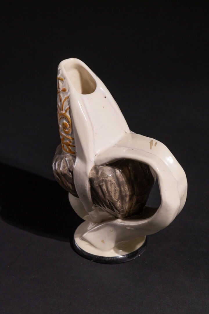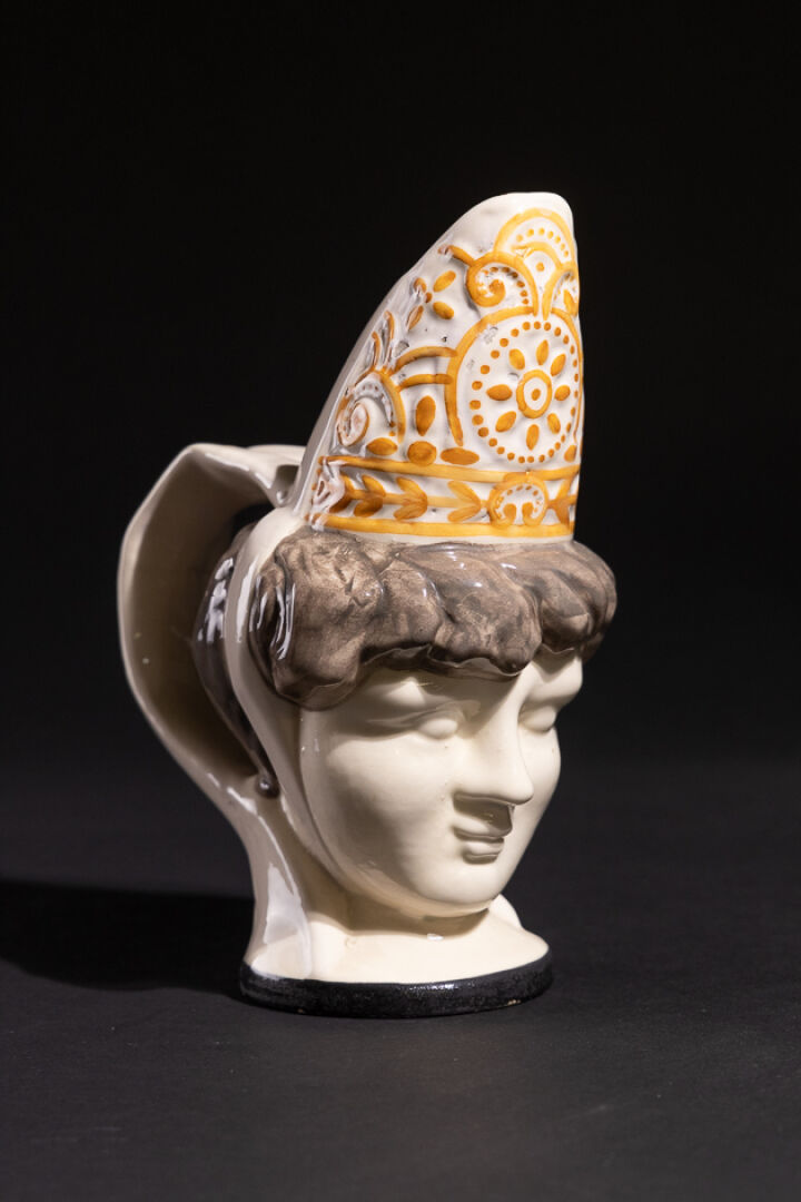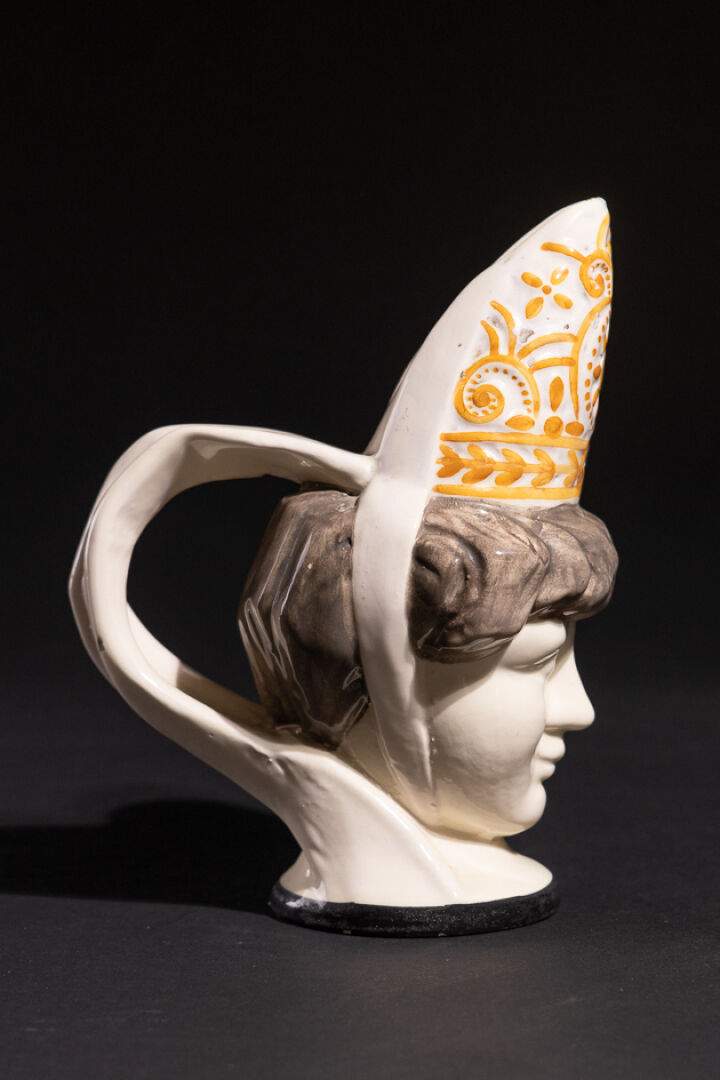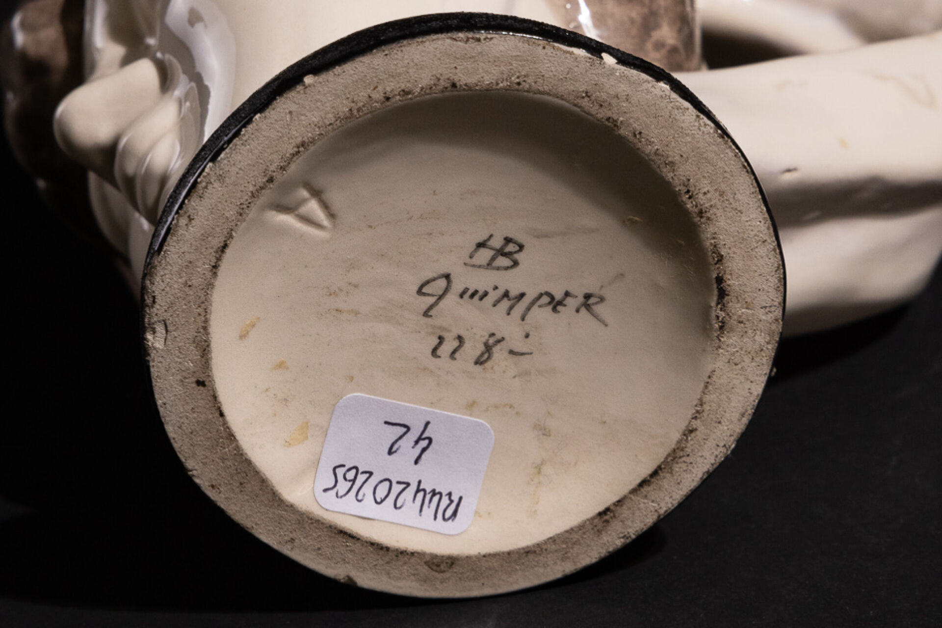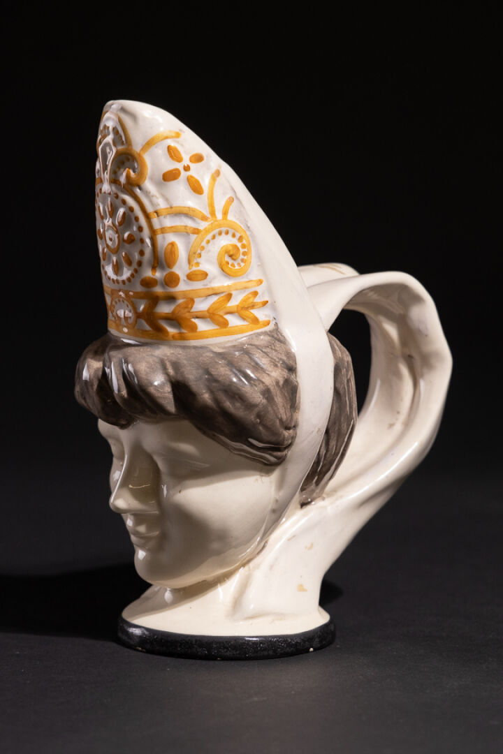 Manufacture HB QUIMPER Pichet anthropomorphe figurant une bretonne à la coiffe, en faïence émaillée (défauts de cuisson). Haut. : 20 cm.