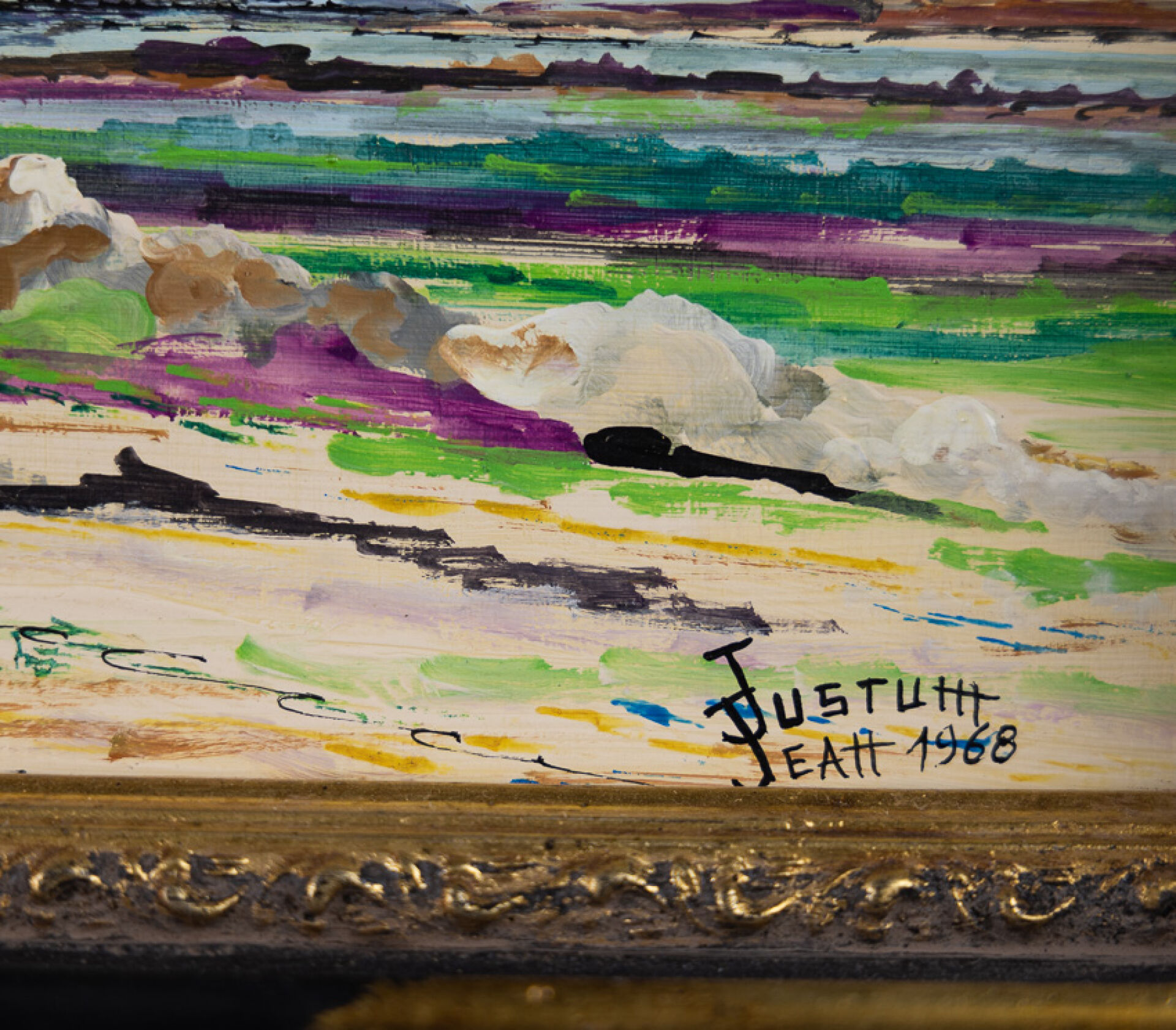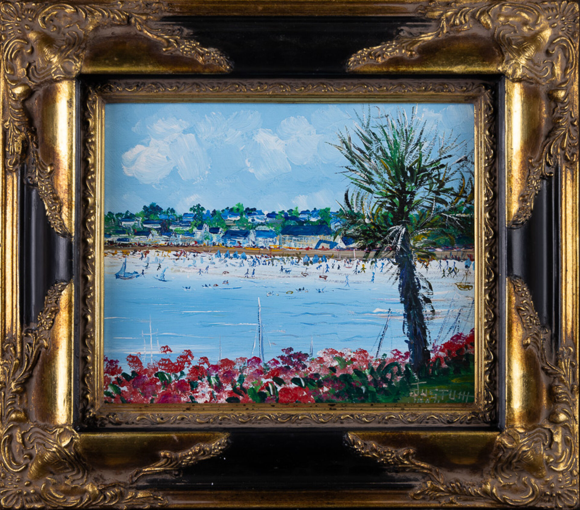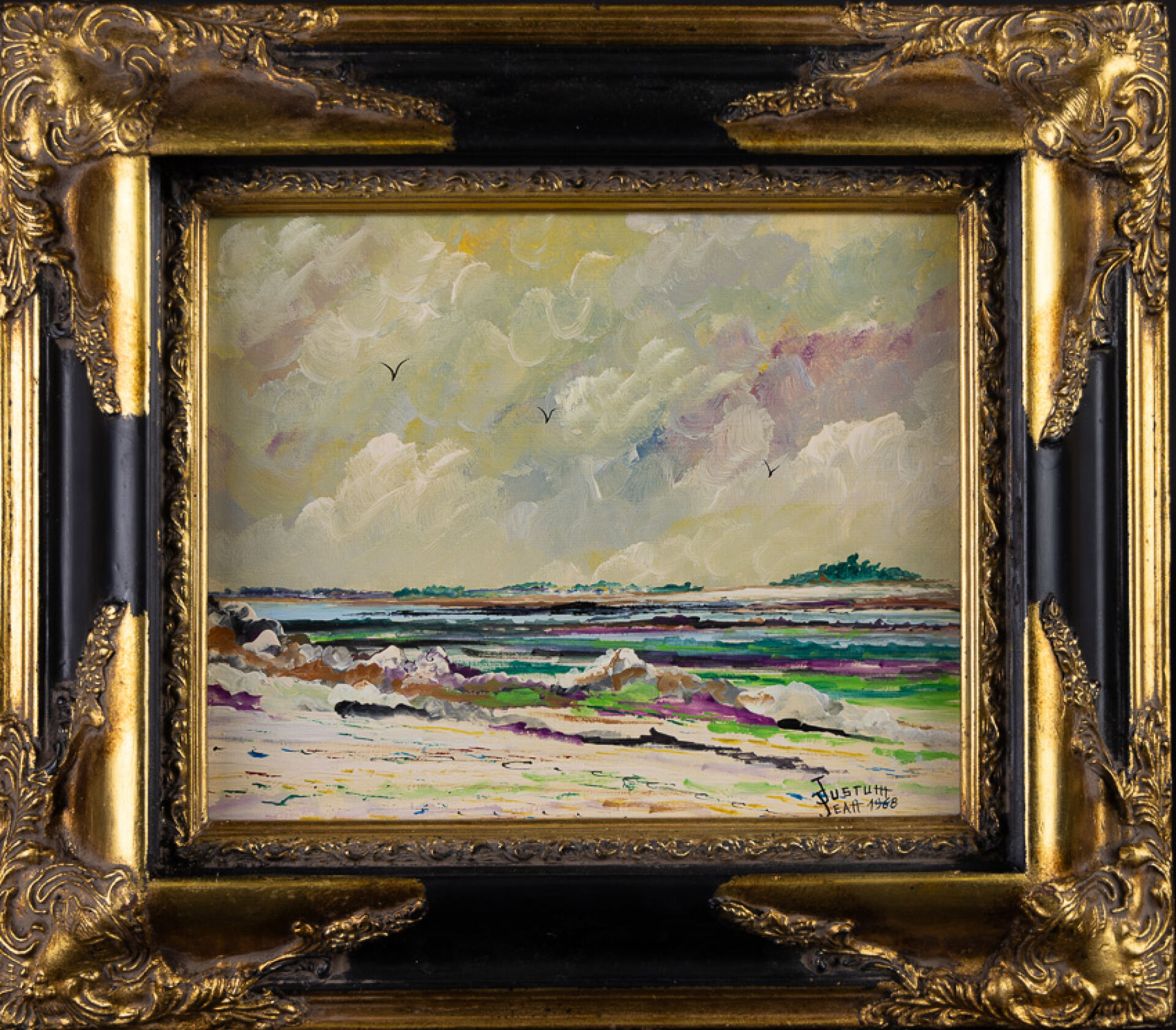 Jean JUSTUM (né en 1946). Six huiles sur panneau figurant principalement des paysages de bord de mer, paysage breton, bouquet de fleurs. Dim. moyennes : Haut. : 22cm - Larg. : 27 cm