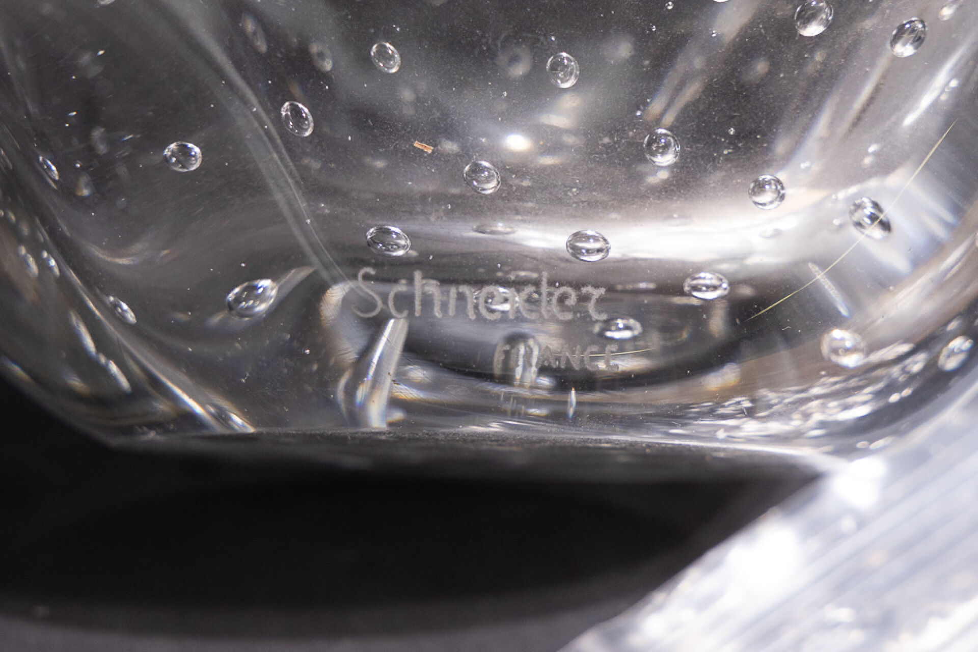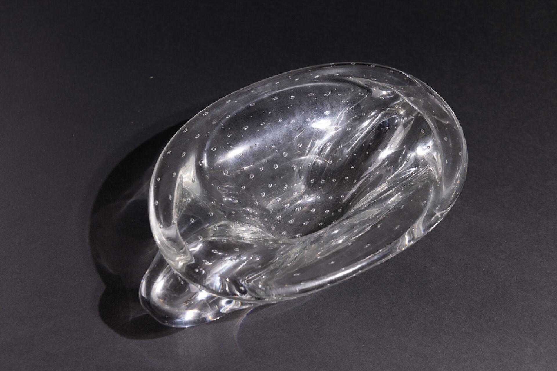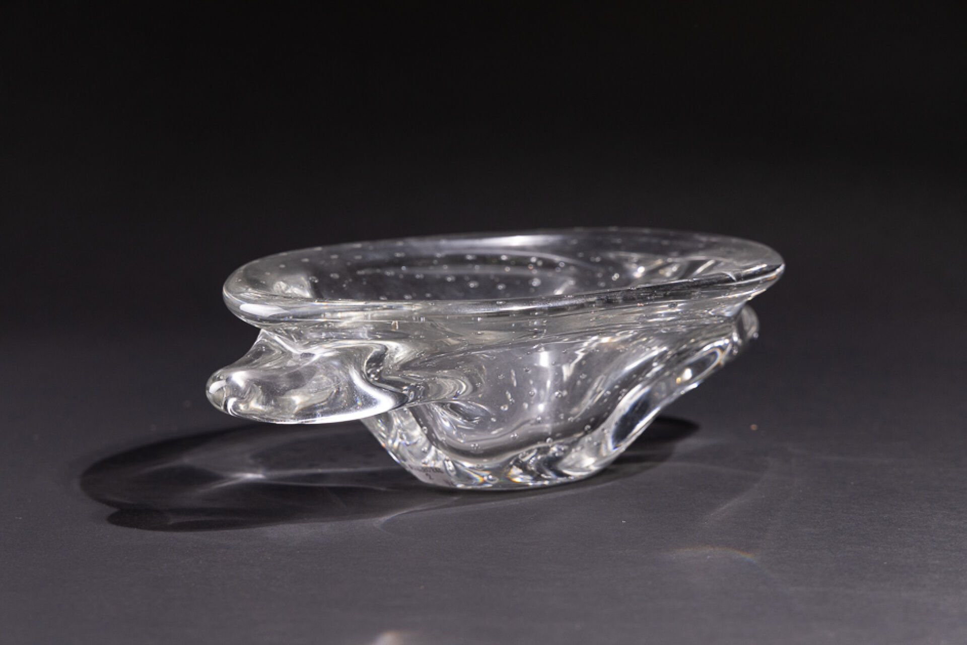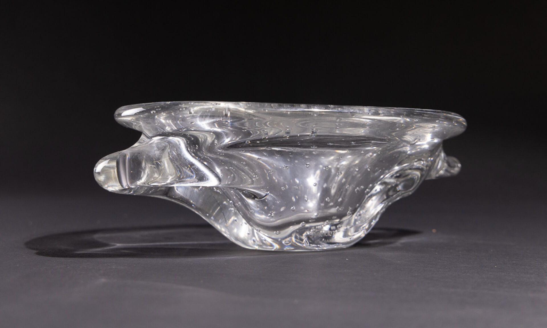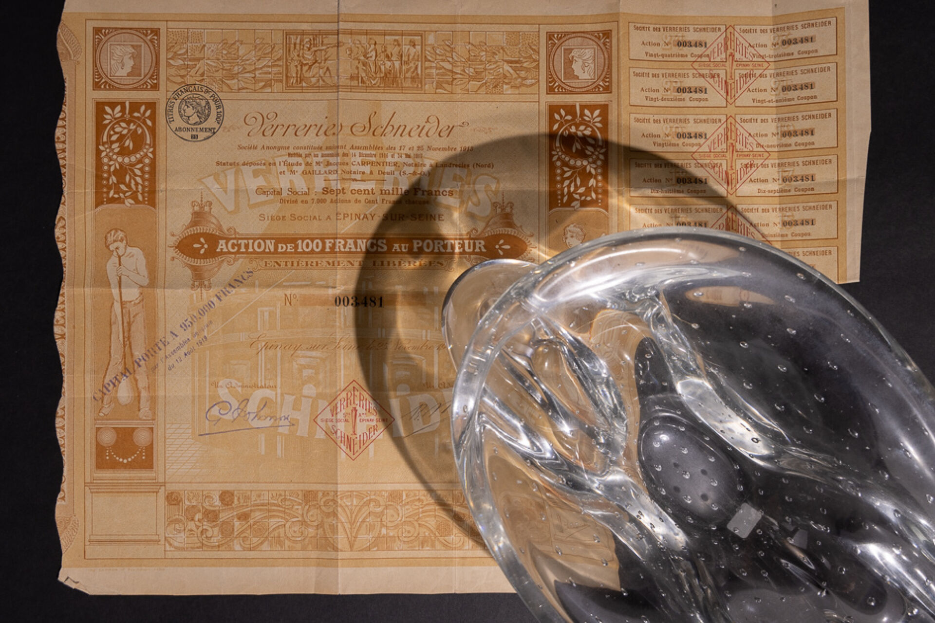 SCHNEIDER FRANCE. Coupe en cristal bullé à anses (petites rayures d'usage). Signée. Haut. : 10 cm - Larg. : 32 cm - Prof. : 21 cm On joint : Action de 100 francs bon porteur de la VERRERIE SCHNEIDER n 3.481 (en l'état).