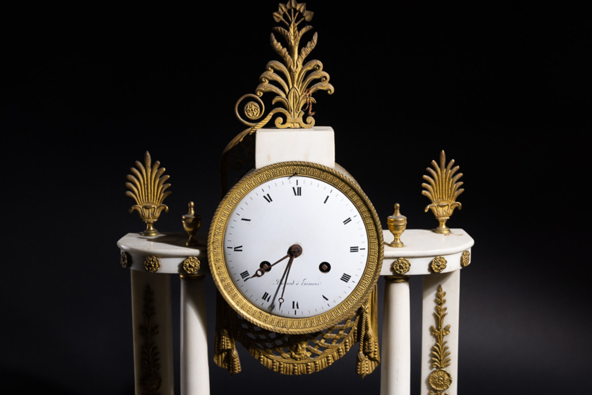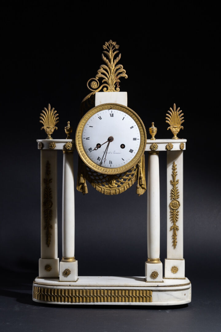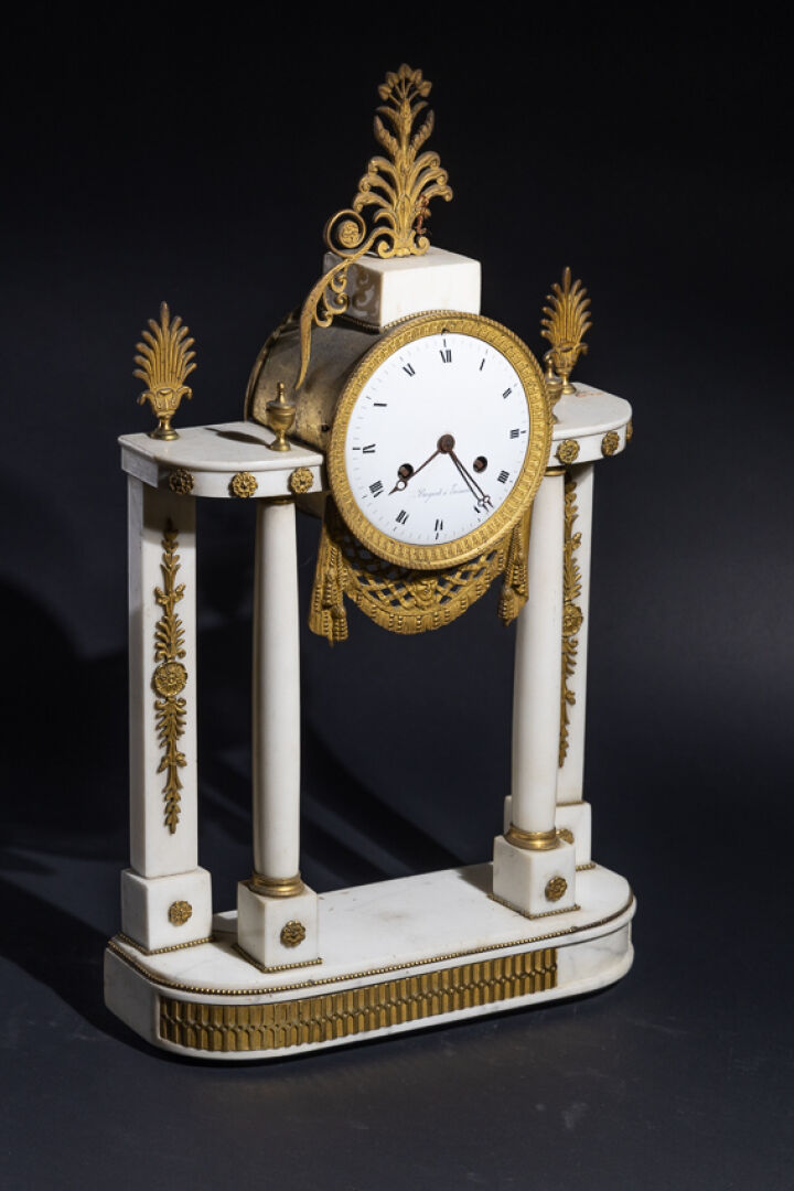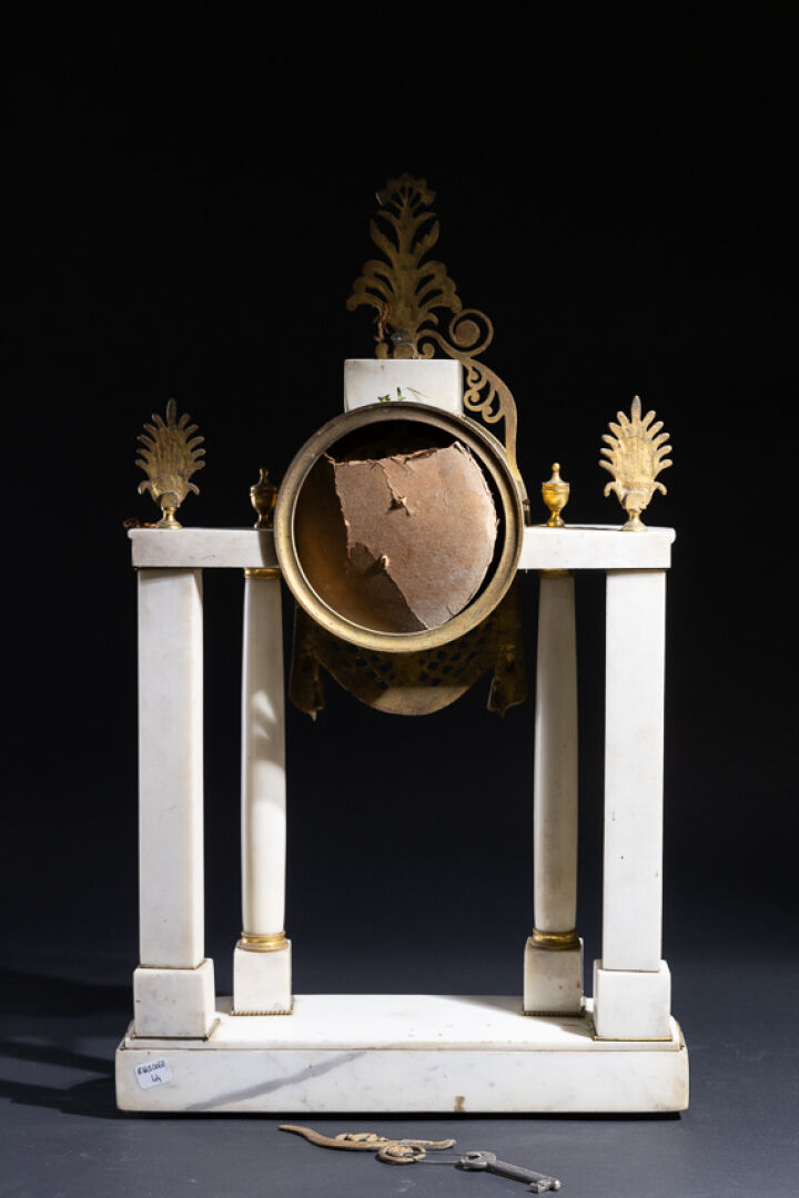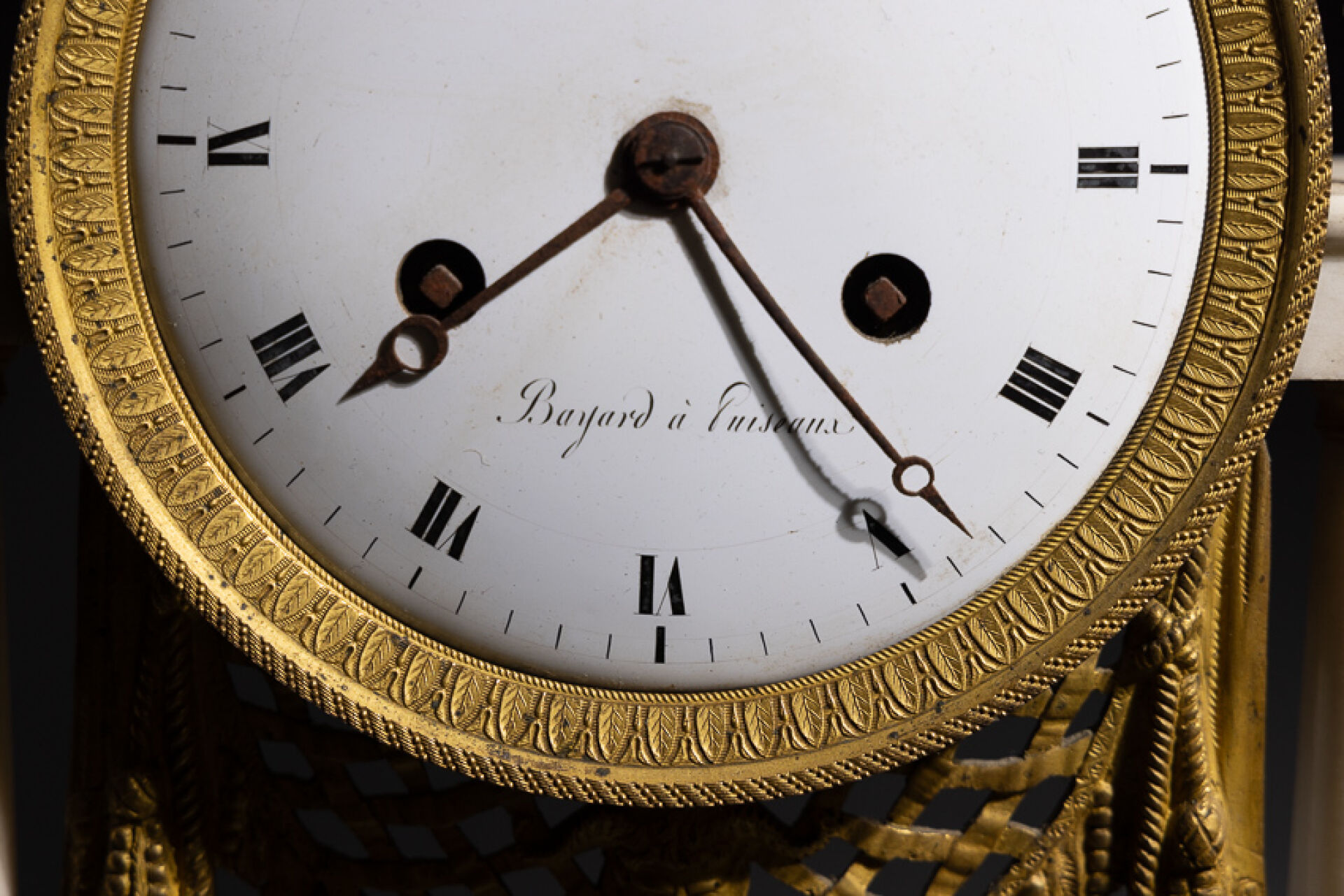 Pendule portique en marbre blanc et bronze doré, mouvement circulaire et cadran émaillé blanc à chiffres romains signé BAYARD à PUISEAUX, décor en bronze de fleurettes, frises de perles, frise d'oves, pots à feu et draperie ajourée ornée d'un mascaron (manques dont les pieds et accidents). Epoque Louis XVI. Haut. : 62 cm - Larg. : 37 cm.