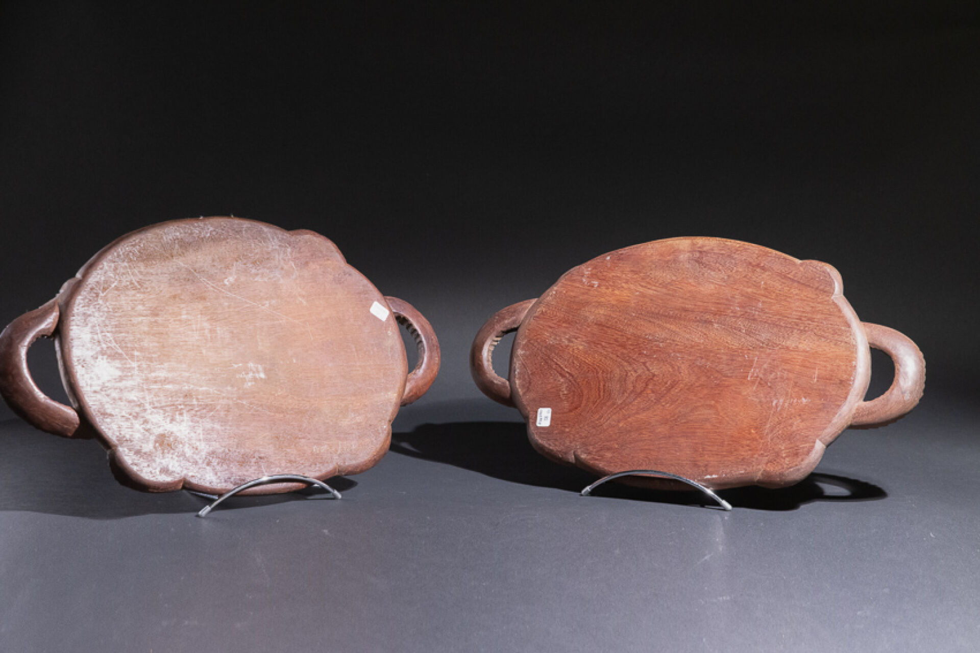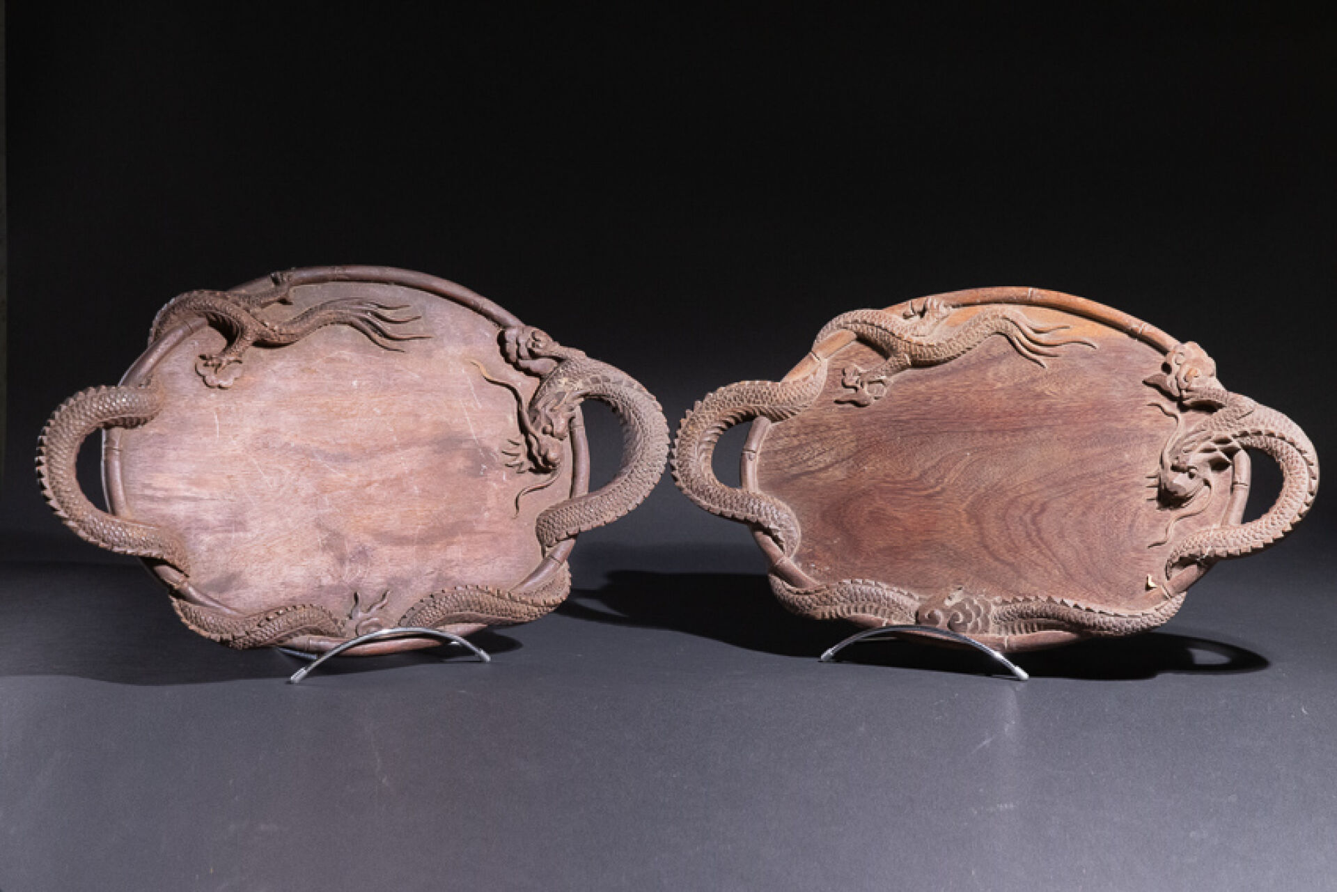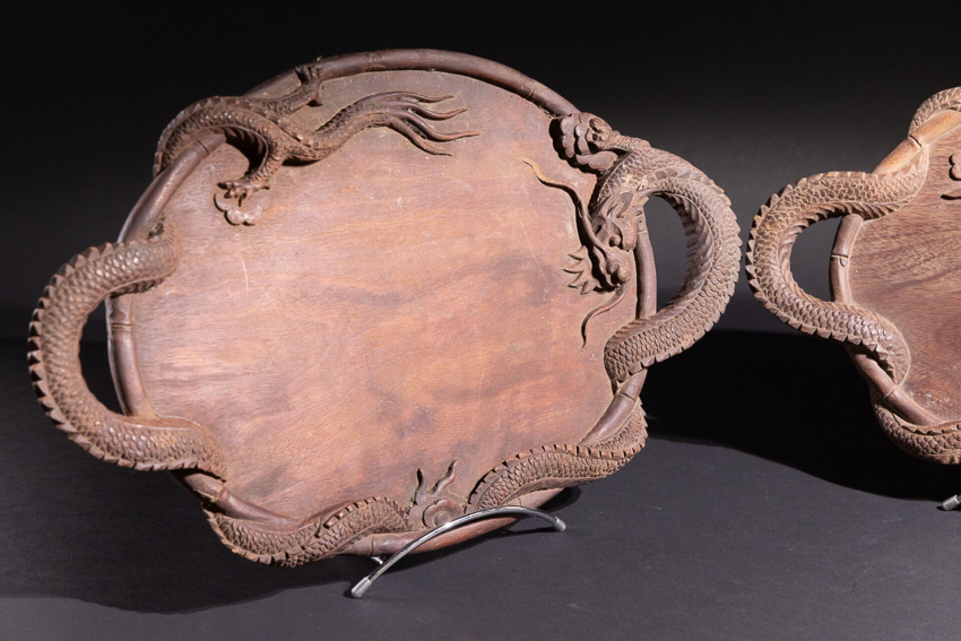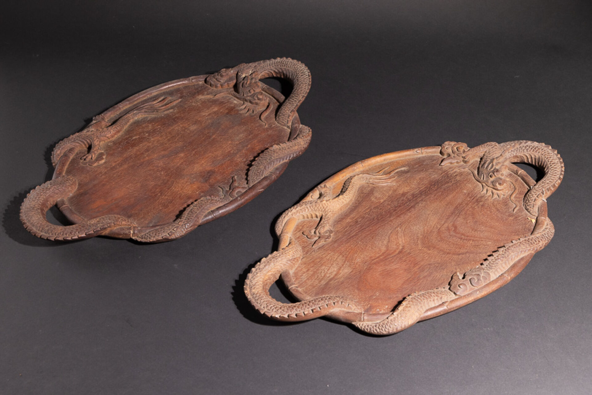 Deux plateaux en bois exotiques oblongs, les anses formées par un dragon rampant. Indochine, XXe siècle. Larg. : 56 cm - Prof. : : 32 cm