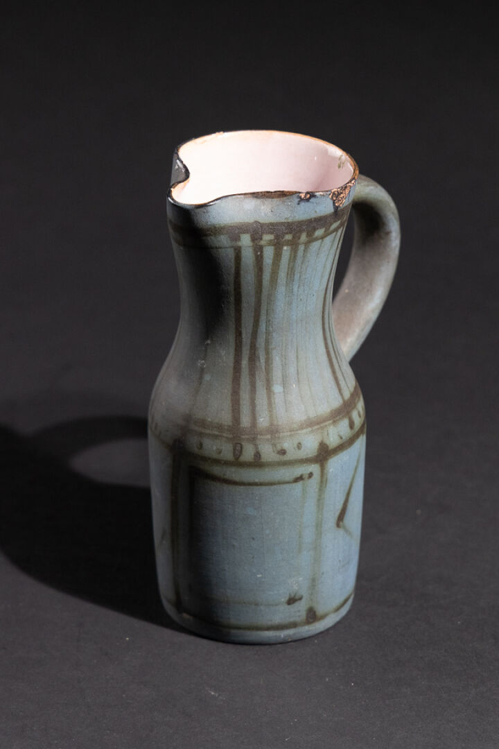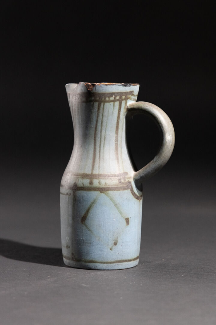 Jacques INNOCENTI (1926-1958). Petit broc en faïence polychrome décor géométrique noir sur fond bleu (petits éclats et petite restauration au col). Monogrammé au revers. Haut. : 17 cm