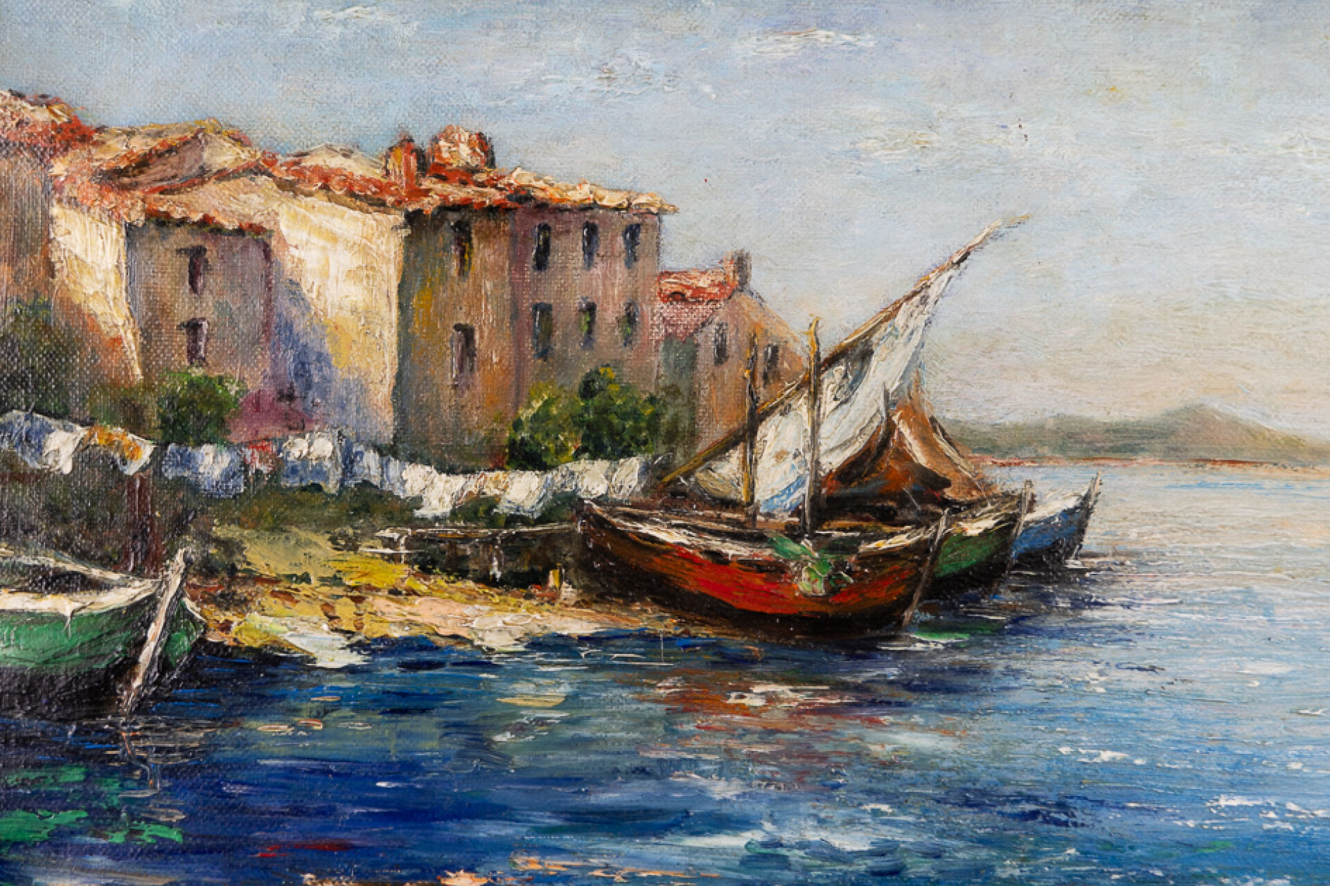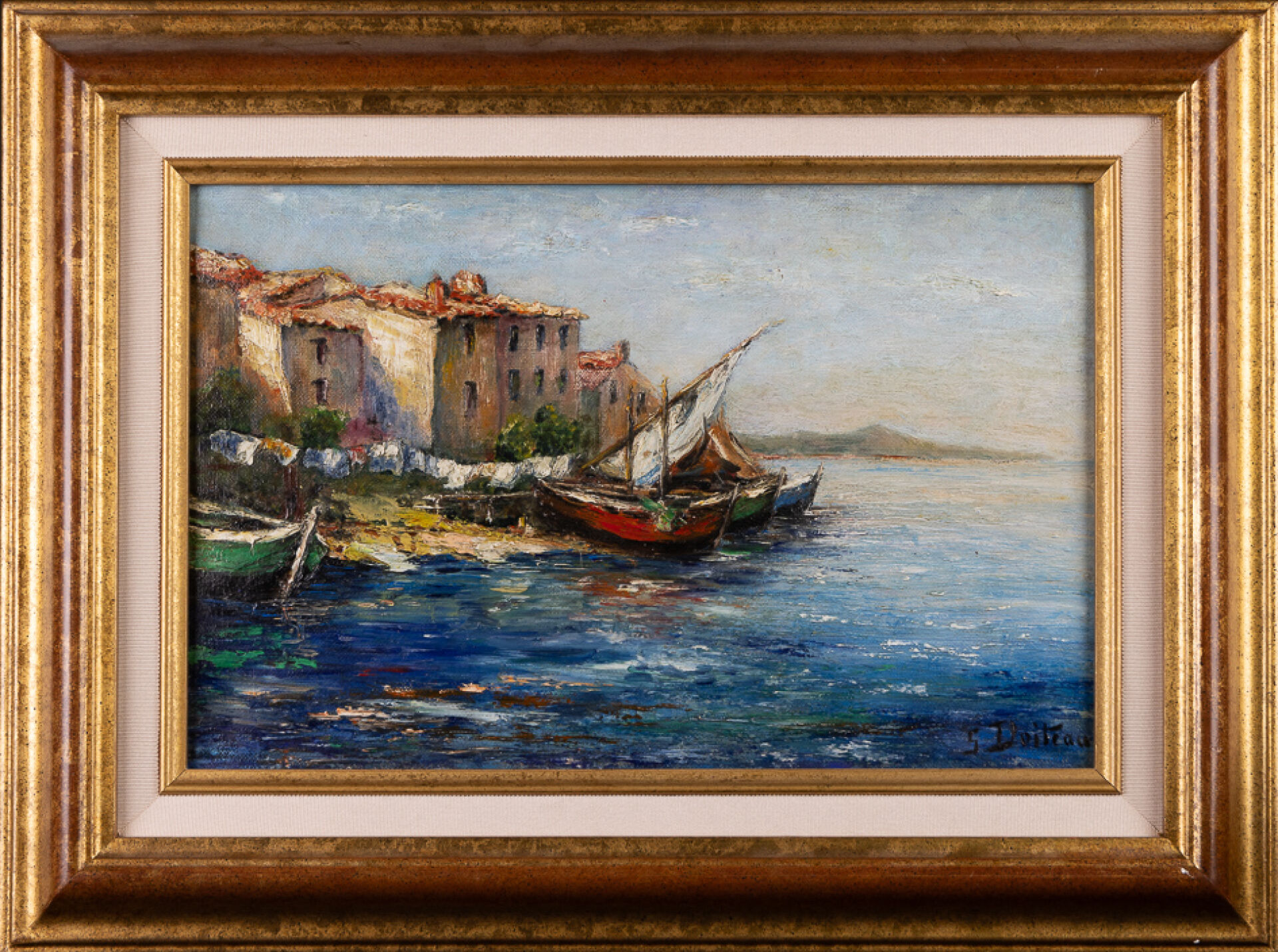 Ecole française du XXe siècle. Petit port de pêche en Méditerranée. Huile sur toile signée en bas à droite S. DOITEAU. Haut. : 27 cm - Larg. : 41 cm