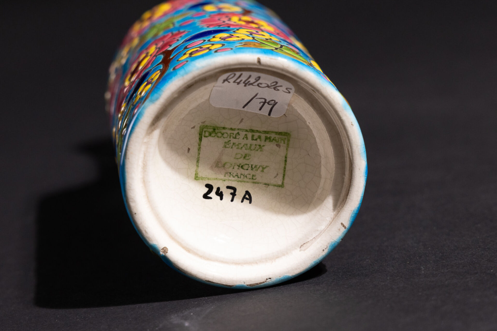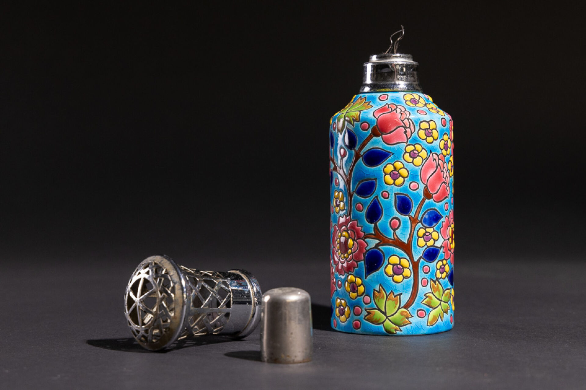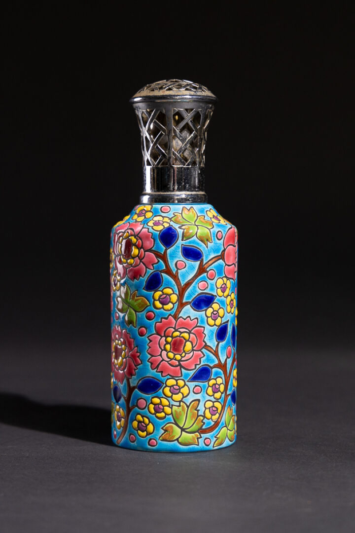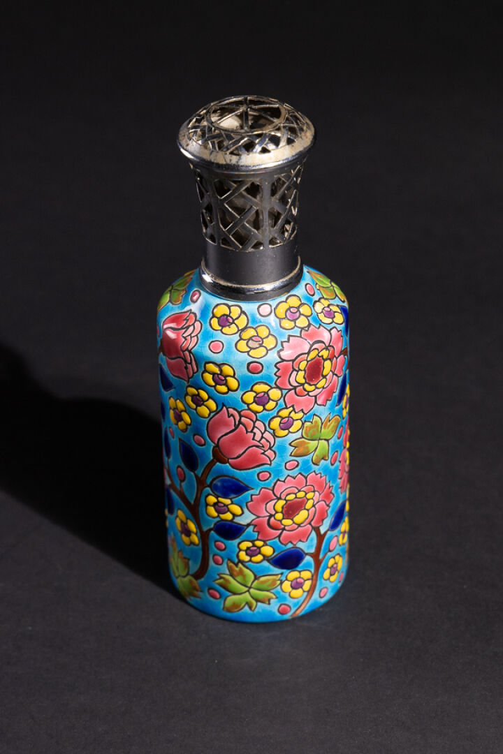 Manufacture de LONGWY Diffuseur dans le goût des lampes Berger en faïence émaillée polychrome à décor de fleurs sur fond bleu, tampon sous la base. Haut. : 20 cm