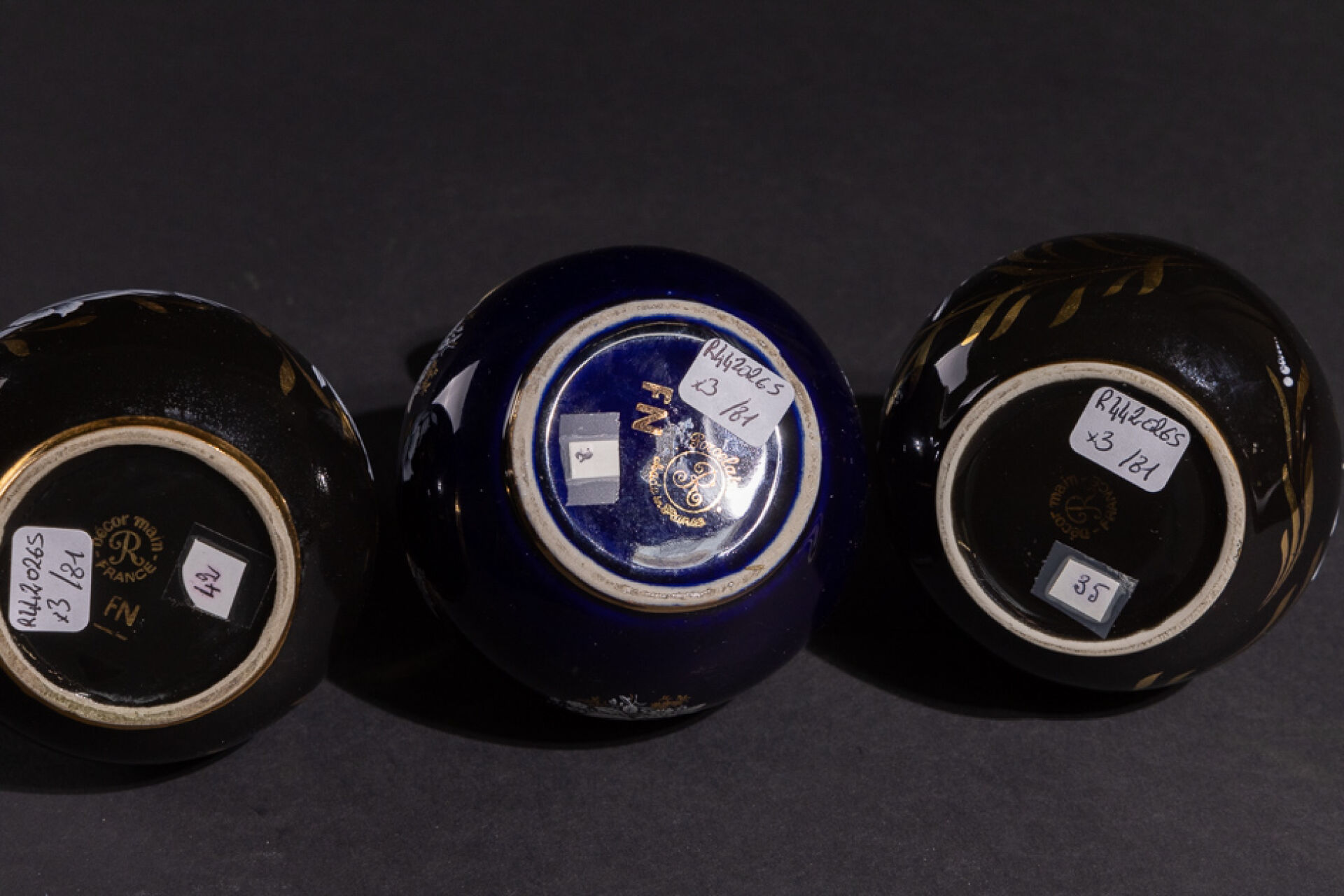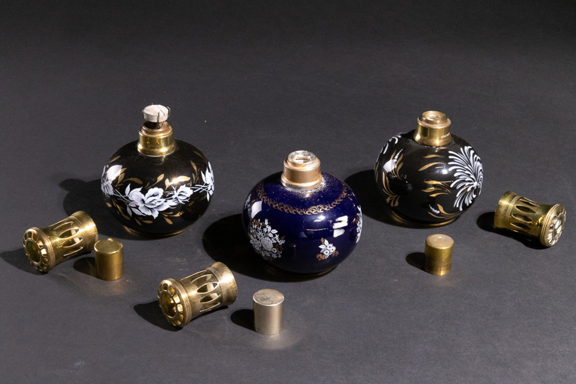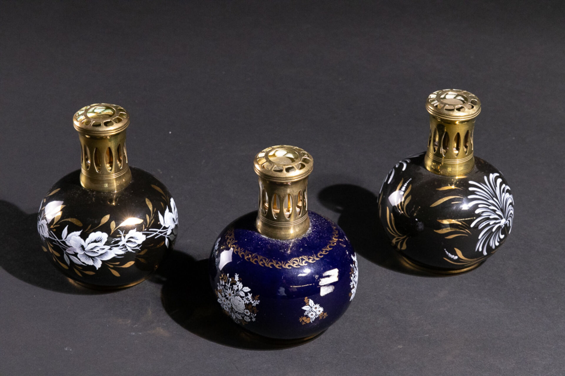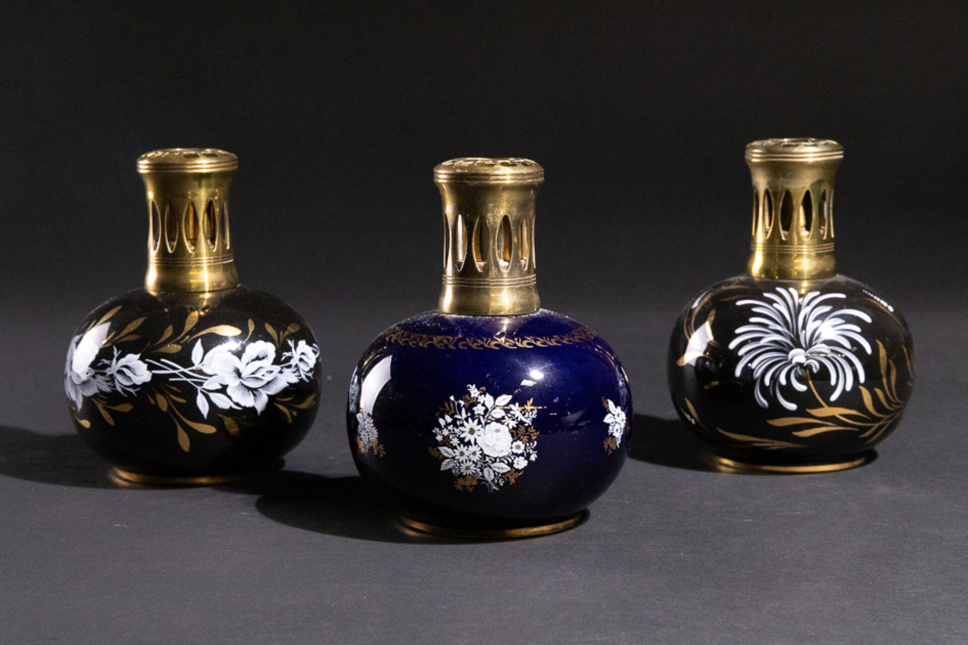 Maison REVOL Réunion de trois lampes Berger en porcelaine émaillée de fleurs en blanc et or sur fond noir ou bleu, tampon sous la base (deux brûleurs manquants). Haut. : 14 cm