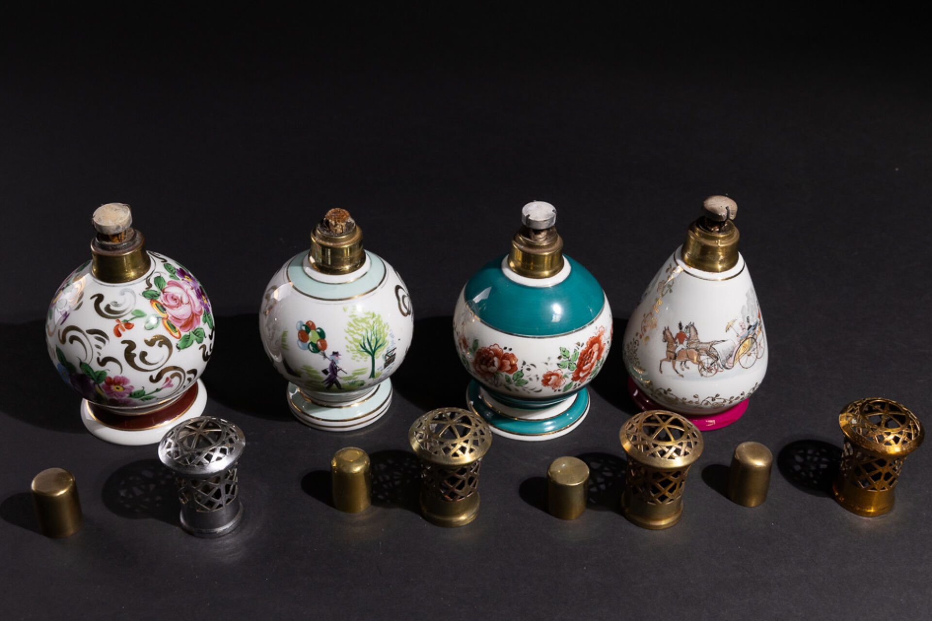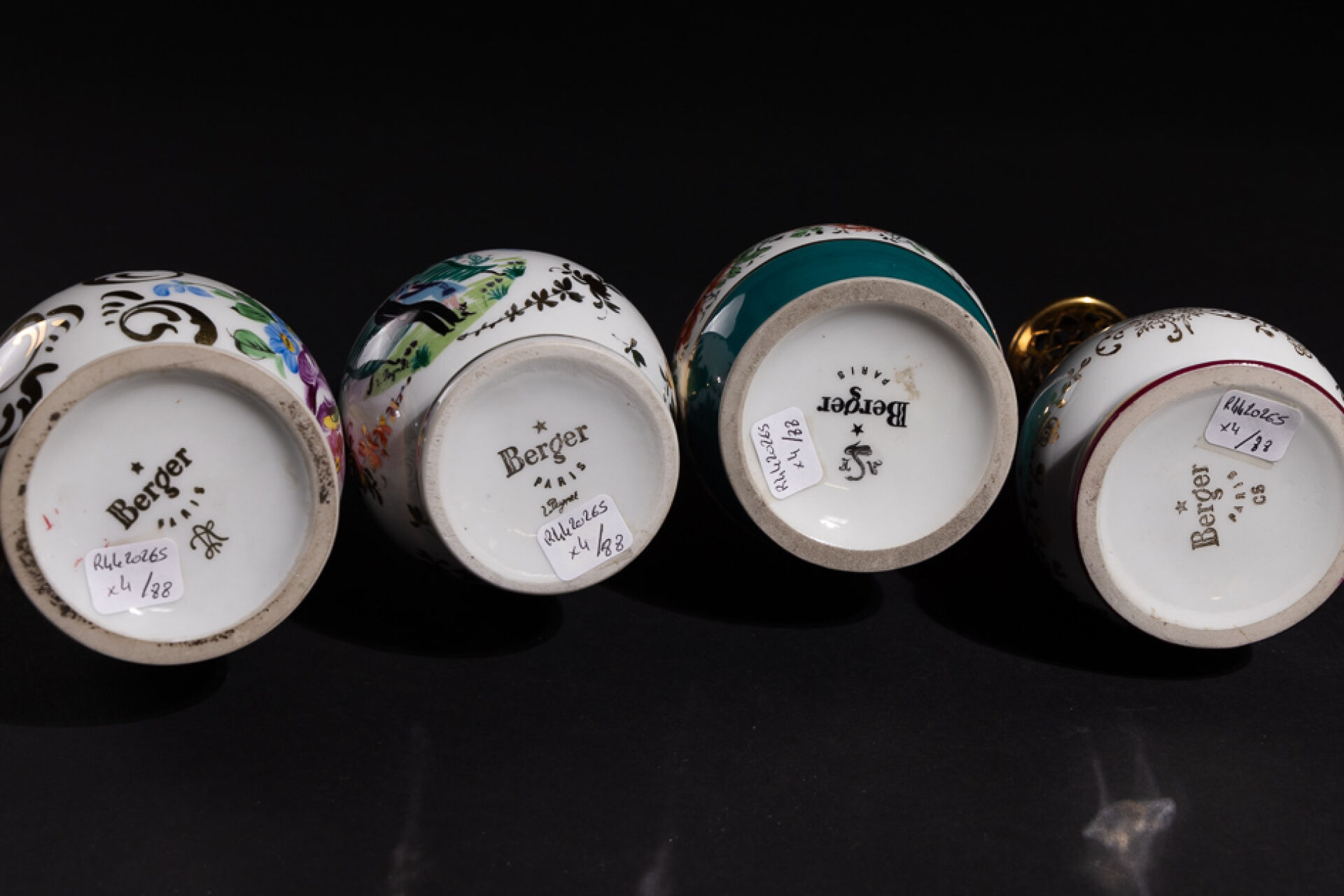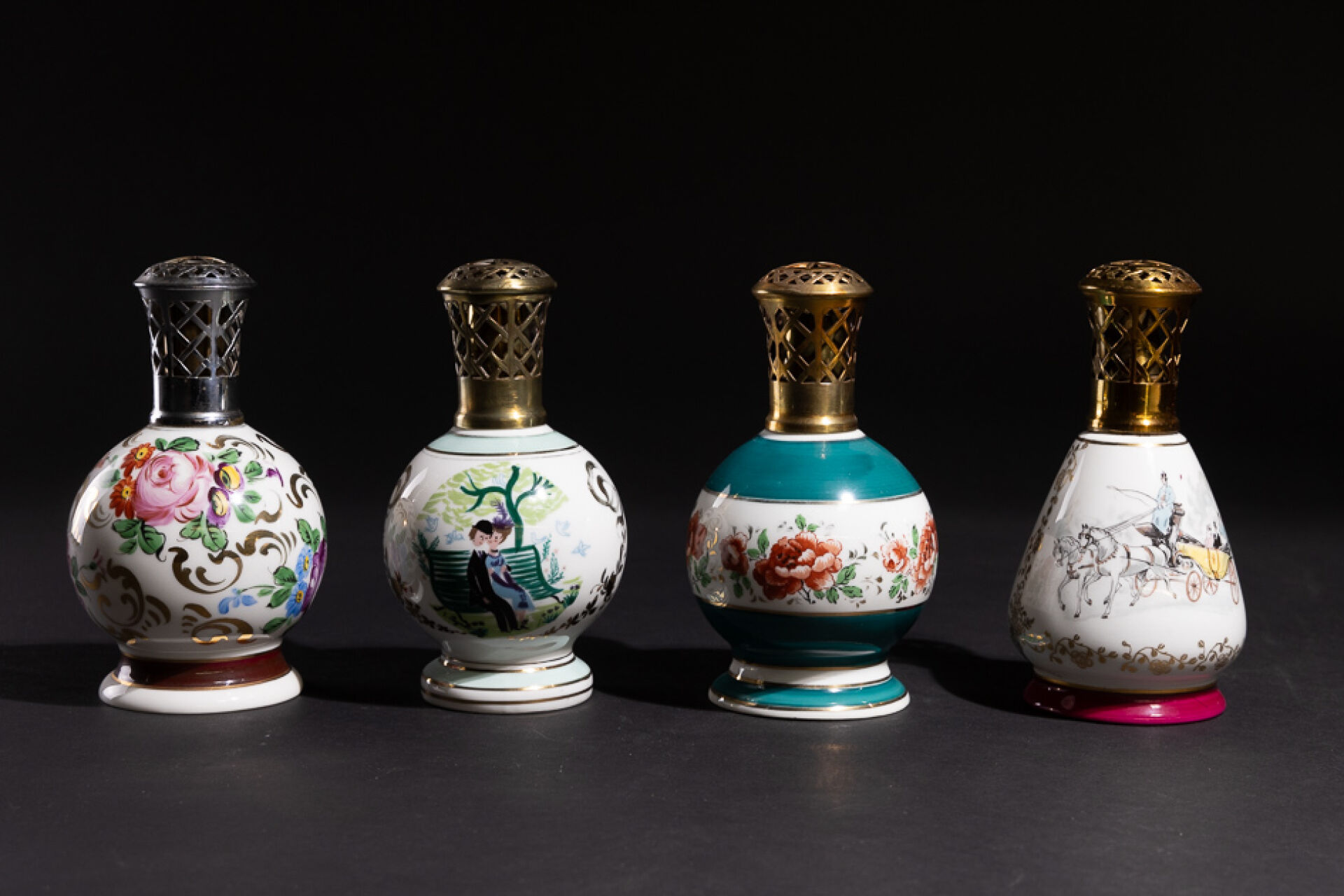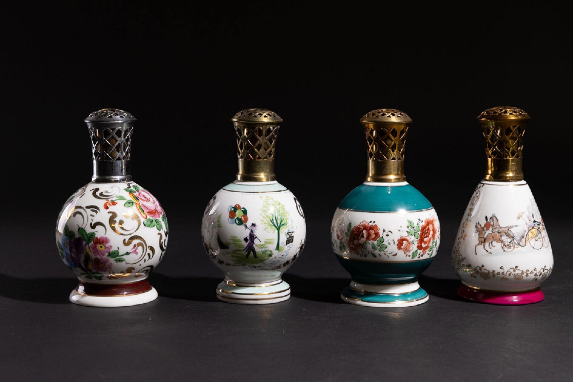 Maison BERGER Réunion de quatre lampes Berger en porcelaine à décor polychrome de fleurs, scènes de villes et oeuvres de Peynet, marquées BERGER PARIS sous la base. Haut. : 18 cm