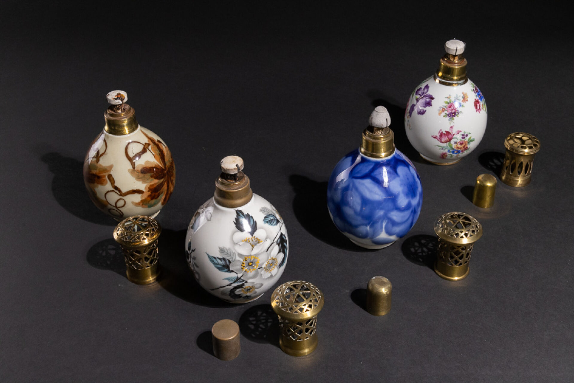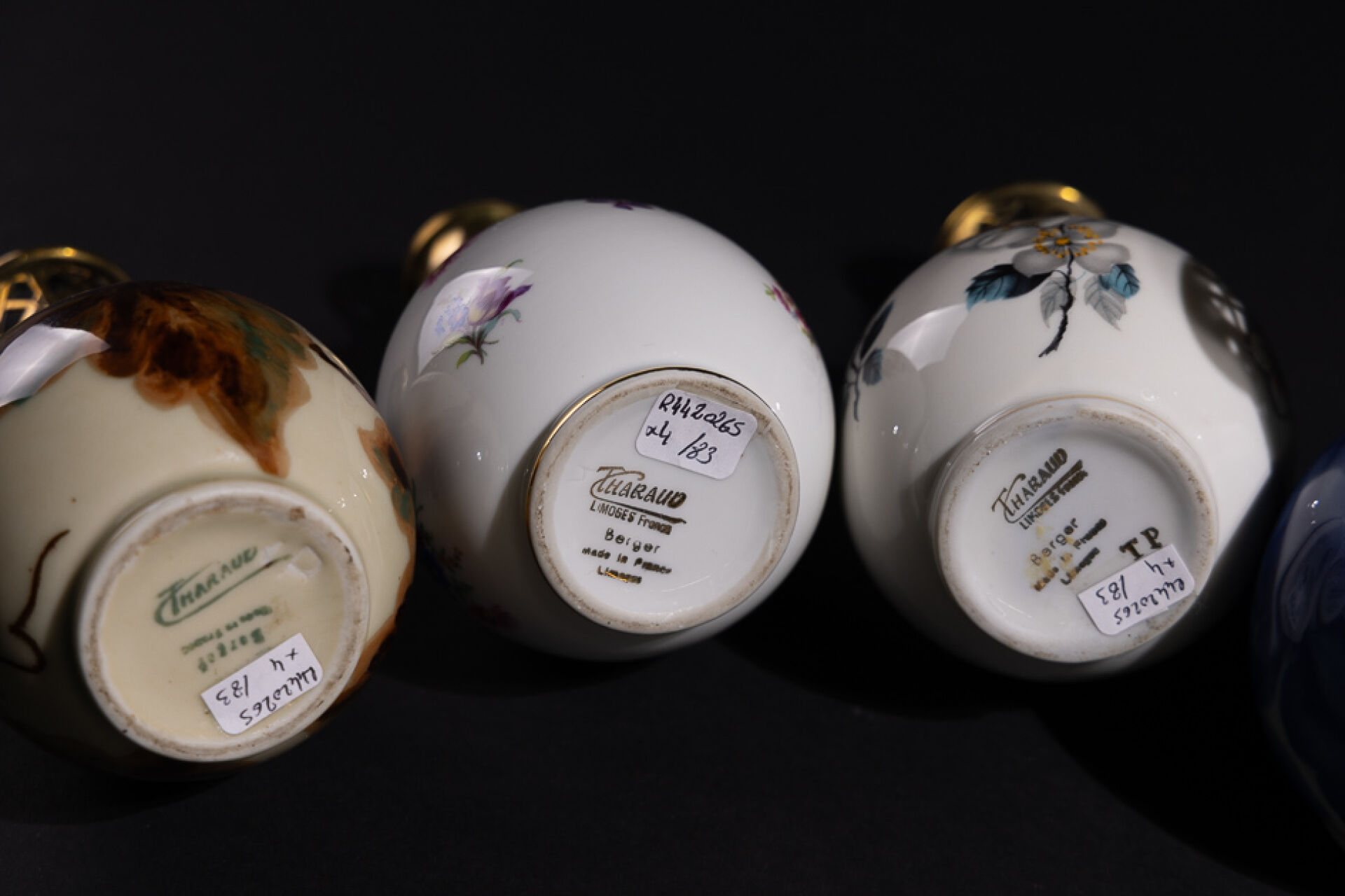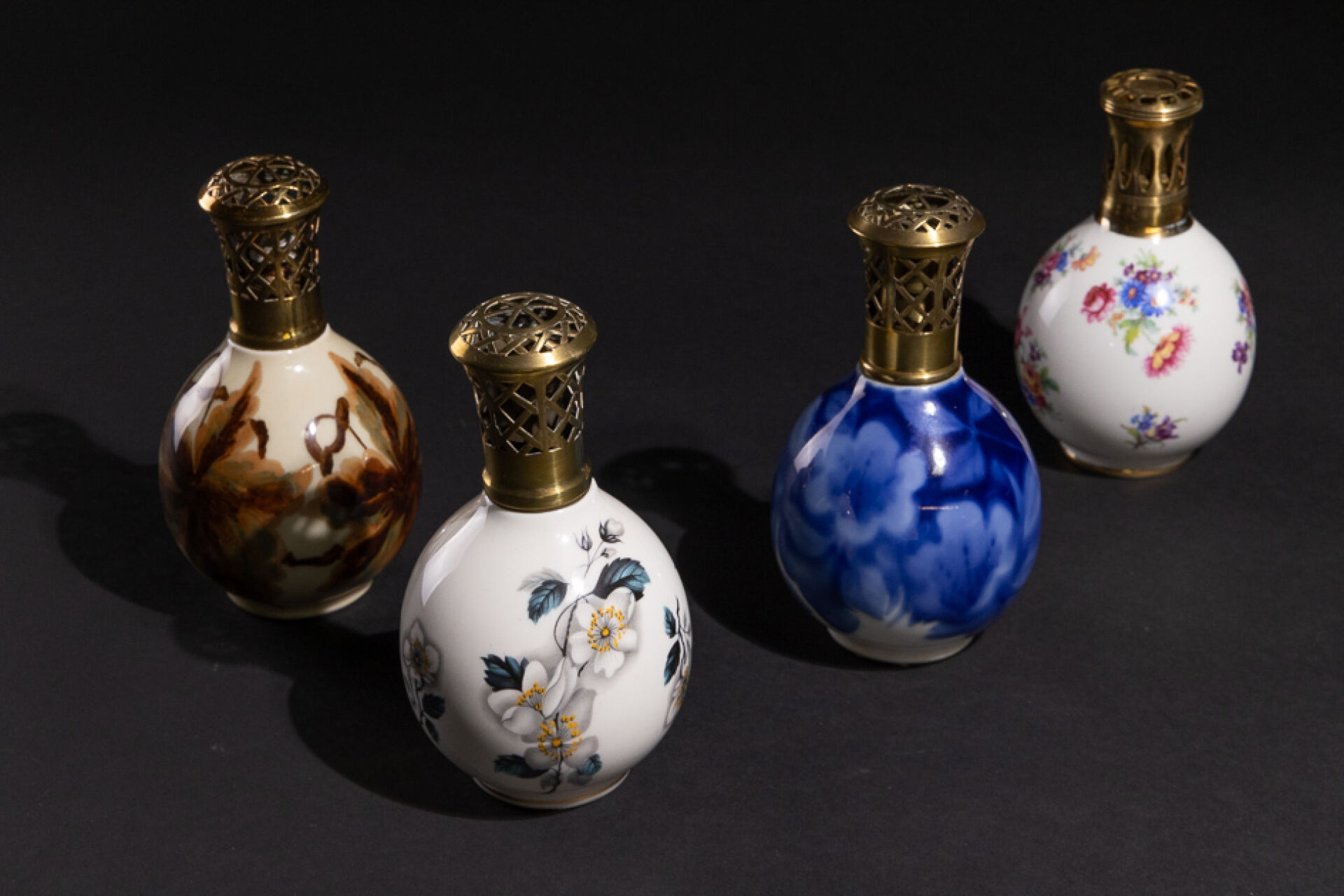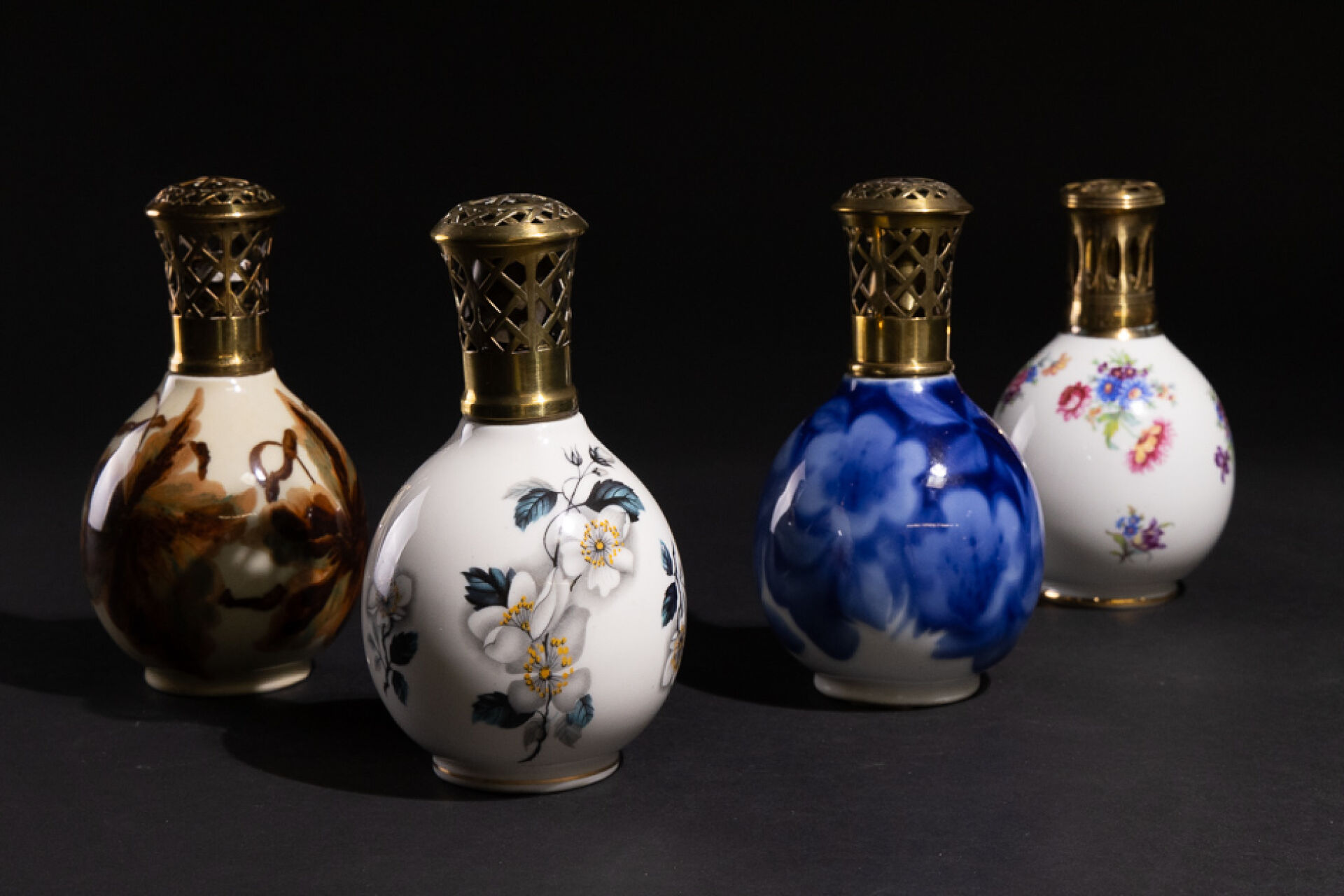 THARAUD à LIMOGES Réunion de quatre lampes Berger en porcelaine à décor de fleurs, marquées Tharaud et Berger sous la base (manque un bouchon). Haut. : entre 16 et 18 cm