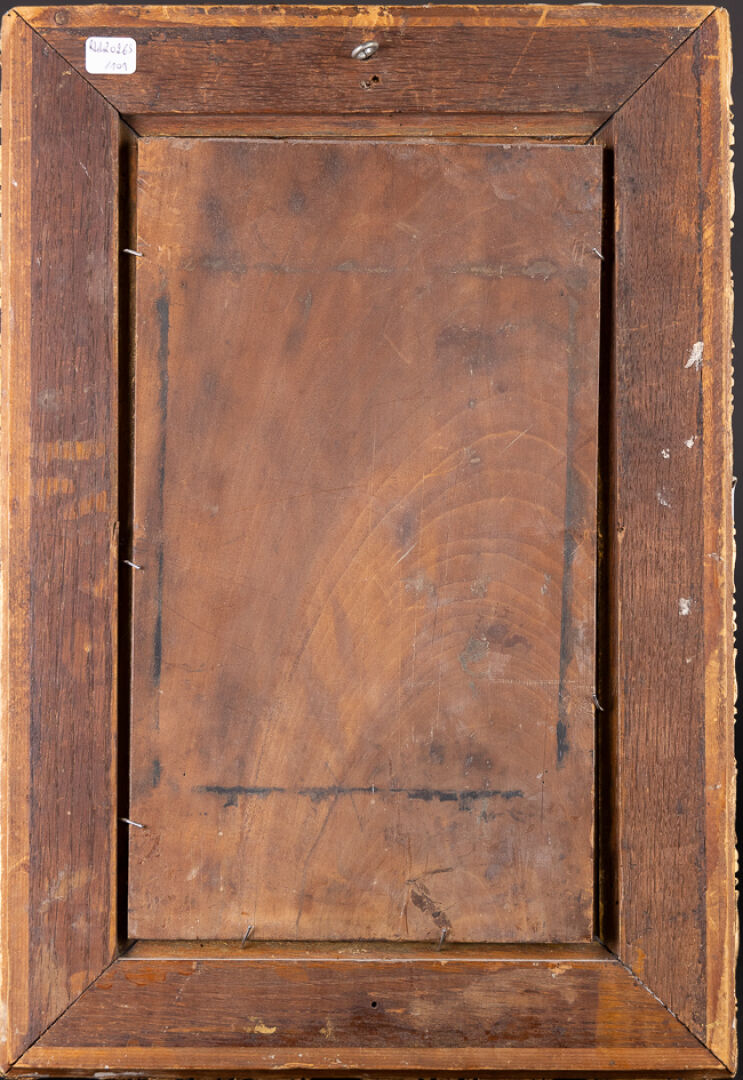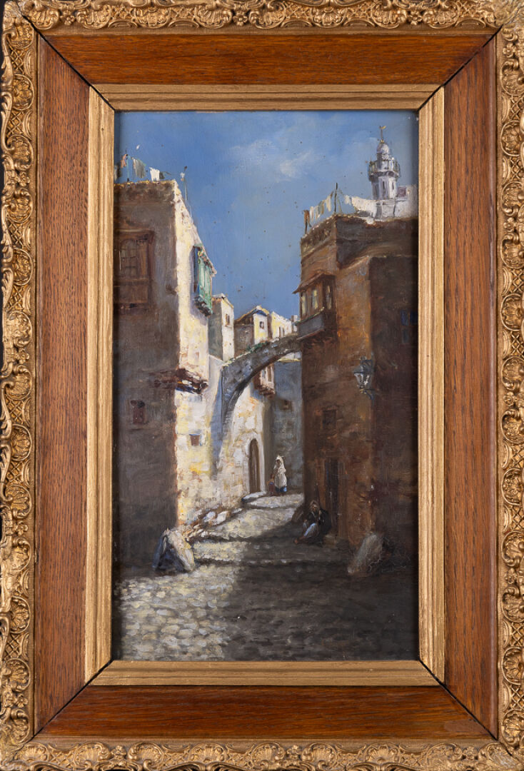 Ecole orientaliste du XXe siècle. Ruelle d'Alger animée. Huile sur panneau de bois signée en bas à droite (illisible). Haut. : 35,5 cm - Larg. : 20 cm