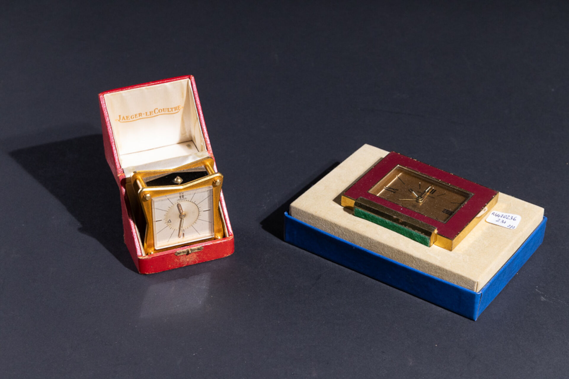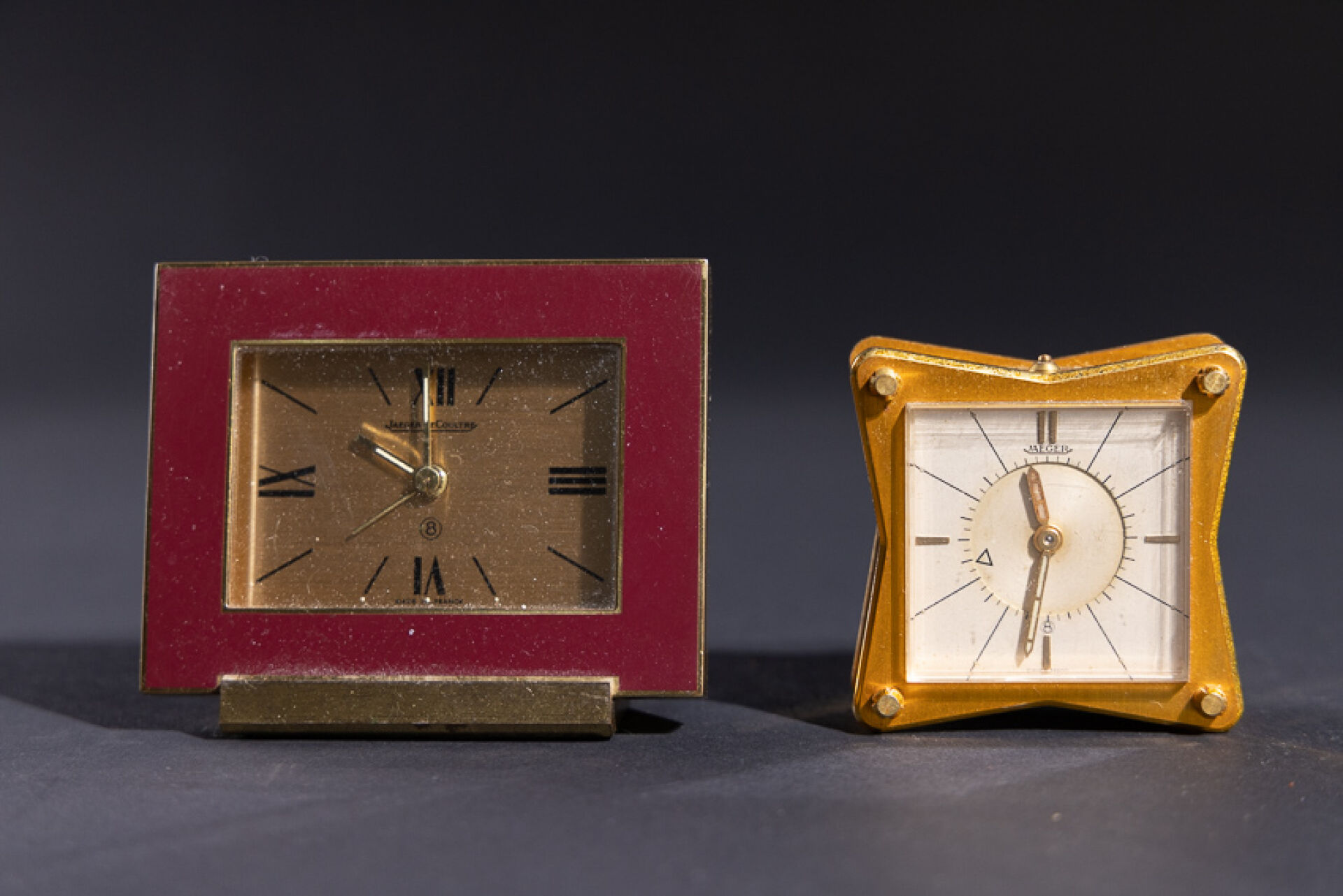 JAEGER LECOULTRE. Réveil de voyage en métal doré de forme rectangulaire à encadrement bordeaux. Boîte. Haut : 8 cm - Larg. : 9 cm On joint : JAEGER. Réveil de voyage de forme moderniste en métal doré. Boîte. Côté : 6 cm