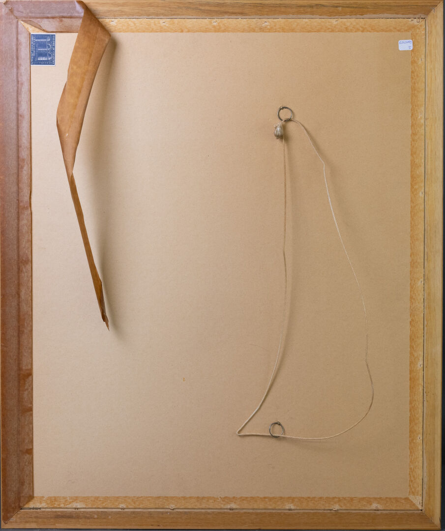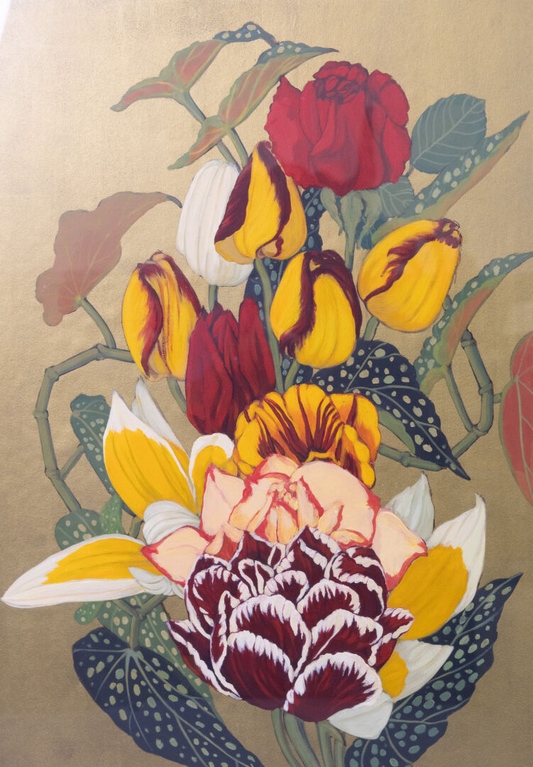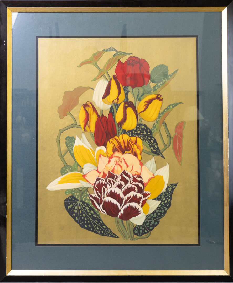 École contemporaine. Bouquet de fleurs exotiques sur fond or. Dim. à vue : Haut. : 62 cm - Larg. : 47.5 cm Étiquette de la Galerie du Chapitre à Rennes au revers.