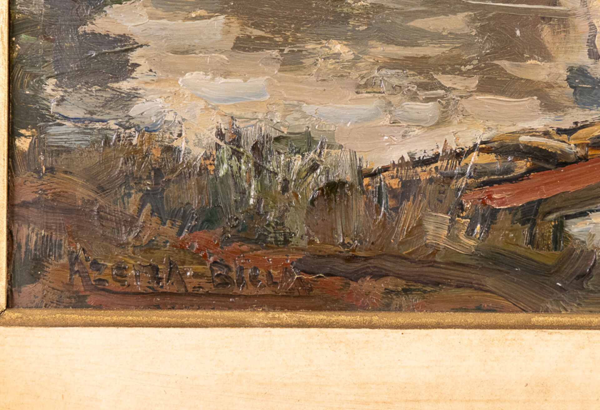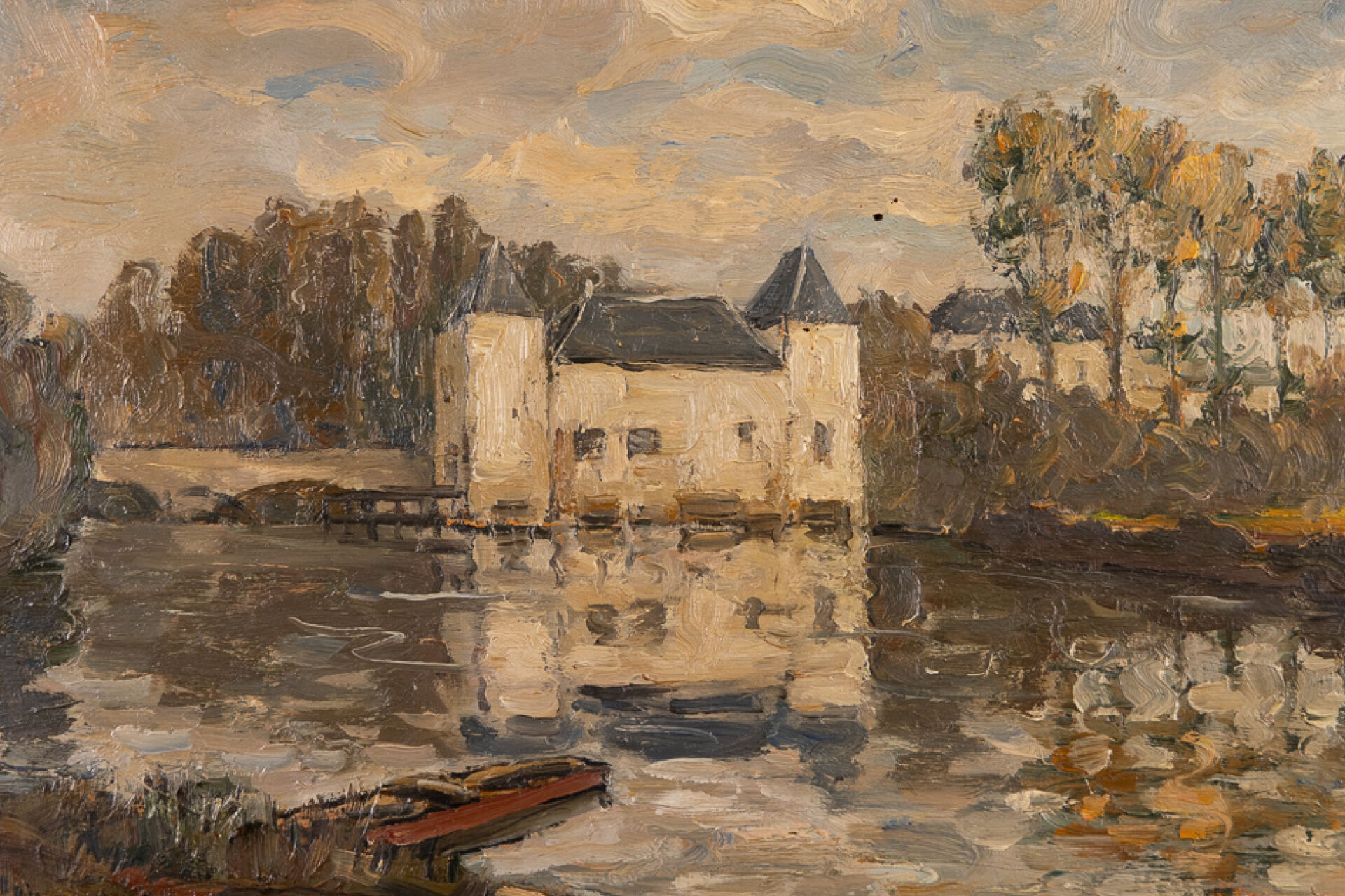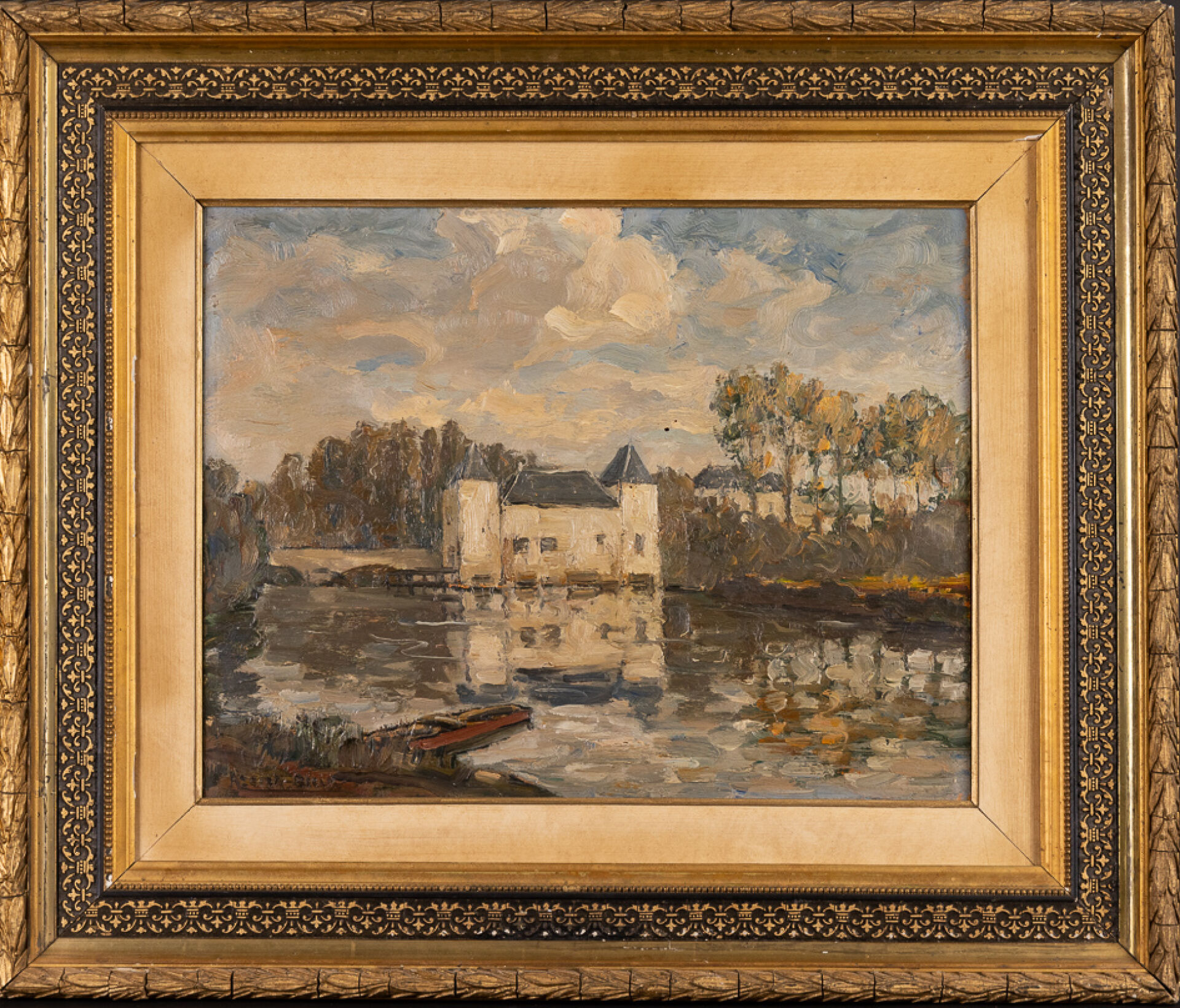 Marcel AZEMA-BILLA (1904-1999). Paysage lacustre au château. Huile sur carton signée en bas à gauche. Haut.: 40.5 cm - Larg.: 50 cm