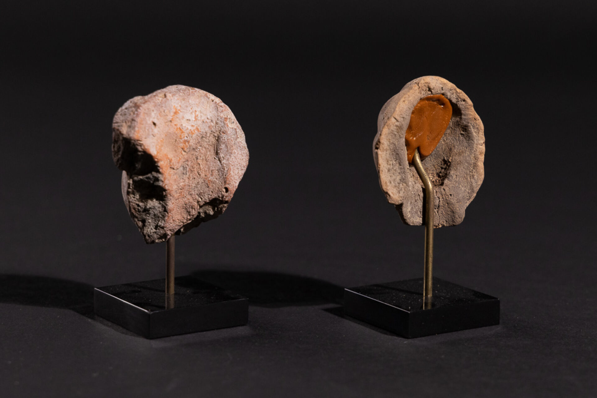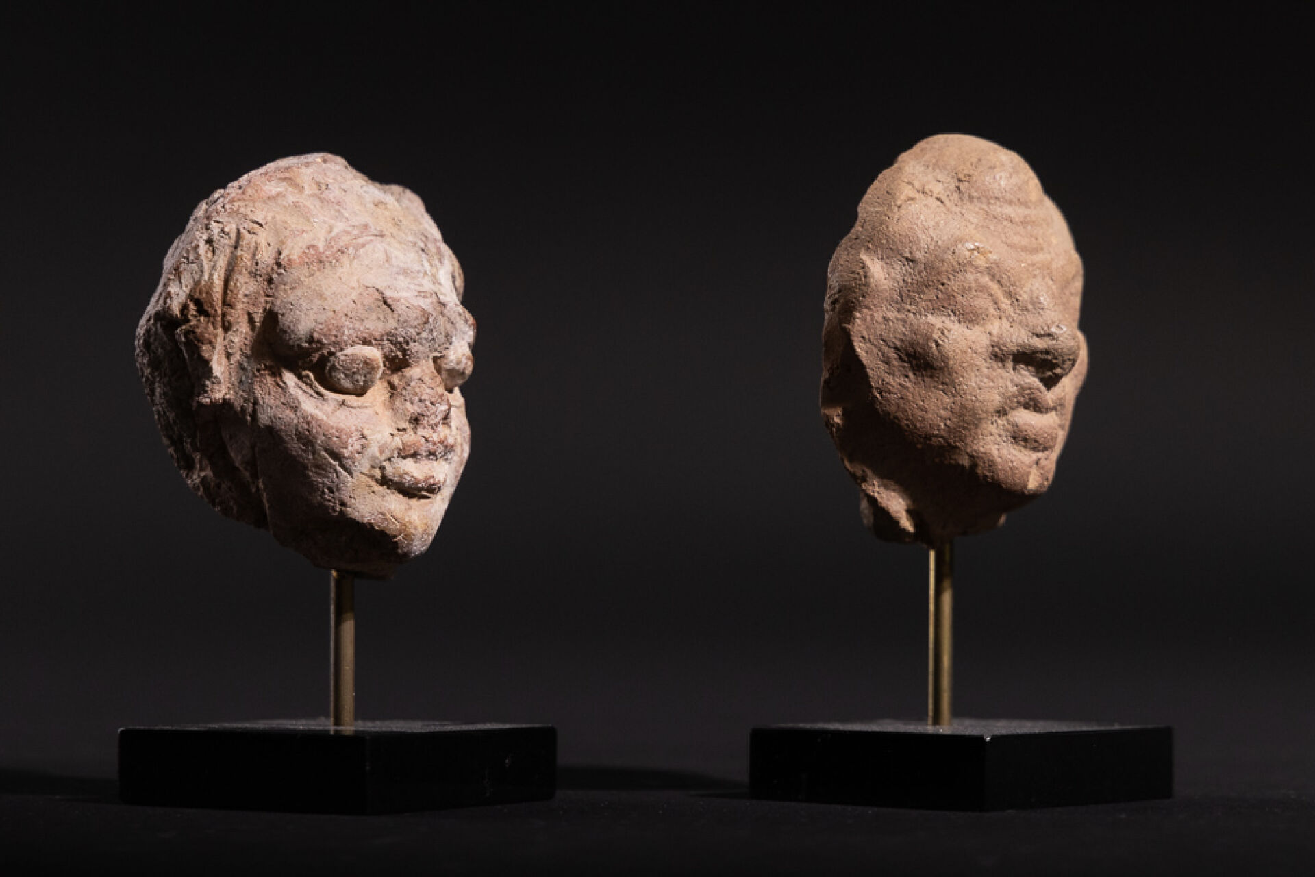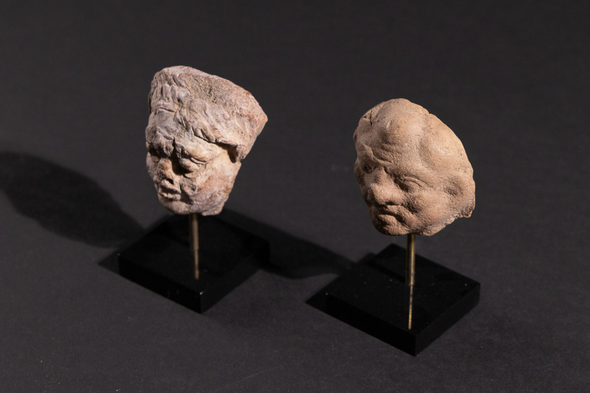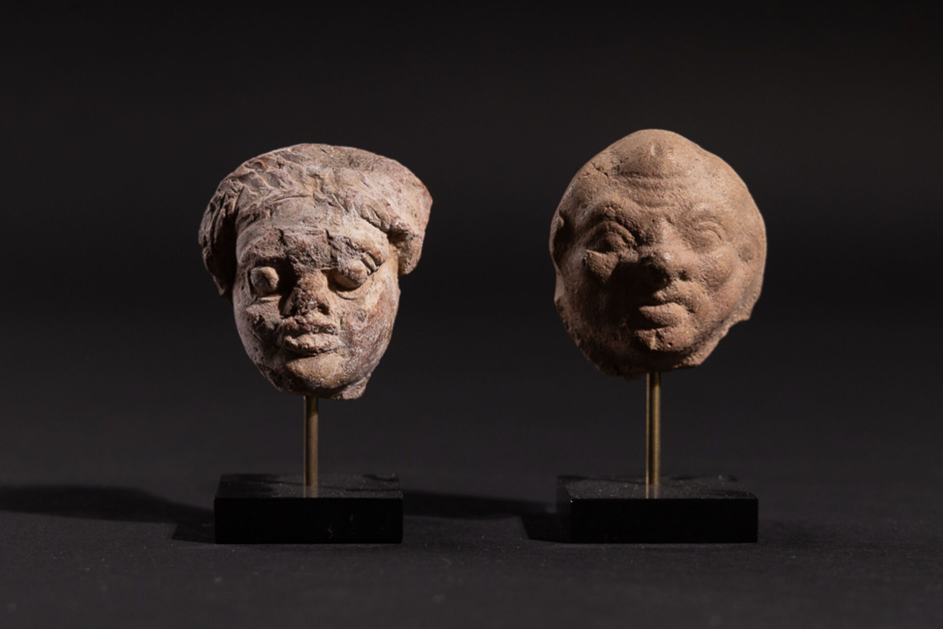Deux têtes de figurines gréco-romaines en terre cuite. (indiquer la hauteur des têtes) Provenance : galerie Mariaud de Serres (avec certificat). Haut. sur socle : 9 cm.