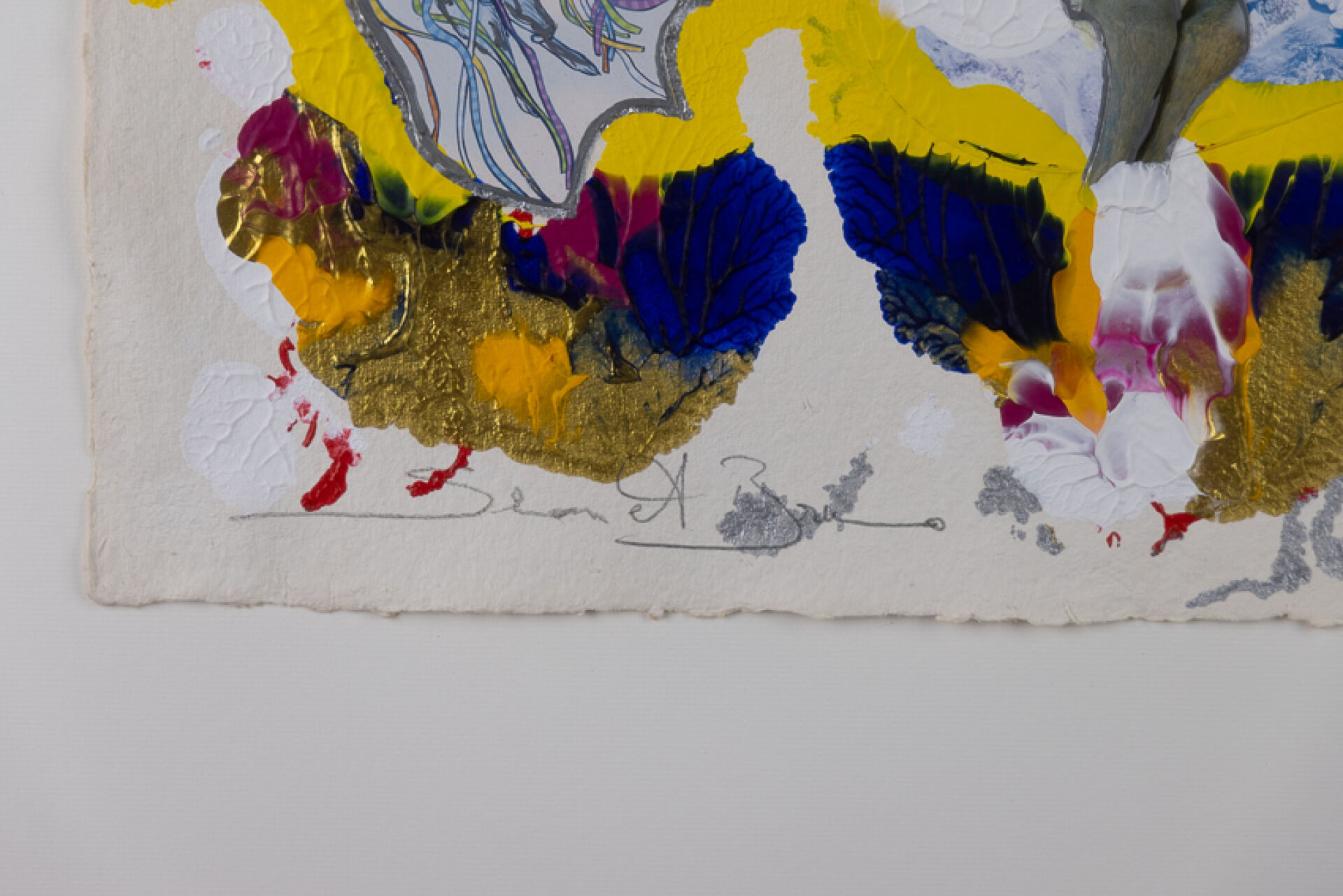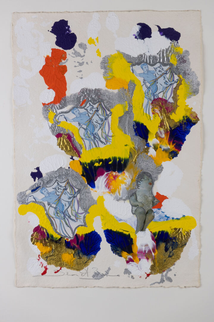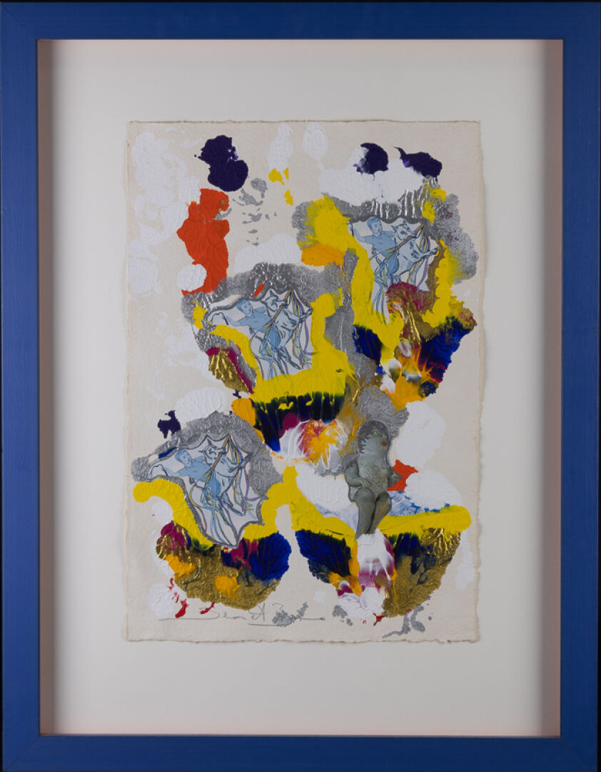 SIMON et BRUNO (XXe siècle). Composition abstraite dans les tons gris, jaune, violet orange aux cavaliers fantastiques. Technique mixte sur papier signée. Haut. : 56 cm - Larg. : 37.5 cm