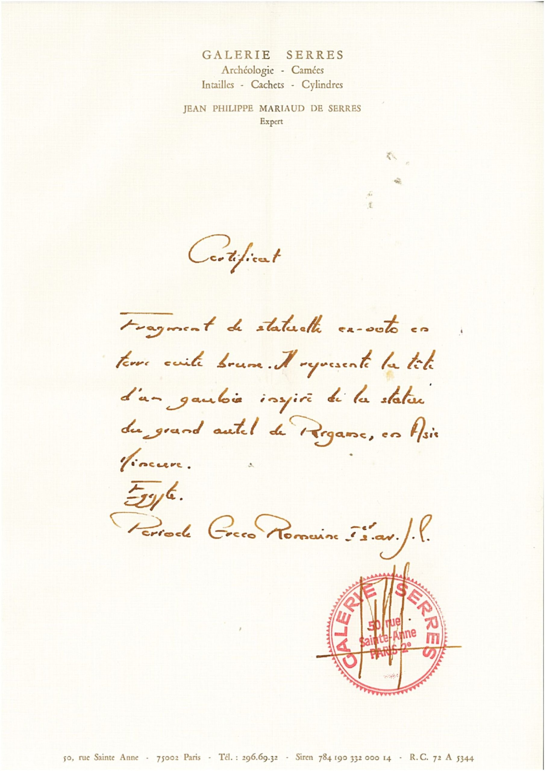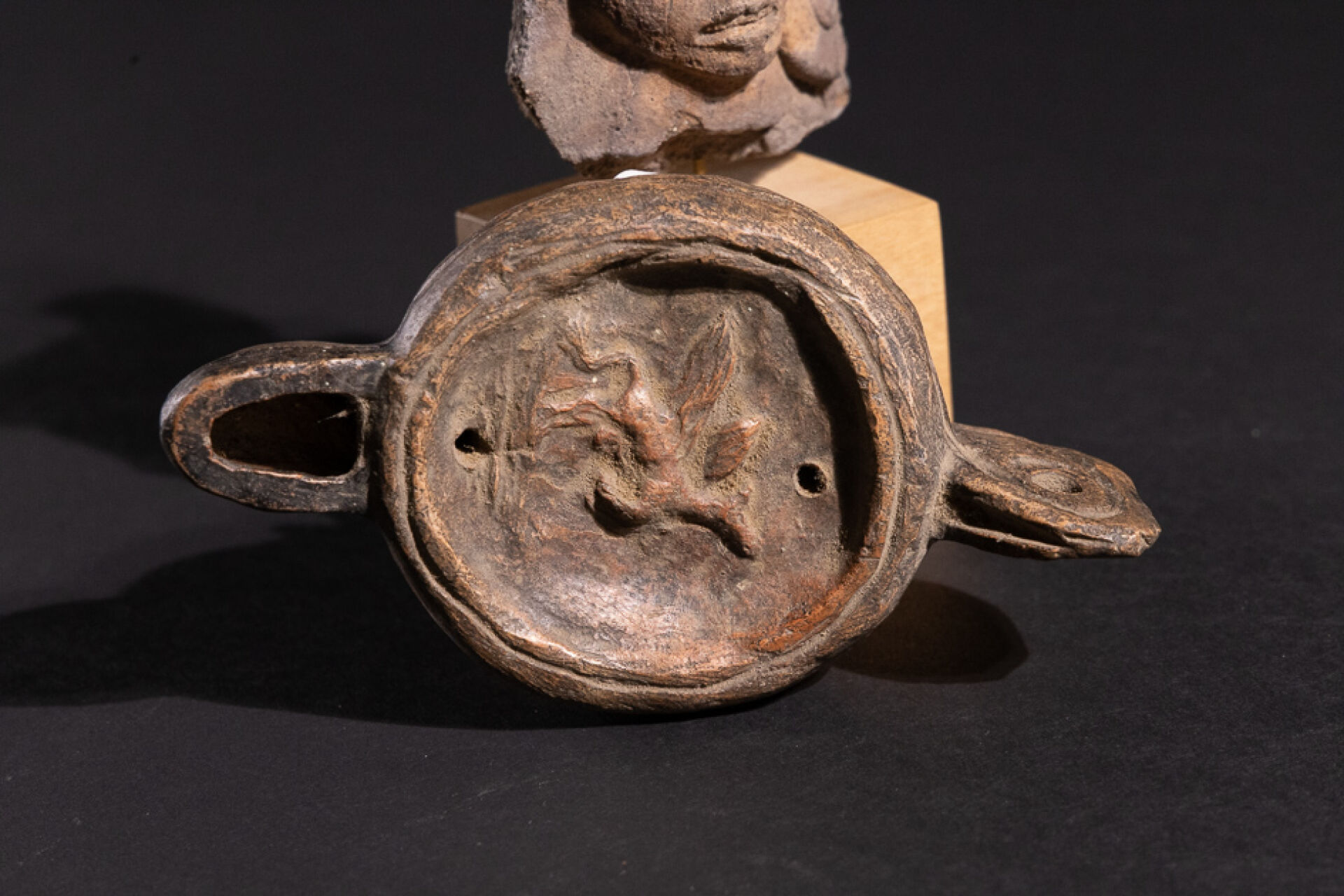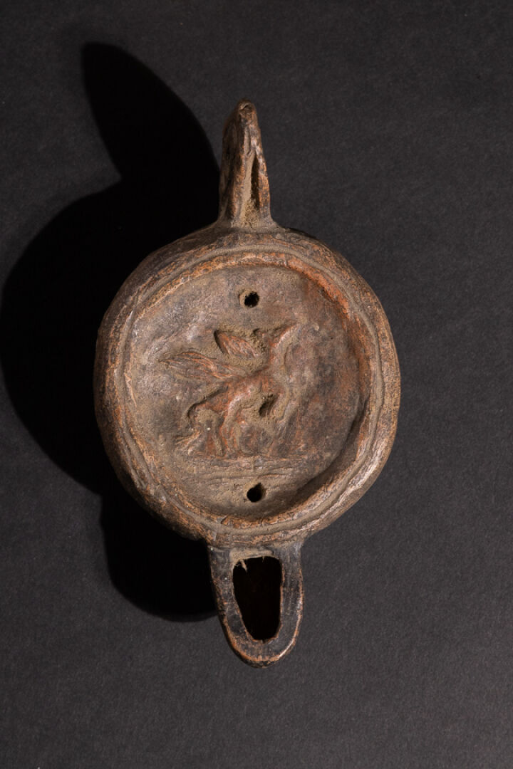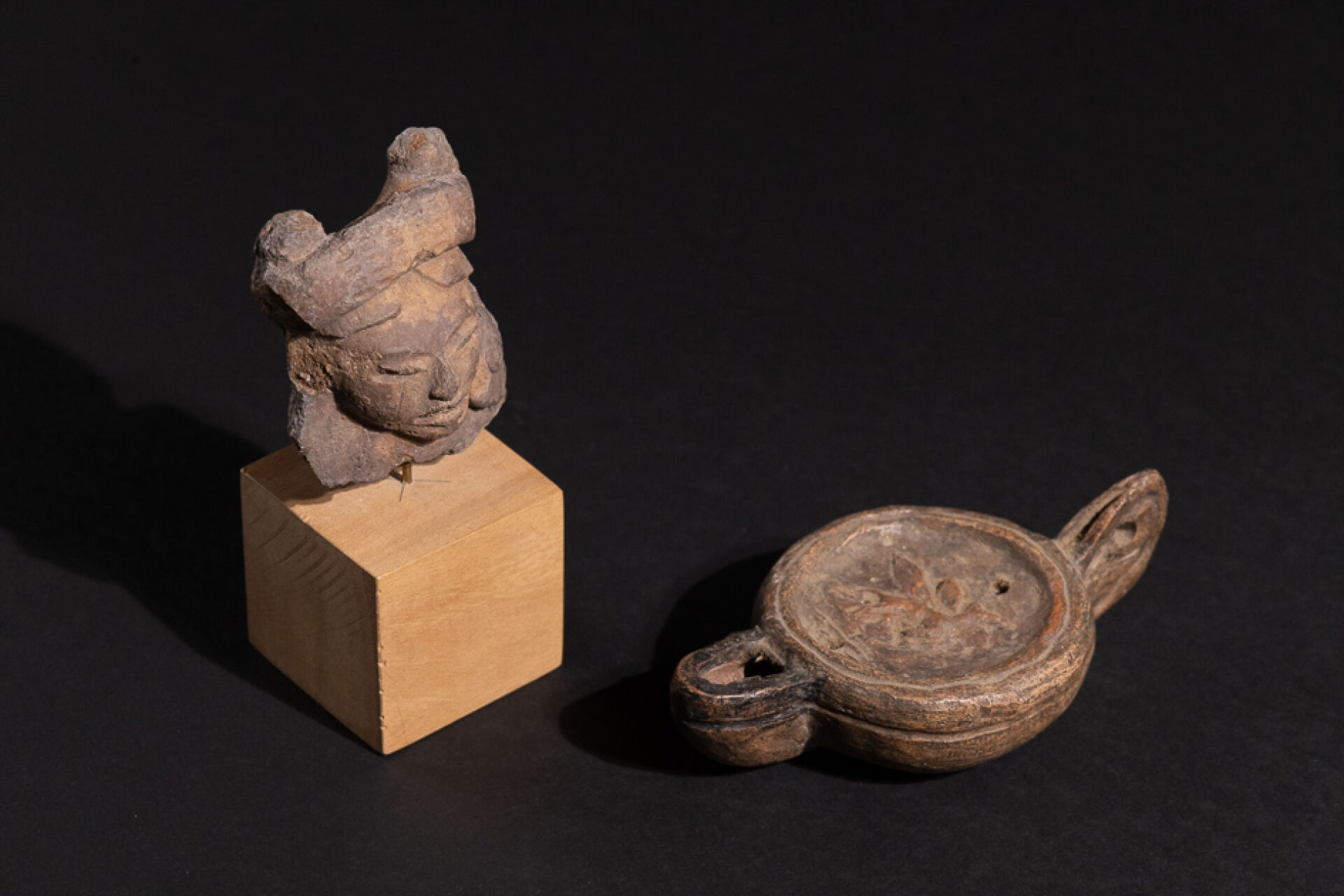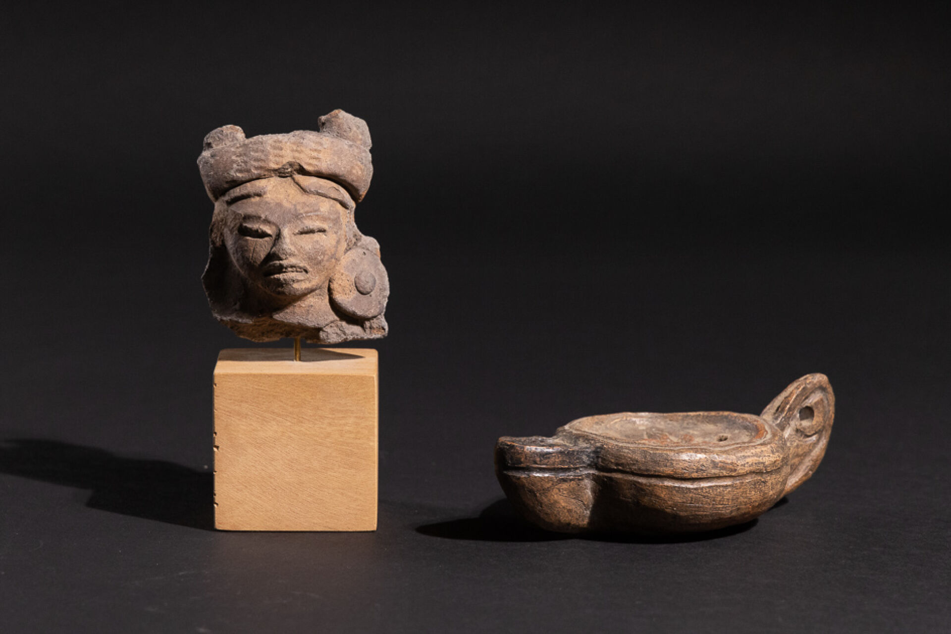 Tête de figurine précolombienne de Mésoamérique. Haut. : 7 cm. On joint une lampe dans le style antique décorée d'un cheval ailé. Long. : . 12 cm.