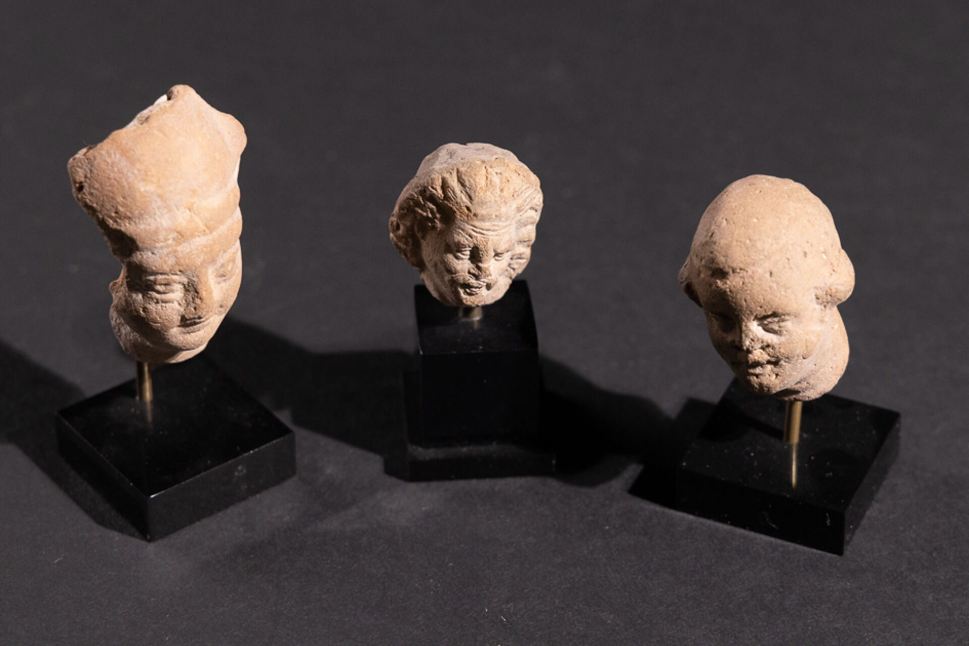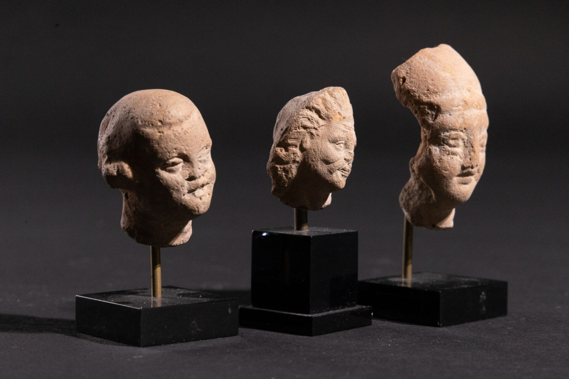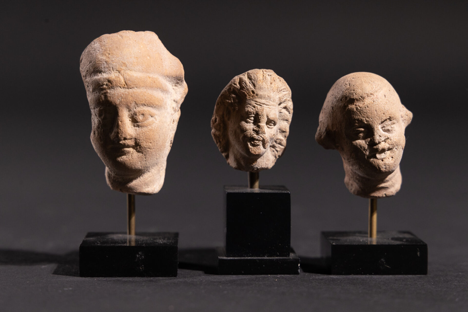 Trois têtes de figurines gréco-romaines en terre cuite. Haut. avec socle : de 6.5 à 8 cm Provenance : Galerie Mariaud de Serres (avec certificat).