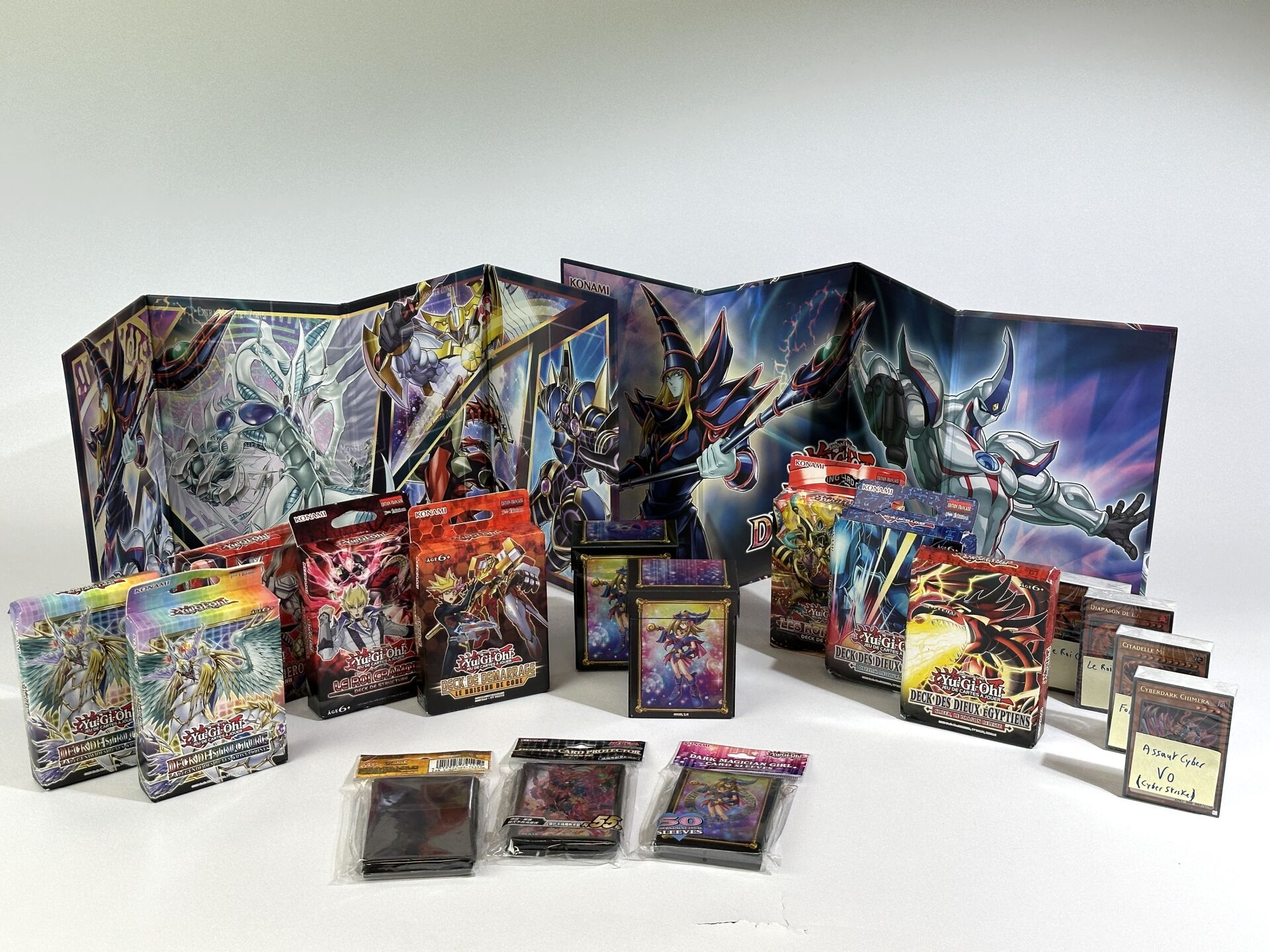 YU-GI-OH : Lot de 12 Decks de structure neufs, 11 en Français et 1 en Anglais 3 Decks Le Roi cramoisi (1 en boîte, 2 avec juste les cartes blistées) 2 Decks La Légende des Bêtes Cristallines 1 Deck Les Rois du Feu 1 Deck Le Briseur de Code 1 Deck L'Assaut des Héros 1 Deck des Dieux Egyptiens Oblisk 1 Deck des Dieux Egyptiens Slifer 1 Deck Folie Mécanisée (sans boîte, juste avec les cartes blistées) 1 Deck Cyber Strike (Assaut Cyber en Anglais, sans boîte, juste avec les cartes blistées) On ajoute 5 Paquets de protèges cartes Konami et une boîte de deck Magicienne des Ténèbres