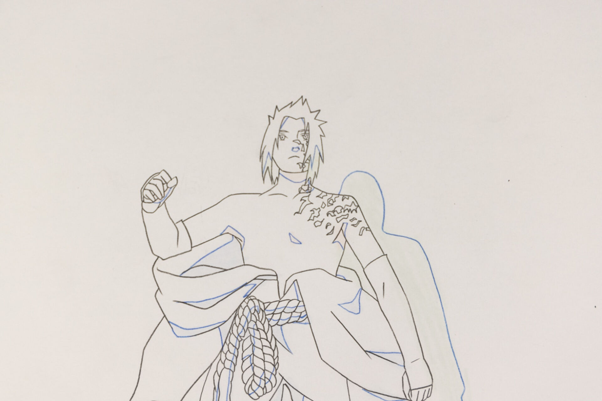 Masashi Kishimoto (岸本 斉史) et Hayato Date (伊達 勇登) - Naruto Shippûden (ナルト 疾風伝, signifiant littéralement : Naruto Chroniques de l'Ouragan) - Sasuke Uchiwa (うちはサスケ ou Uchiha Sasuke) : Douga original à la mine de plomb et aux crayons de couleur représentant Sasuke Uchiwa arborant sa marque maudite apposée par Orochimaru lors de la deuxième phase des examens Chūnin. Tiré de l'épisode 113 éLe Disciple du serpent" ou "大蛇の瞳孔". Haut. : 22 cm x Larg. : 29.5 cm 2009 Expédition sur devis