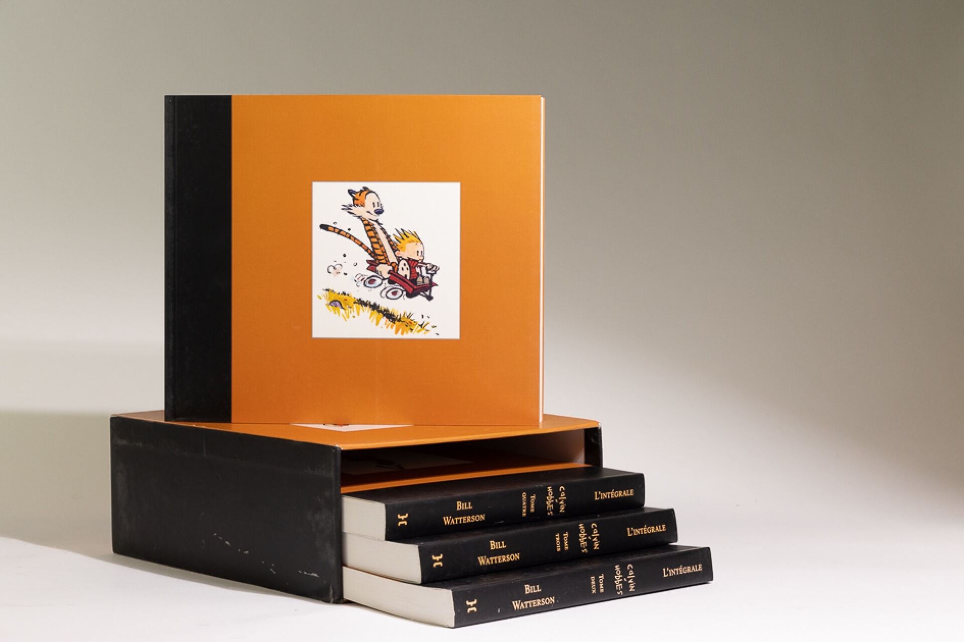 Coffret L'intégrale de "Calvin et Hobbes" - par Bill Watterson - Editions Hors Collection : Tomes 1 à 24 regroupés en 4 volumes. Coffret abimé aux coins. (Ce lot chez vous en France métropolitaine pour 33.05 €) "Les aventures de Calvin, le petit garçon râleur à l'imagination débordante, et de son tigre en peluche Hobbes ont fait le tour du monde : une amitié imaginaire, teintée d'absurde, d'humour et de philosophie... L'intégrale de la BD culte Calvin et Hobbes regroupe, en quatre somptueux volumes, tous les dessins de Bill Watterson publiés dans la presse entre 1985 et 1995. Inédits : une introduction de Bill Watterson et des dessins tirés de sa propre collection en ouverture de chaque volume."
