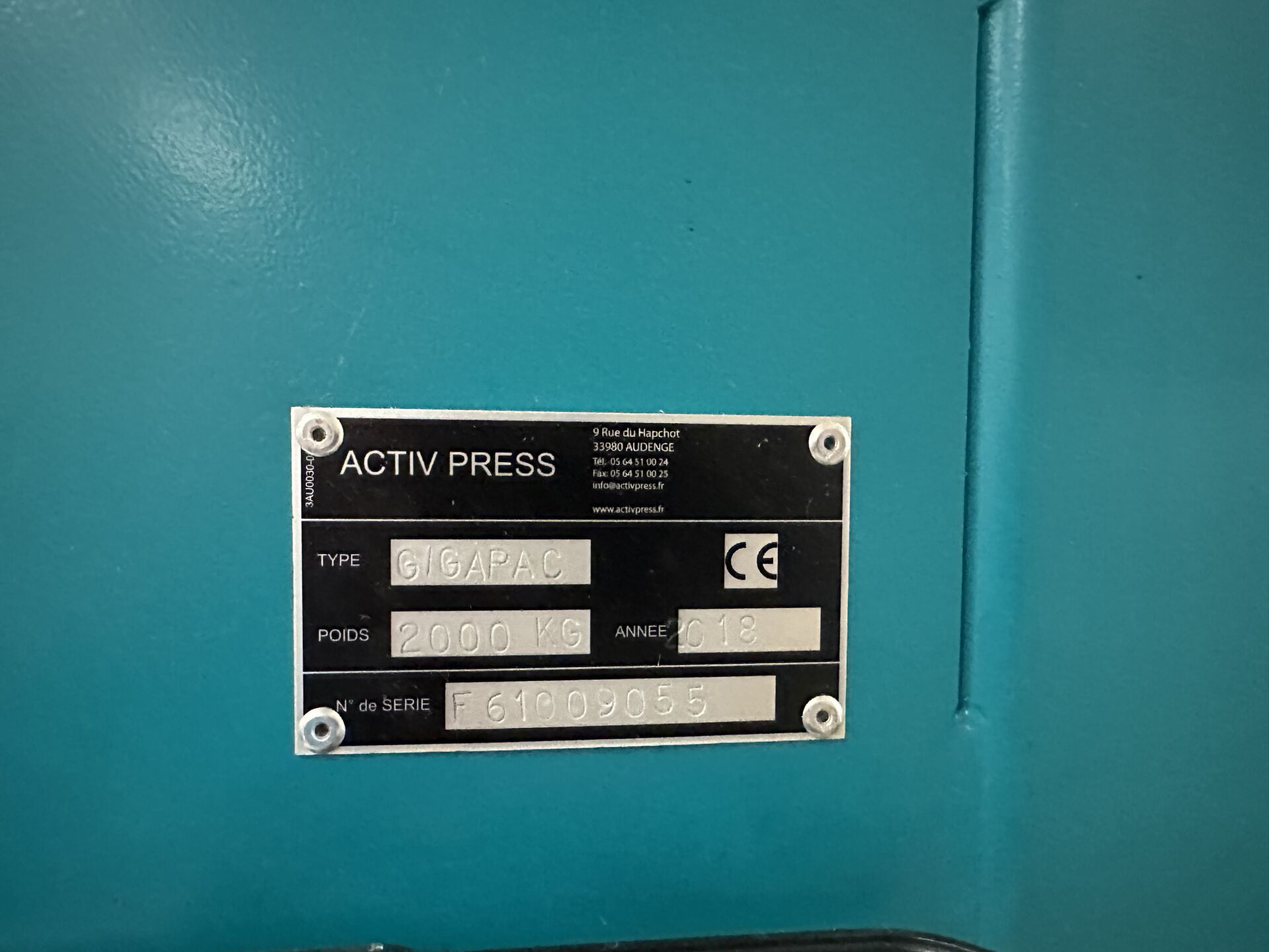 1 presse à balles carton ACTIV PRESS GIGAPAC 2000 KG 2018 No de série F61009055 avec feuillards de rechange (frais de mise à disposition 10 € TTC)