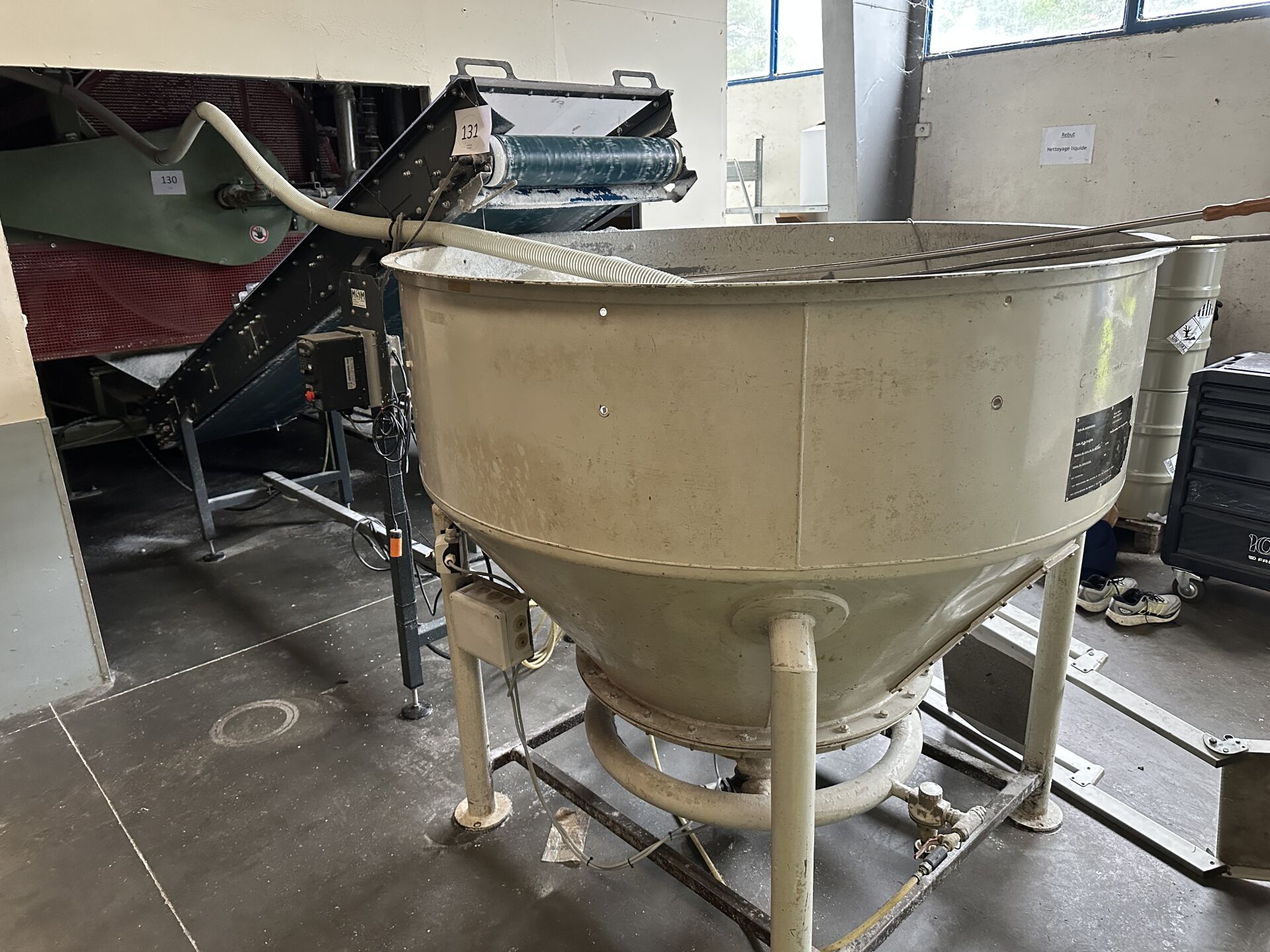 Vendu sur désignation le 04 11 2025 à 10h à NANTES, 24 rue du marché commun, visible le 03/11/2025 de 14h à 16h à GETIGNé, Enlèvement jusqu'au 19 décembre 2025 HALL 4 - (partie de la chaine de production de "bougies ménage" HERRHAMMER) : -1 convoyeur à bande longueur 3500 mm longueur 700 mm à capot, incliné -1 trémie diamètre 1500 mm hauteur 1600 mm avec un système anti-colmatage (frais de mise à disposition 50 € TTC)