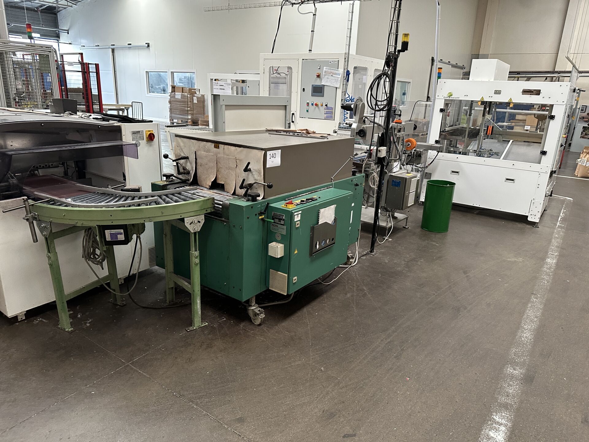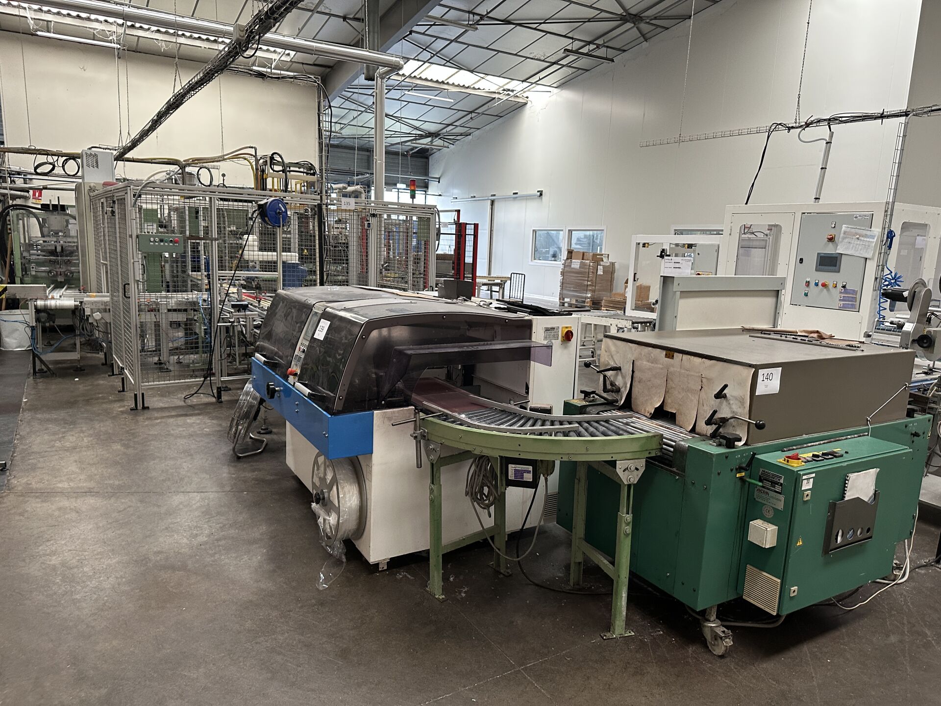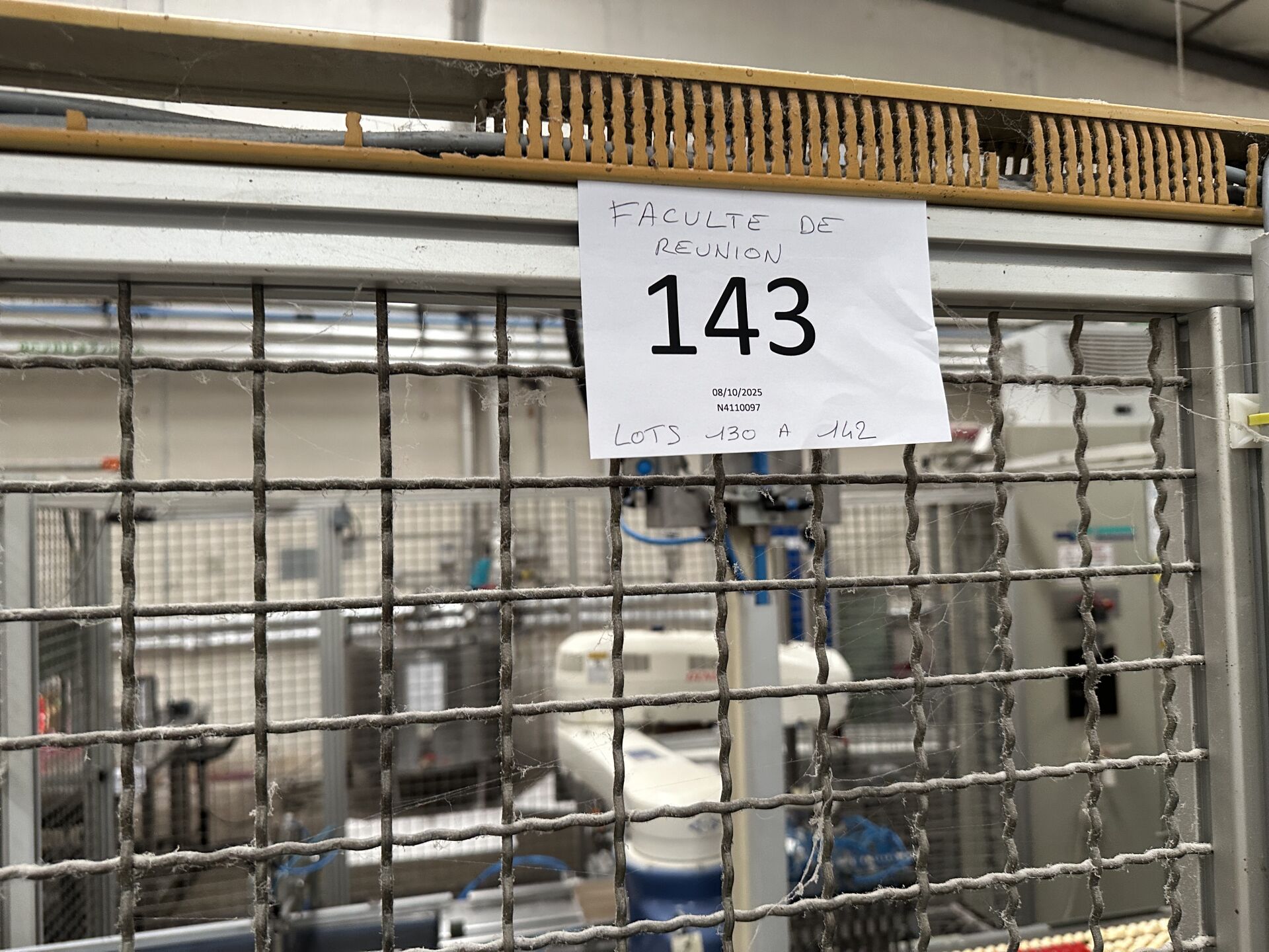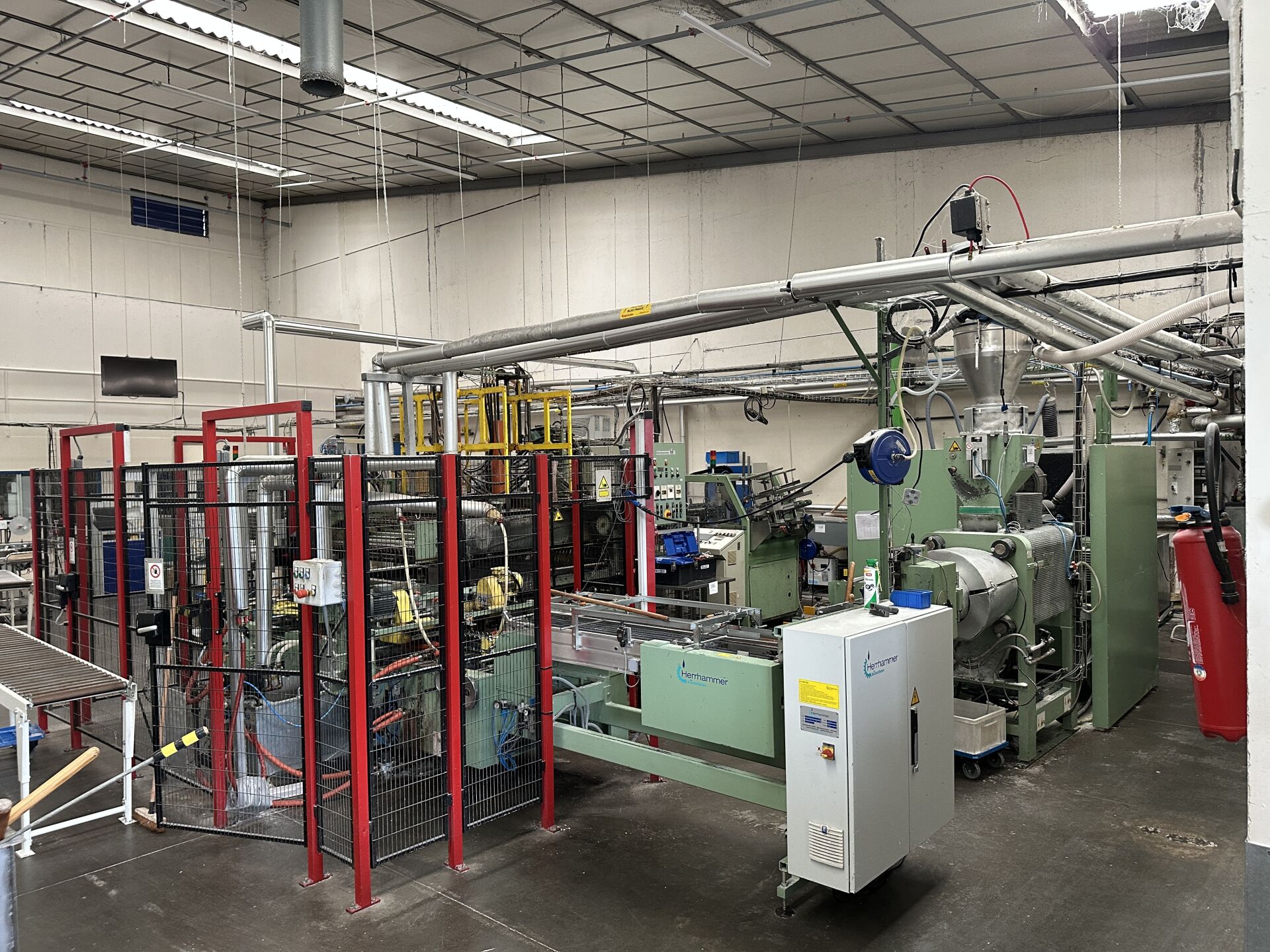 HALL 4 - FACULTE DE REUNION (chaine de production de "bougies ménage" HERRHAMMER) : lots 130 à 142 : 130/ -1 rouleau à poudre diamètre 1500 mm longueur 350 mm -1 bac de pulvérisation inox bain d'huile 131/ -1 convoyeur à bande longueur 3500 mm longueur 700 mm à capot, incliné -1 trémie diamètre 1500 mm hauteur 1600 mm avec un système anti-colmatage 132/ - extrudeuse HERRHAMMER KOLBEN PRESSE HKP-800 d'avril 2011 avec pupitre de commande, trémie 64371 de 2011 diam 50 cm -1 module d'insertion de mèche No 64373 de 2011 133/ -1 système de rognage double moteur KHF 30/5-25/50 de 2013 + 1 module d'évacuation KHF/KHSF 30/5 de 2013 + grilles de sécurité (440 x 300 cm) 134/ -1 module de trempage KHTM 1430/191-35VL -1 convoyeur à bande crantée longueur 6000 mm largeur 35 cm 135/ -1 robot DENSO 2 axes HM-4AA 03M de 2017 No 81640054 No de série 08U398 sur base HERRHAMMER No 12300 de 2002 commande filaire MP718E3P8 , grilles de sécurité 315 x 320 cm 136/ -1 barquetteuse HERRHAMMER HZA-01 de juin 2000 137/ -1 convoyeur à bande longueur 3500 mm largeur 400 mm + 1 retour de 1100 mm + 1 poste de chargement longueur 110 cm 138/ -1 imprimante jet d'encre TIM JET HP à cartouche TIMIS sur convoyeur à bande longueur 300 cm 139/ -1 filmeuse HUGOBECK FLEXO 500 S-l du 06/2010 140/ -1 convoyeur à rouleaux motorisé d'angle longueur 400 mm -1 four de rétractation HUGOBECK SLB 5012/25 No 11931 de 1998 141/ -1 étiqueteuse HERMA H 400-16 R dessus-dessous type H652C 142,1/ -1 armoire de commande générale HERRHAMMER de 2002 (frais de mise à disposition 1700 € TTC)