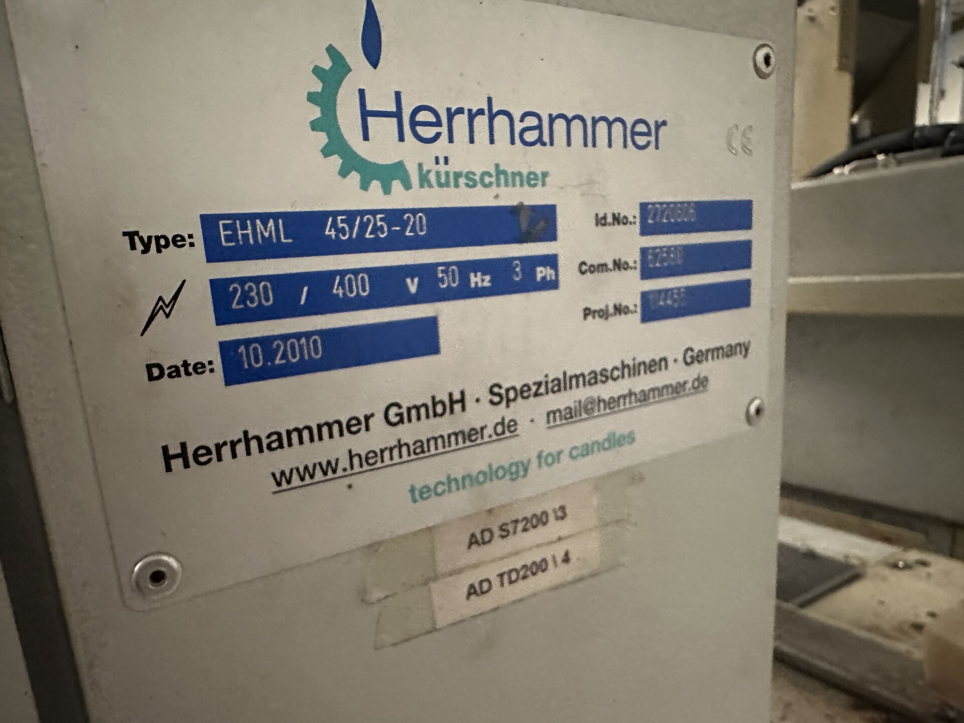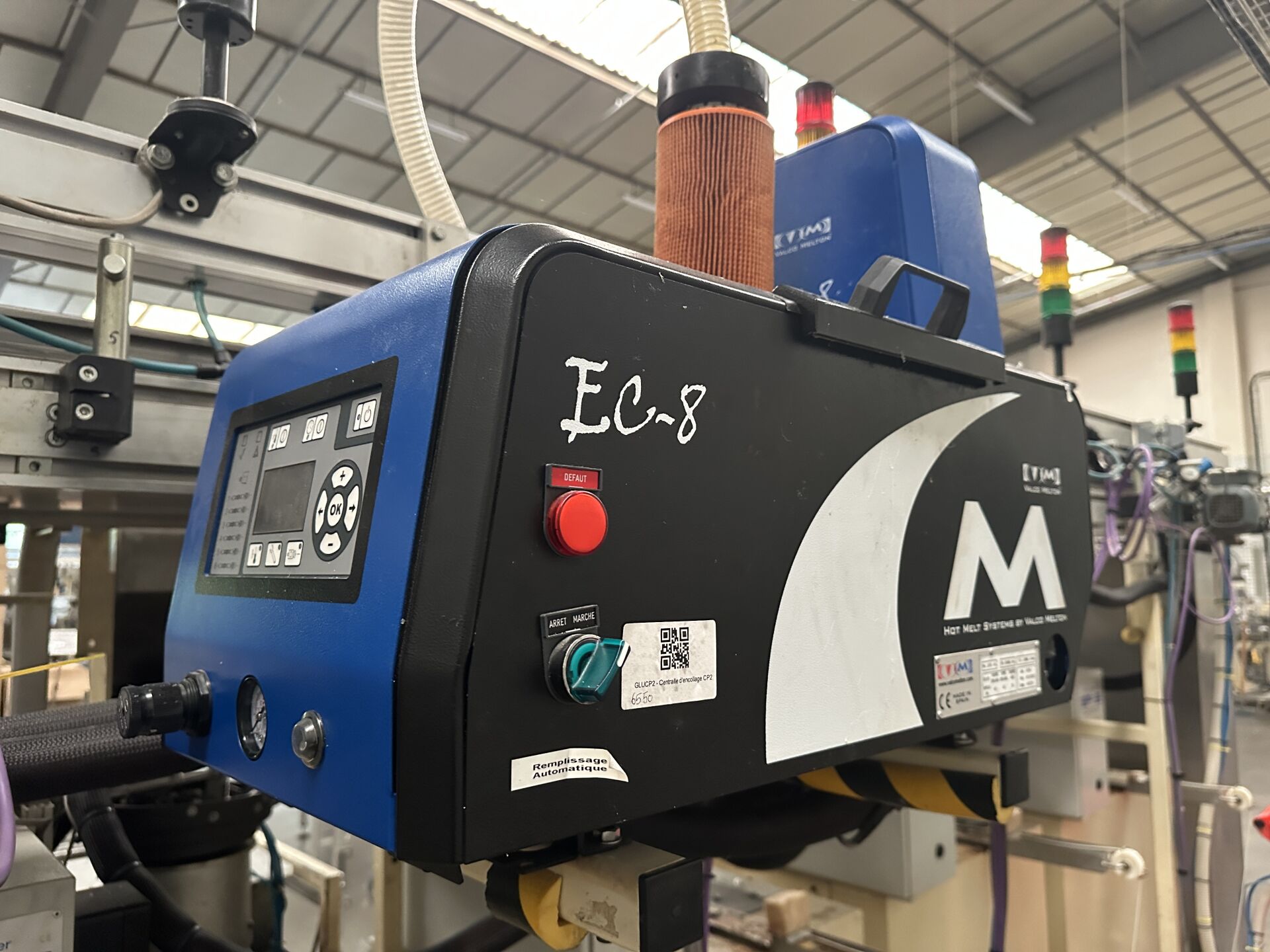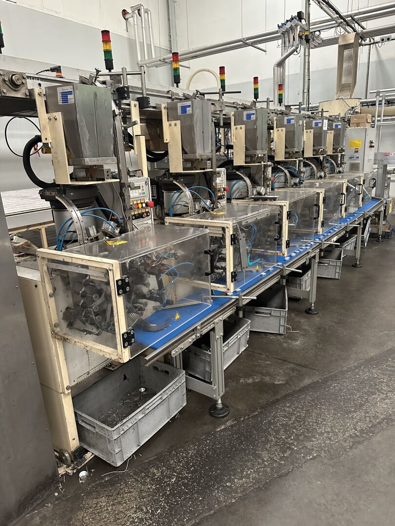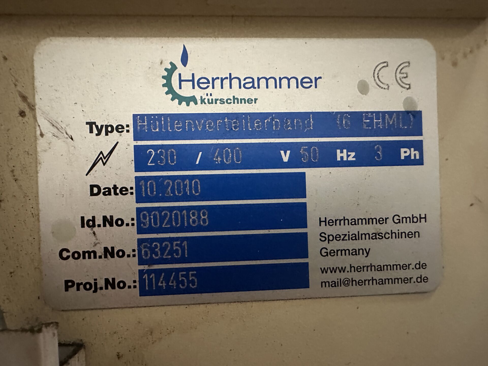 CP2 - FACULTE DE REUNION - ENCHERES PROVISOIRES (partie de la ligne de production de chauffe-plats blancs HERRHAMMER) : -1 tapis convoyeur 2 bandes 6000 mm x 600 mm -6 systèmes de dépose de mèches EHML 45/25-20, 10 000 godets/heure, de 2010 -1 système de collage à chaud VALCOMELTON EC-8 du 19/07/2021 avec bac de stockage + système d'aspiration -1 tapis de convoyage bas 6000 x 400 mm ABZUGSBAND de 2010 -1 coffret de commande HHS-700 W HULLENSORTIERER de 2010 et 1 étagère avec matériel d'entretien (frais de mise à disposition 300 € TTC)