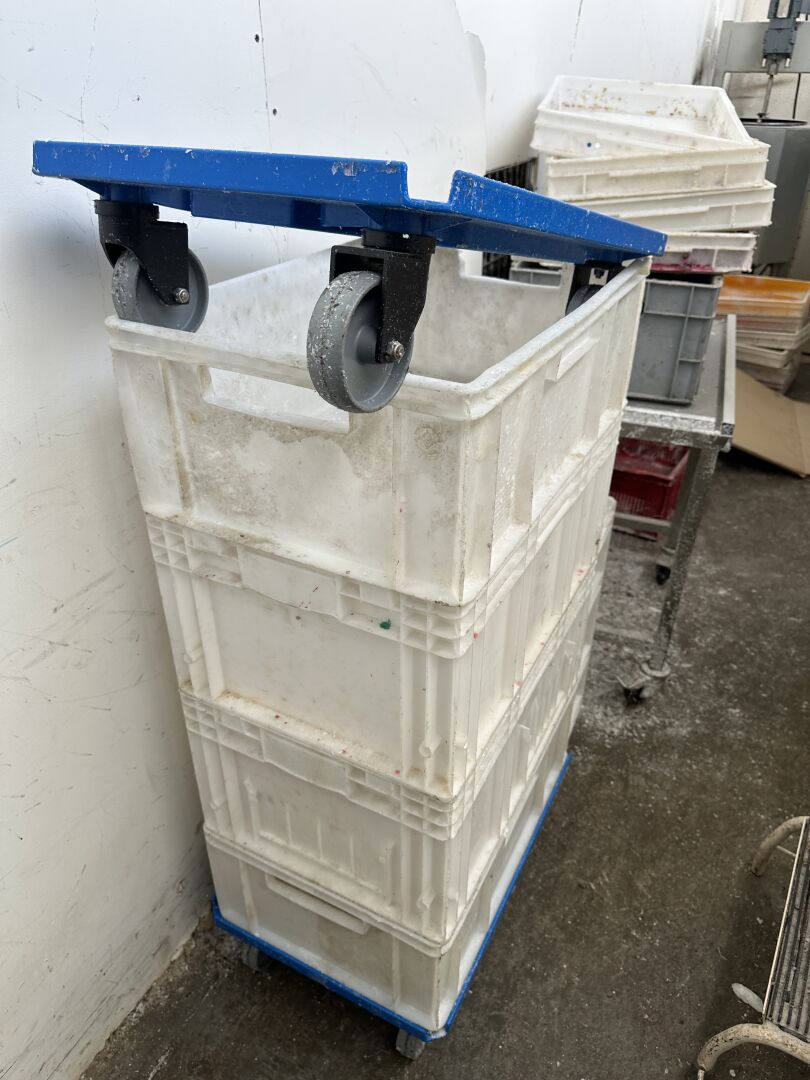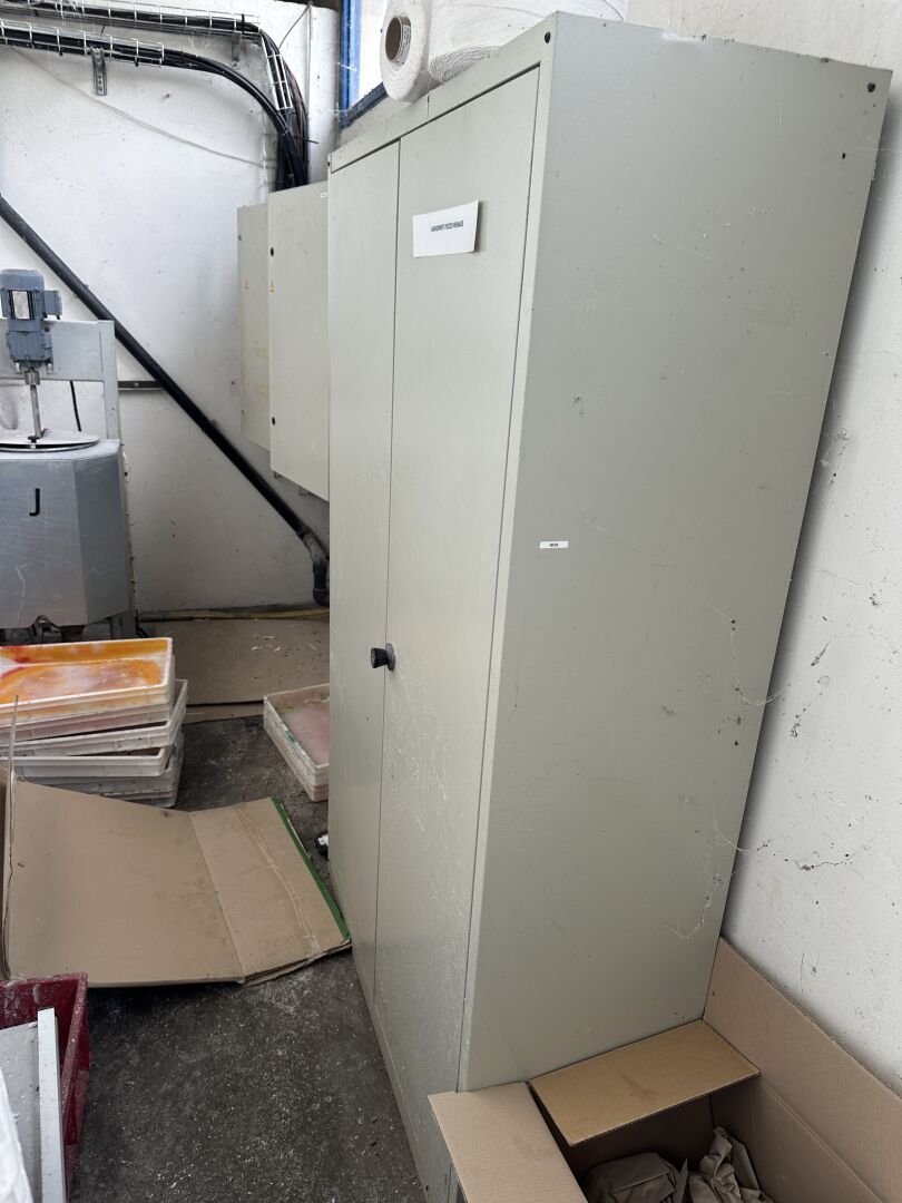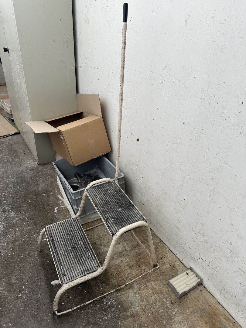 1 escabeau mobile tube métal gris 6 marches 2 marche-pied 2 marches, 1 desserte inox 80 x 50 cm 1 petite cuve inox mobile diam 40 cm avec mélangeur intégré (rebutée) 1 armoire 2 portes métal gris et 1 étagère cornière 3 niveaux (frais de mise à disposition 10 € TTC)