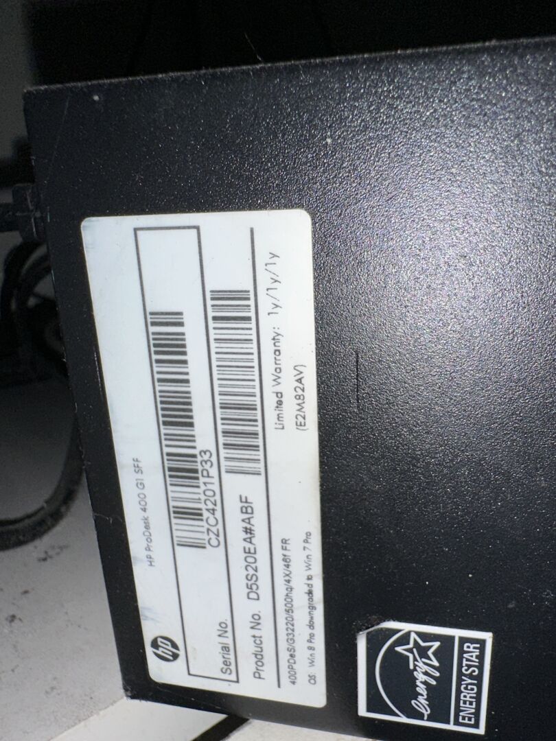 1 configuration informatique : UC H P PRODESK 400 G1 Pentium , écran , clavier, souris, imprimante étiquettes ZEBRA ZM 600 (frais de mise à disposition 10 € TTC)