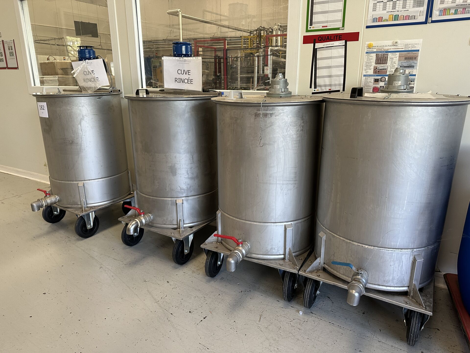 4 cuves 200 L alu sur chassis mobiles simple peau avec agitateur (sans serpentins) diam 62 cm hauteur 70 cm (frais de mise à disposition 10 € TTC)