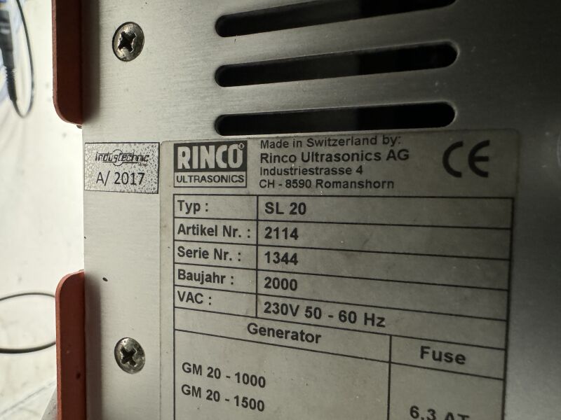 1 soudeuse à ultrason RINCO ULTRASONIC SL20 sur chassis mobile avec générateur RINCO CH 9320 (frais de mise à disposition 10 € TTC)
