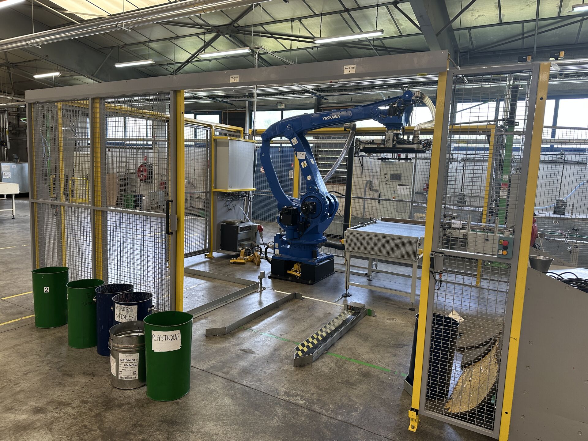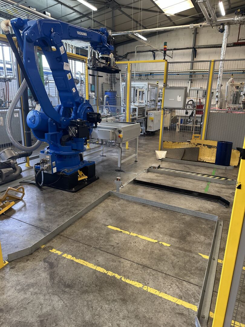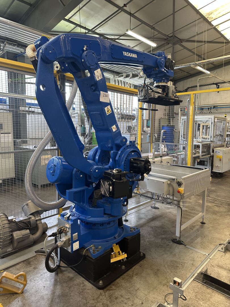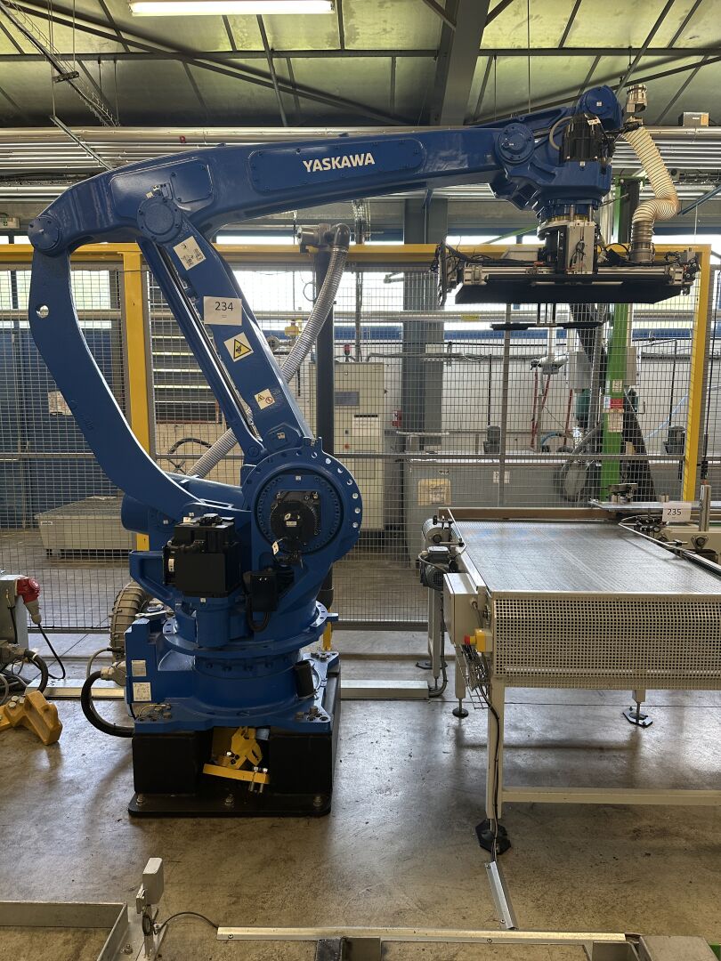 HALL 6 : Sur 1 ligne de remplissage (LR2) HERRHAMMER - FACULTE DE REUNION - ENCHERES PROVISOIRES -1 robot dépalettiseur YASKAWA MOTOMAN PL 190 YR-1-041 XH190 A00 de 2021, (190 kg max/ portée 3161 mm max) dans une cellule sécurisée : grilles de 440 x 550 cm, hauteur 250 cm avec pupitre de commande écran digital JZRCR-APP01 (frais de mise à disposition 1500 € TTC)