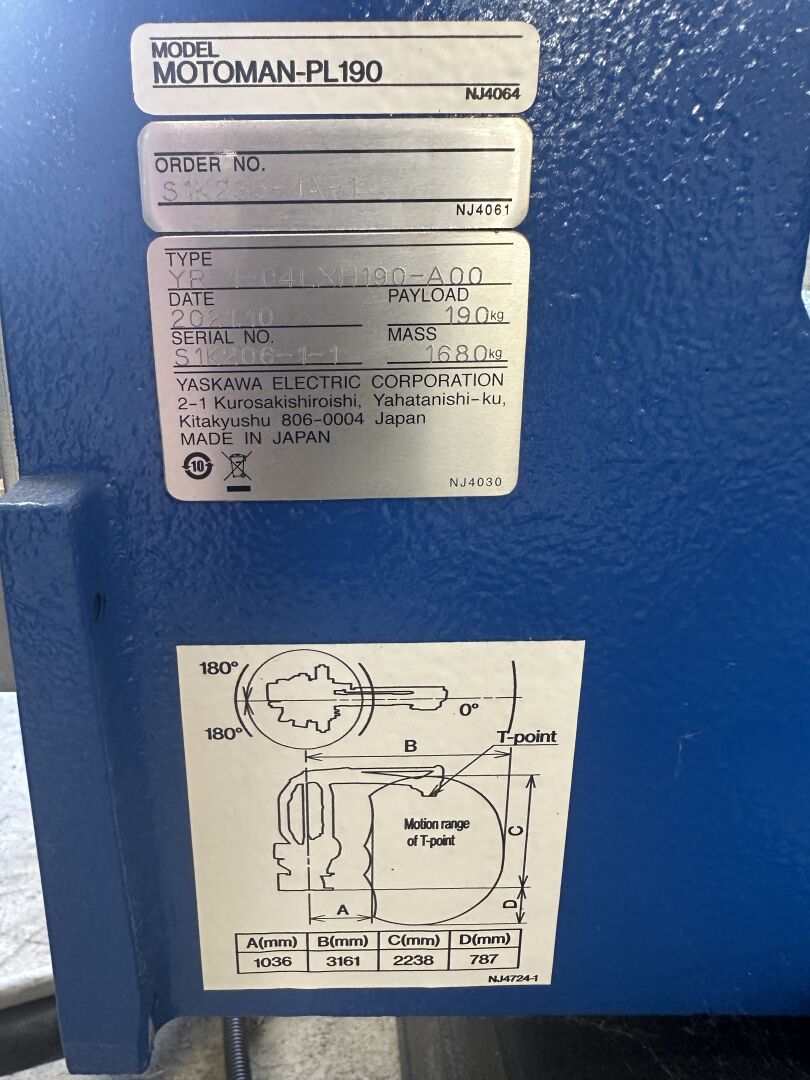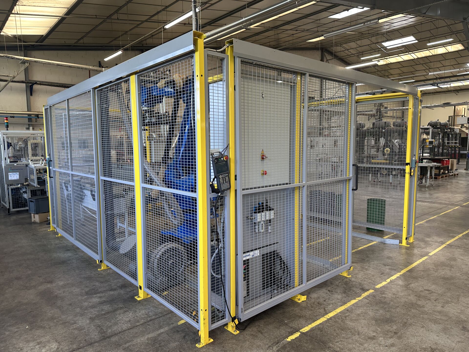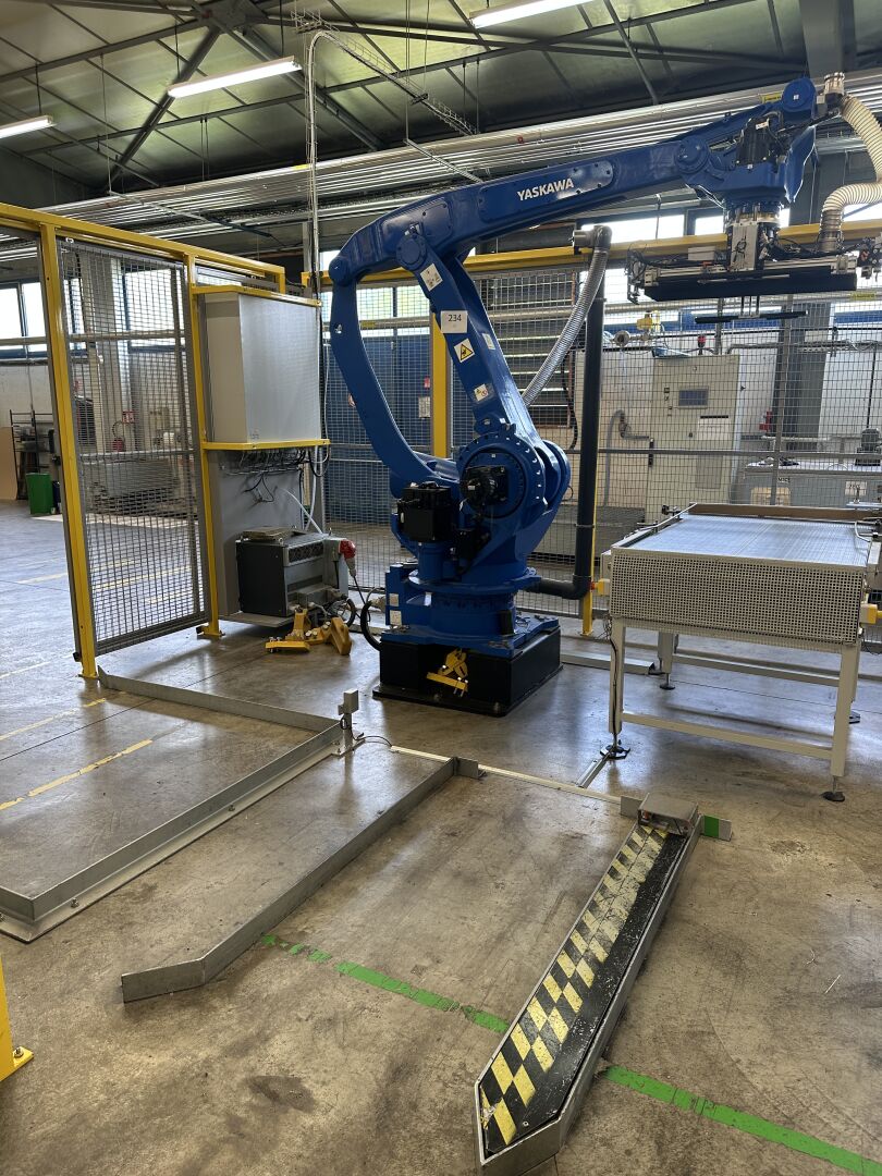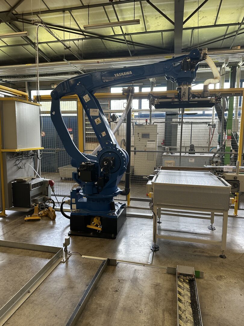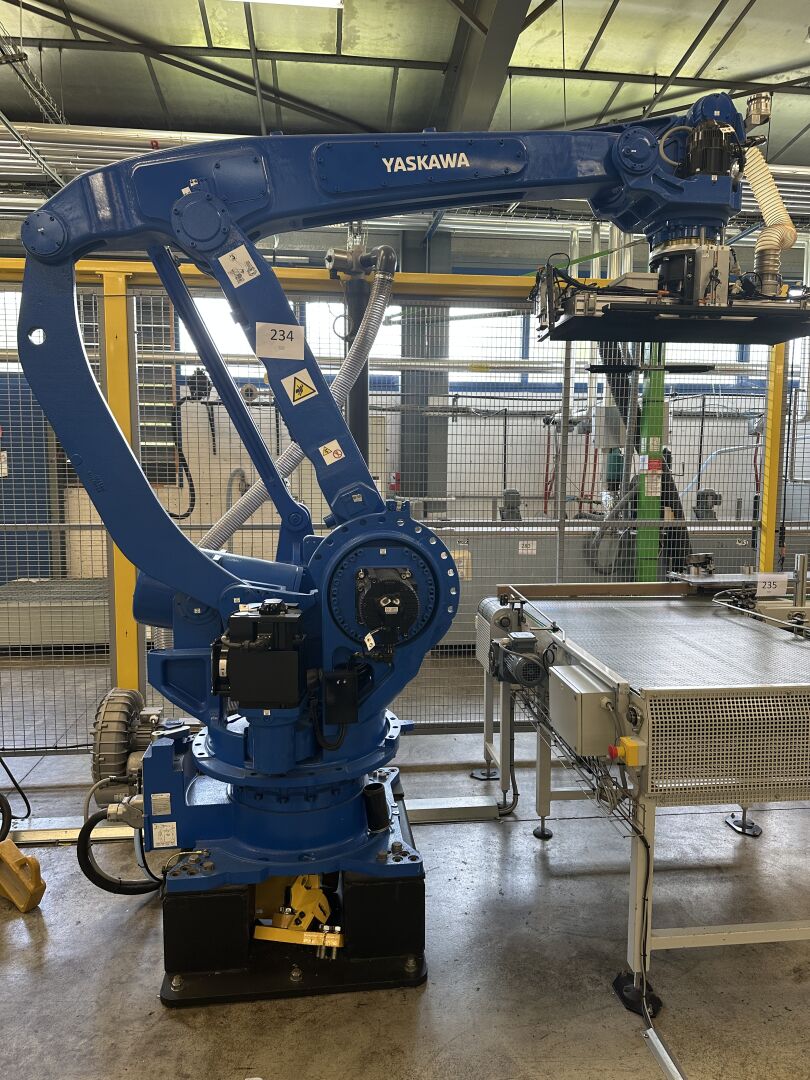 HALL 6 : Sur 1 ligne de remplissage (LR2) HERRHAMMER - FACULTE DE REUNION - ENCHERES PROVISOIRES -1 robot dépalettiseur YASKAWA MOTOMAN PL 190 YR-1-041 XH190 A00 de 2021, (190 kg max/ portée 3161 mm max) dans une cellule sécurisée : grilles de 440 x 550 cm, hauteur 250 cm avec pupitre de commande écran digital JZRCR-APP01 (frais de mise à disposition 1500 € TTC)