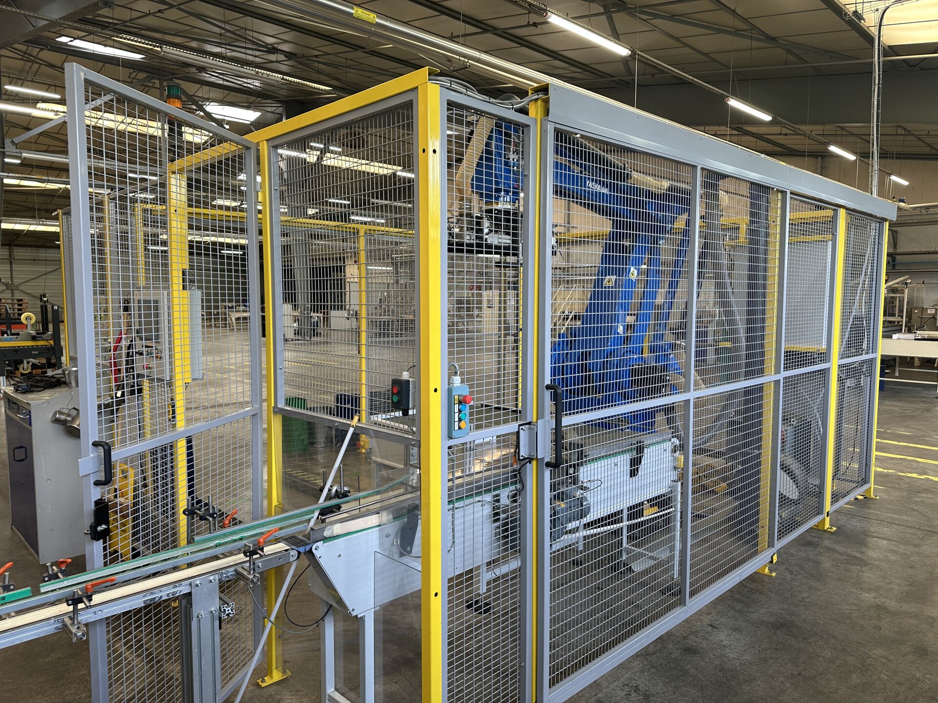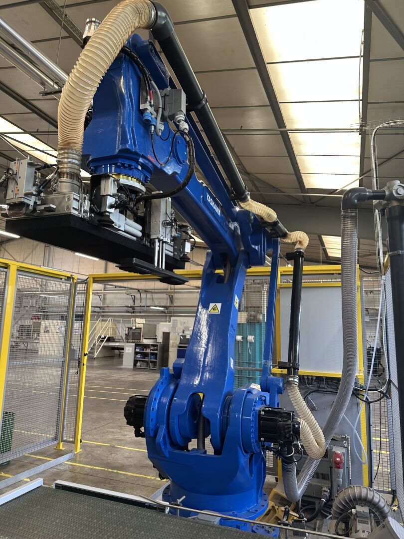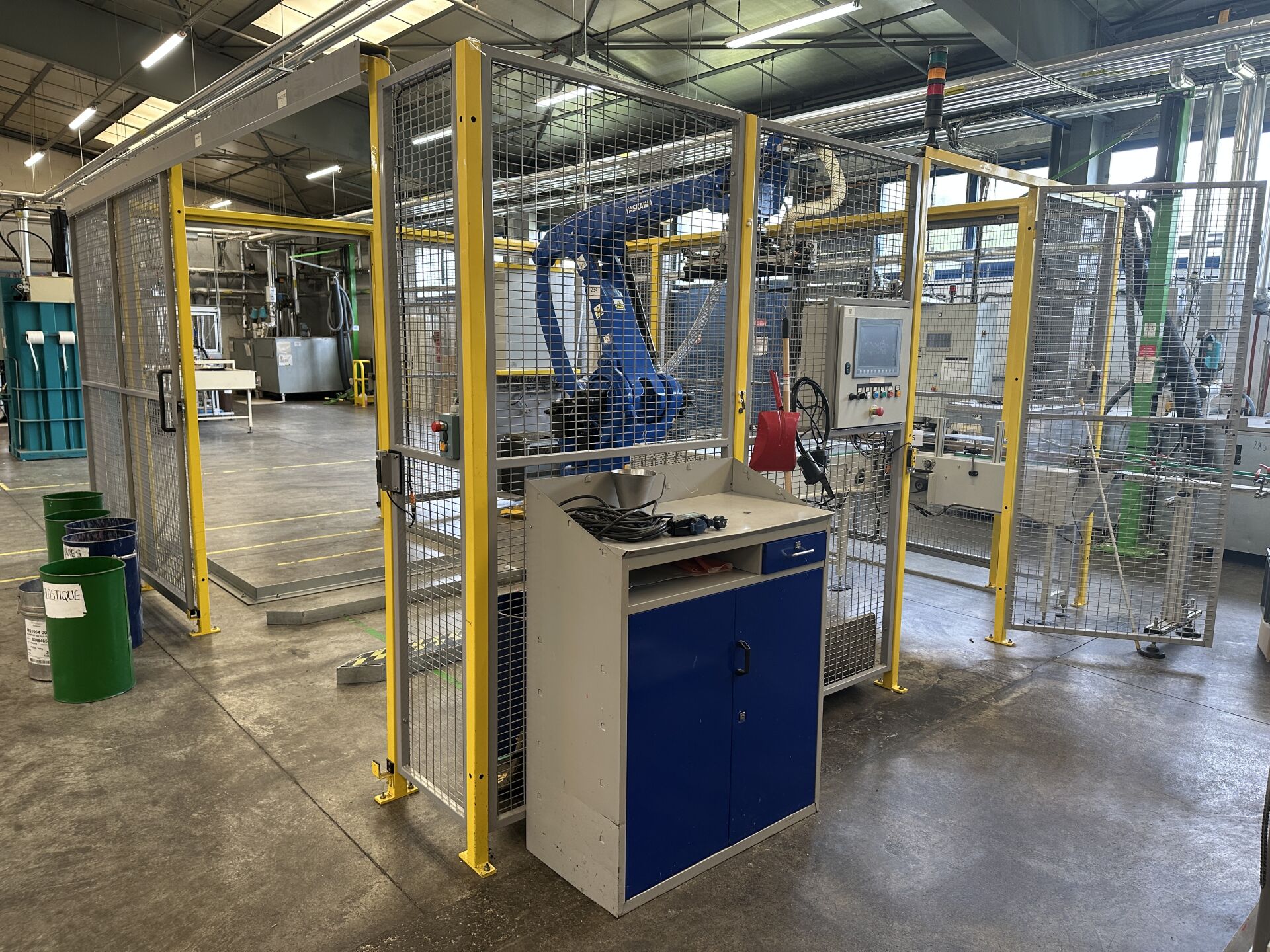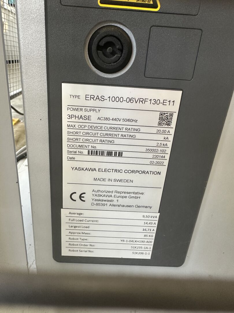 HALL 6 : Sur 1 ligne de remplissage (LR2) HERRHAMMER - FACULTE DE REUNION - ENCHERES PROVISOIRES -1 robot dépalettiseur YASKAWA MOTOMAN PL 190 YR-1-041 XH190 A00 de 2021, (190 kg max/ portée 3161 mm max) dans une cellule sécurisée : grilles de 440 x 550 cm, hauteur 250 cm avec pupitre de commande écran digital JZRCR-APP01 (frais de mise à disposition 1500 € TTC)