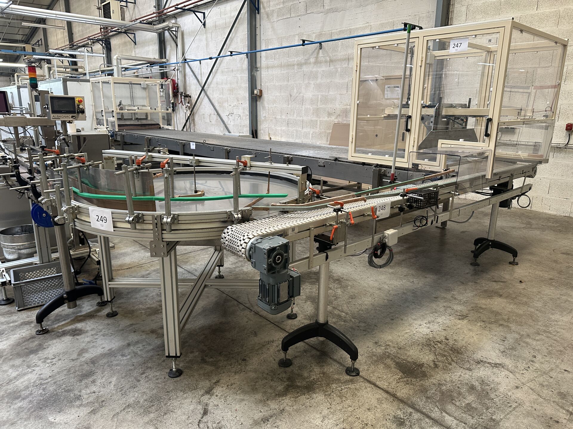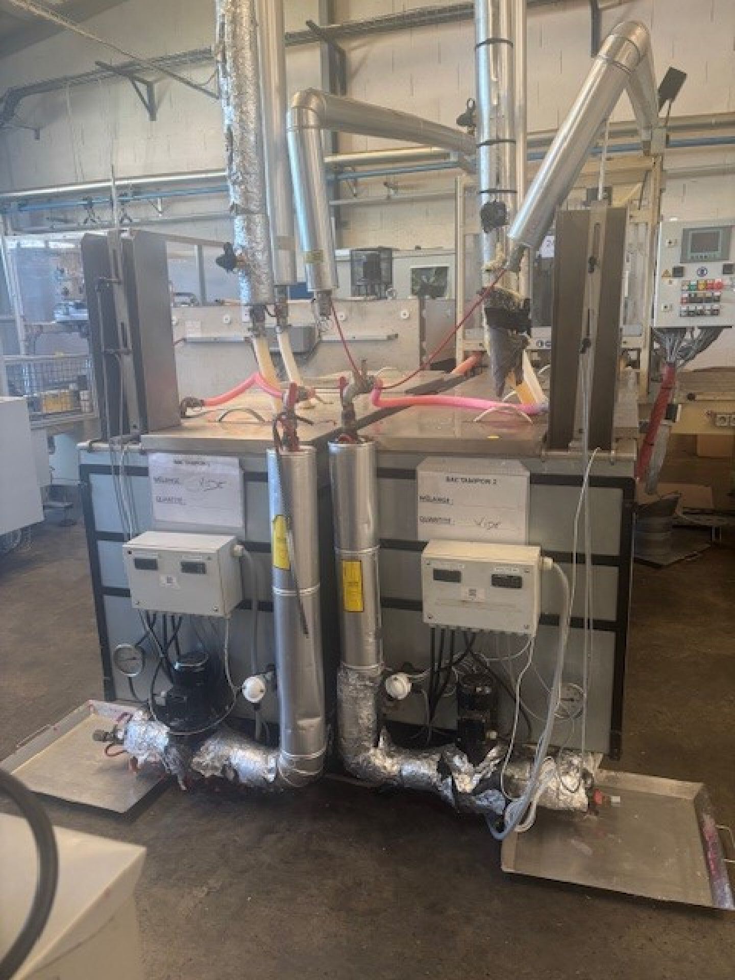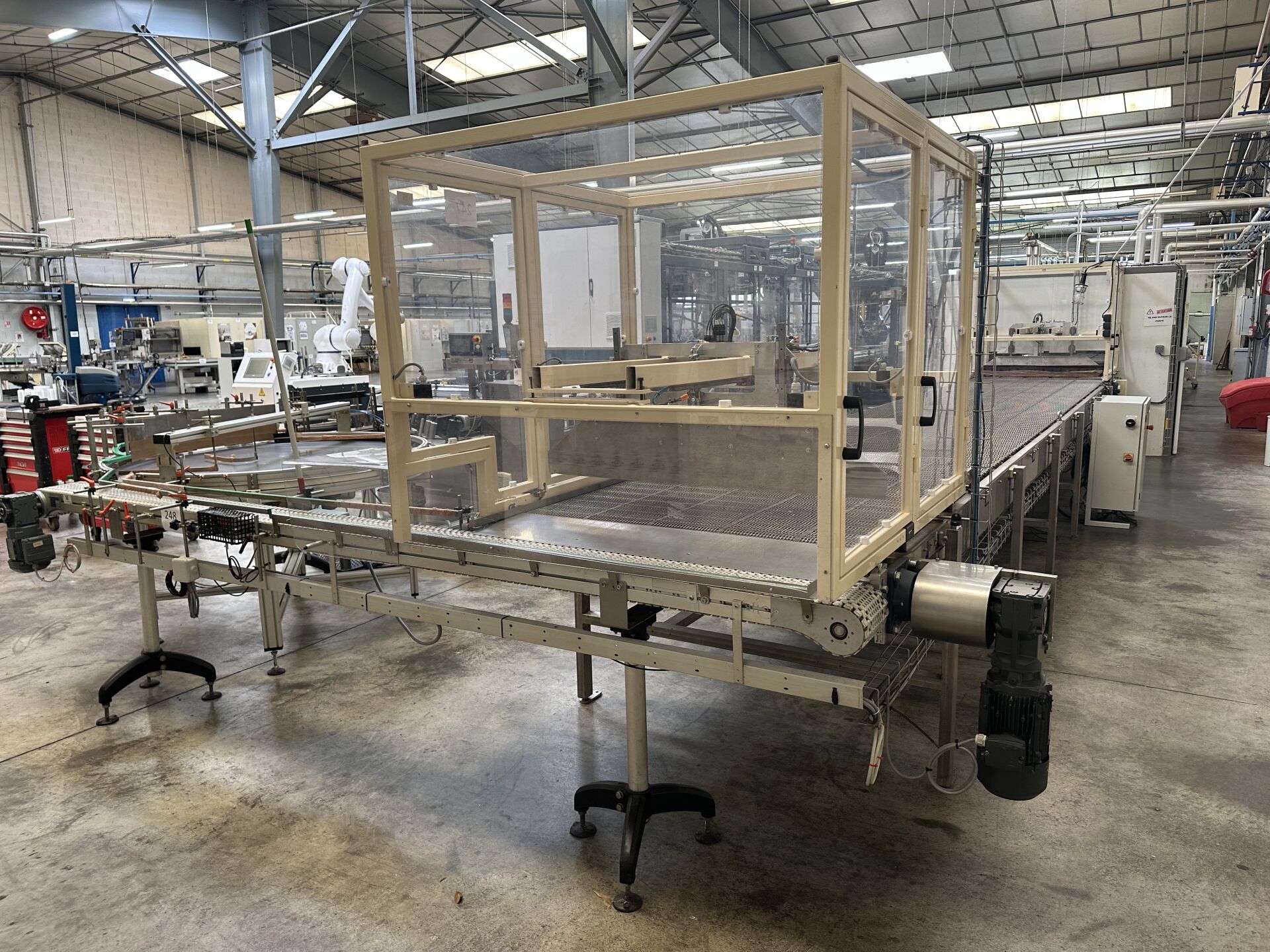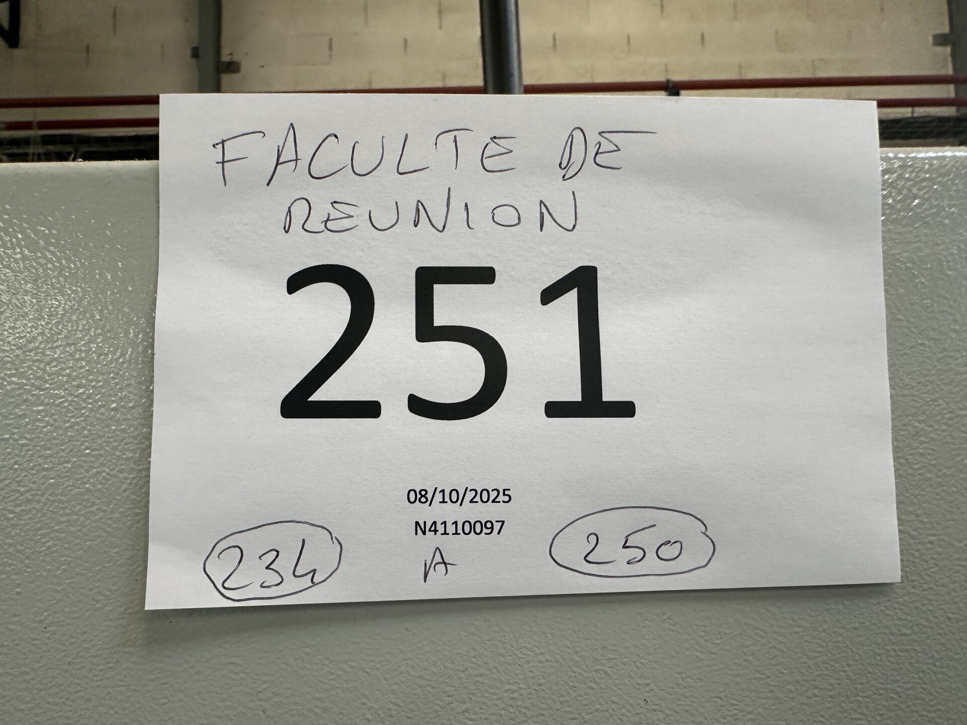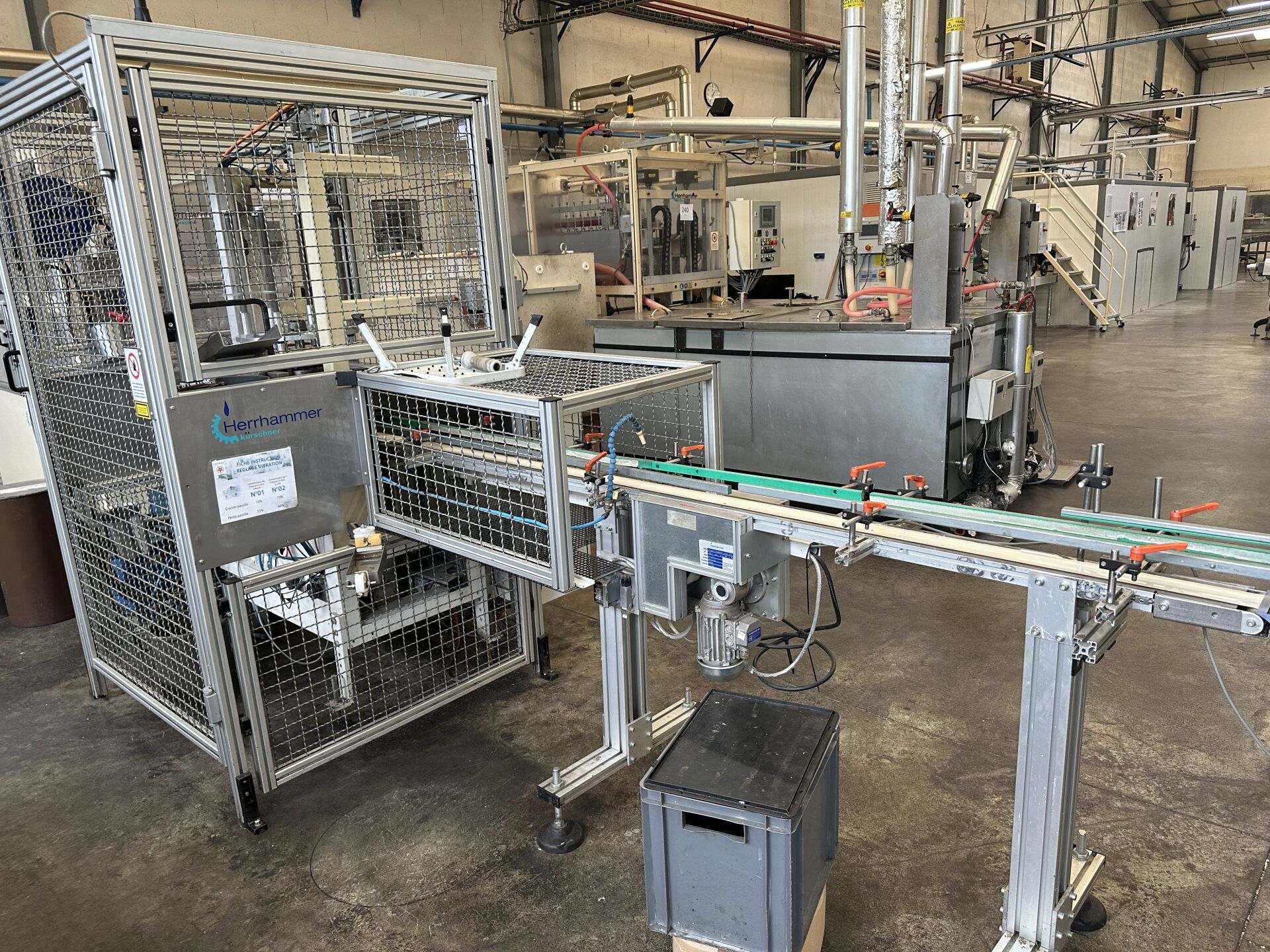 Sur 1 ligne de remplissage (LR2) HERRHAMMER - FACULTE DE REUNION - LOTS 234 à 250 : 234/-1 robot dépalettiseur YASKAWA MOTOMAN PL 190 YR-1-041 XH190 A00 de 2021, (190 kg max/ portée 3161 mm max) dans une cellule sécurisée : grilles de 440 x 550 cm, hauteur 250 cm avec pupitre de commande écran digital JZRCR-APP01 235/-1 convoyeur à palette NORD type SK 92372 1000 x1300 mm et 2500 x 300 mm en retour de 2022 236/-1 module de pose de mèche HERRHAMMER DEM-L125-210-8 DSB W002400214 + grille de protection, de 2014 avec convoyeur à bande intégré longueur 450 cm largeur 8 cm 237/ -1 module de poussée 2 axes EINSCHUBSTATION HERRHAMMER de 2014 ,1300 x 700 mm, dimensions totales 185 x 110 x 200 cm cage vitrée 238/ -1 convoyeur à mailles 24 200 x 1300 mm HERRHAMMER No 09200130 de 2014 moteur NORD SK8DLH/4 239/-1 four de chauffe de contenant servant de tunnel de préchauffage , hauteur réglable (180 x 180 cm) No 25800128 de 2014 240/-2 bacs remplisseurs automatisés avec détecteurs et ouverture de buses 14 buses FULLER DUO de 2014 No 005300254, protection vitrée 210 x 100 cm + 2 bacs bain d'huile mobiles 232 X 80 X 90 cm hors roues 241/-1 armoire de commande générale 242/-1 caisson de refroidissement 2500 x 3500 mm x 2100 mm avec 1 porte KIDE, avec 2 groupes CIAT HELIO 4633 EF MONO 243/-1 caisson de refroidissement 2500 x 3500 mm x 2100 mm avec 1 porte KIDE, avec 2 groupes CIAT HELIO 4633 EF MONO 244/-1 caisson de refroidissement 2500 x 2500 mm x 2100 mm avec 1 porte KIDE, avec 2 groupes CIAT HELIO 4633 EF MONO 245/ -2 modules d'égalisation EGALISIERSTATION de 2014 No 25800126 avec cage grillagée 190 x 105 x140 cm 246/-1 convoyeur à mailles 8000 x 1300 mm moteur SIEMENS équipé de 4 ventilateurs 247/-1 module de poussée de sortie 1200 x 800 mm, course verticale 100 mm 248/ -1 tapis de convoyage 3600 x 200 mm HERRHAMMER CS 200 SL de 2014, moteur SEW EURODRIVE 249/ -1 table d'accumulation inox rotative diam 1500 mm 250/-1 étiqueteuse ALBAGNAC ECM de 2014 No 047 à double convoyeur (160 x 12 et 130 x1 2 cm) -1 caméra de vision BAUMER avec module de pilotage et écran de contrôle KEP MM15128R11 (frais de mise à disposition 2500 € TTC)