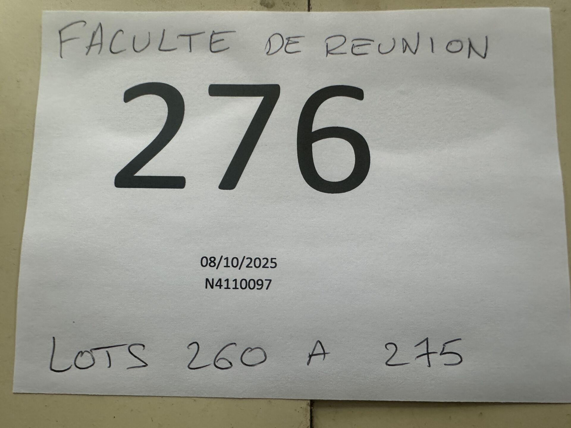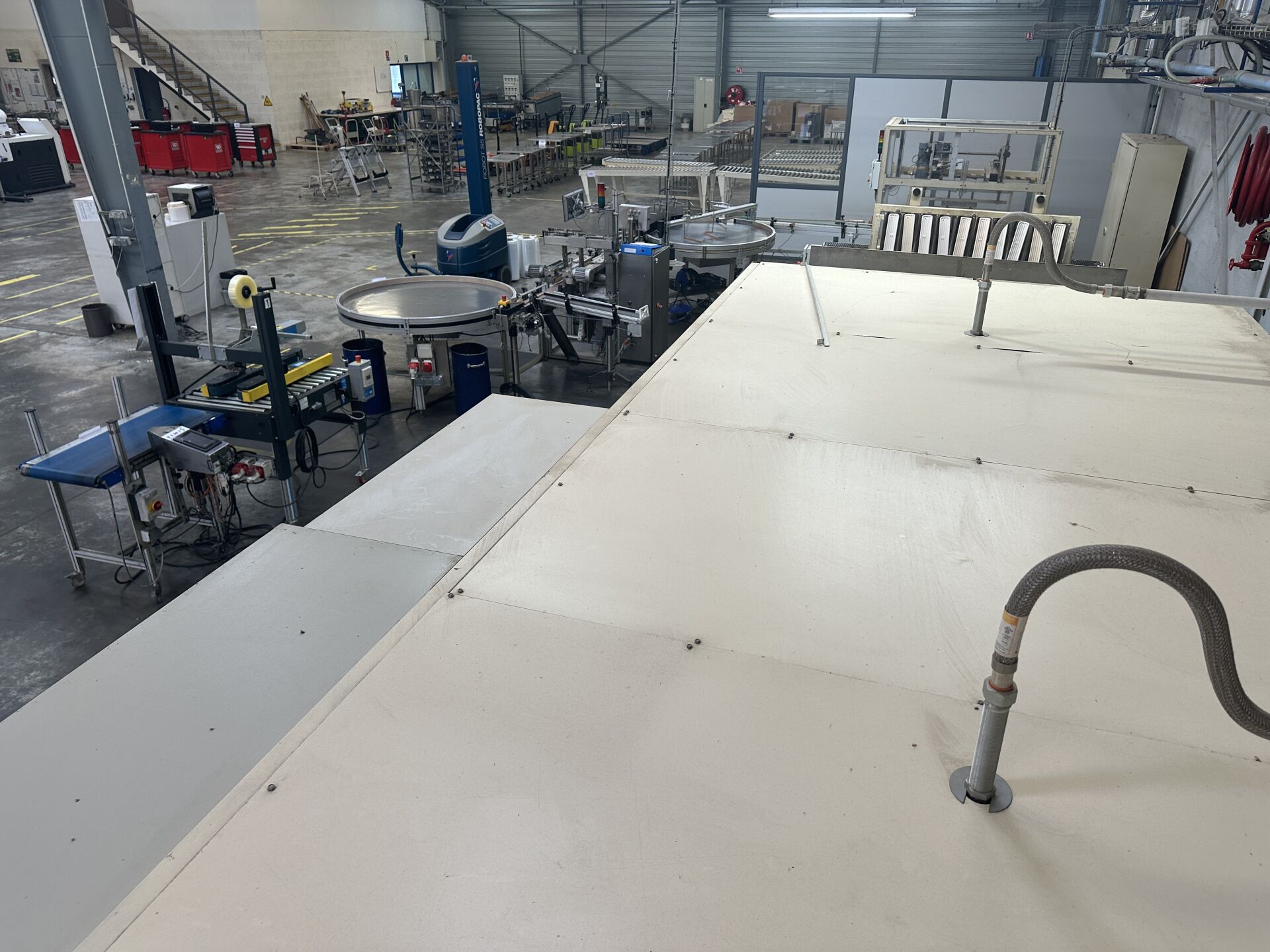 Ligne de remplissage (LR1) HERRHAMMER - FACULTE DE REUNION - LOTS 260 à 275 : 260/ 1 table d'accumulation rectangulaire double flux équipée d'un convoyeur motorisé à palettes 3000 x 1200 mm type RONDL00PTAFEL 600/600 de 2012 moteur SEW 261/ 1 convoyeur à bande 6000 x 100 mm moteur RGM 262/ 1 module de pose de mèche automatique HERRHAMMER DEM-L-125-210 de 2012 avec pupitre de commande SIEMENS TOUCH , cage de protection 280 x 110 cm 263/ 1 convoyeur à mailles 24000 X 1000 mm équipé d'un module poussoir automatisé de 2007 4 rangées de ventilation 2 têtes 264/1 four chauffe-contenant HERRHAMMER GLASER VOTWARMSTATION No 25000044 de 2007, réglage en hauteur 170 x 140 cm 265/2 bacs remplisseurs automatisés avec détecteurs et ouverture de buse 10 buses FULLER DUO No 05300190 de 2012 , cage de protection vitrée 200 x 110 cm + 2 bacs bain d'huile mobiles 232 X 80 X 90 cm hors roues 266/2 caissons de refroidissement 4000 x 2000 mm (groupes inacessibles) 267/2 modules d'égalisation EGALISIERSTATION de 2007 et de 2012 dans cage de protection 165 x 110 cm 268/1 module de poussée 2 axes 1200 x 800 mm ABSCHUSTATION de 2012 dans une cage vitrée 175 x 110 cm 269/1 convoyeur à palettes 3500 x 2000 mm HERRHAMMER MB95 de 2012, moteur SEW 270/1 table d'accumulation motorisée inox diam 1500 mm 271/ 1 étiqueteuse ALBAGNAC ECM de 2013 No 045 avec 2 convoyeurs largeur 10 cm longueur 150 cm et 130 cm 272/1 table d'accumulation inox rotative diam 1500 mm 273/1 scotcheuse IAT S8/4S No 50011 de 2012 à convoyeur à rouleaux 95x75 cm 274/1 convoyeur à bande 1000 x 500 mm 1 imprimante carton LIMITRONICS V5 de 2021 No ECV5000201 275/1 armoire de commande générale (frais de mise à disposition 1000 € TTC)