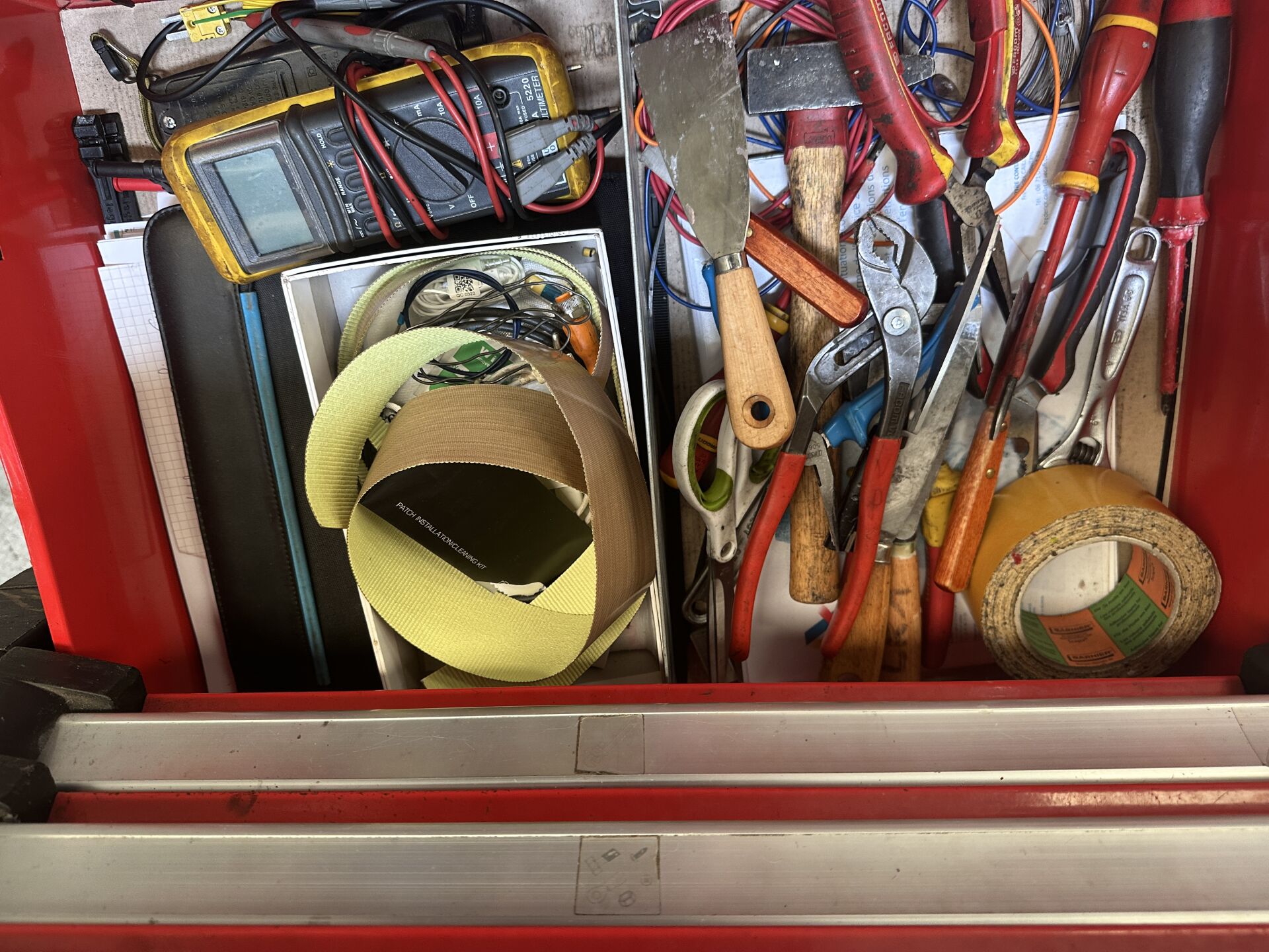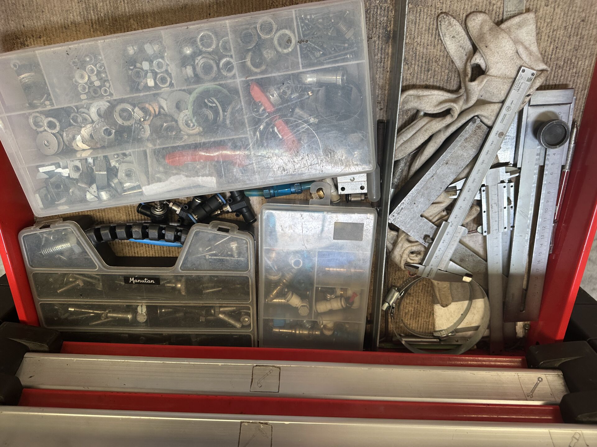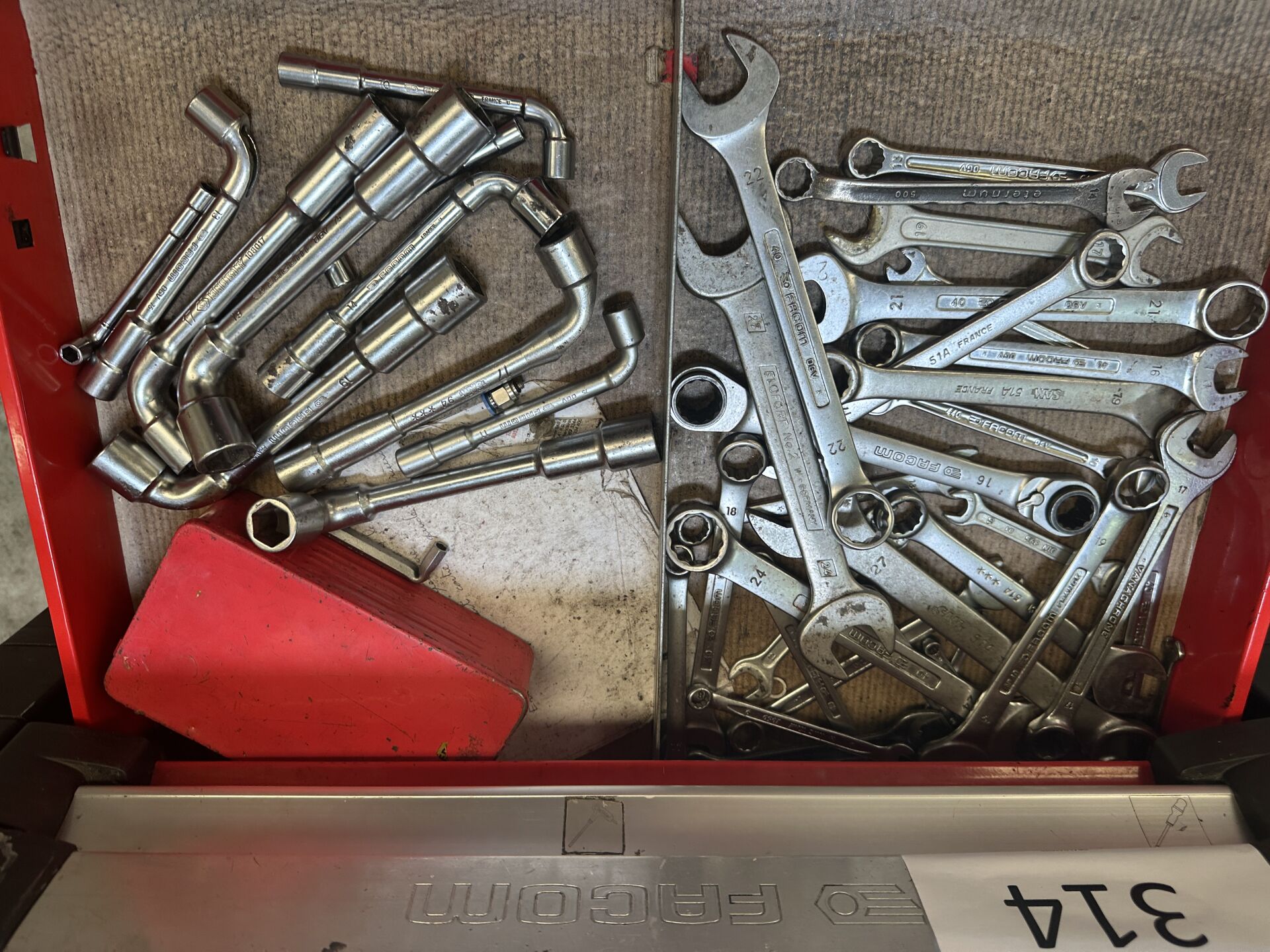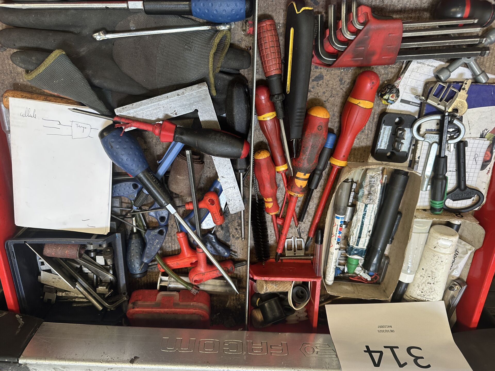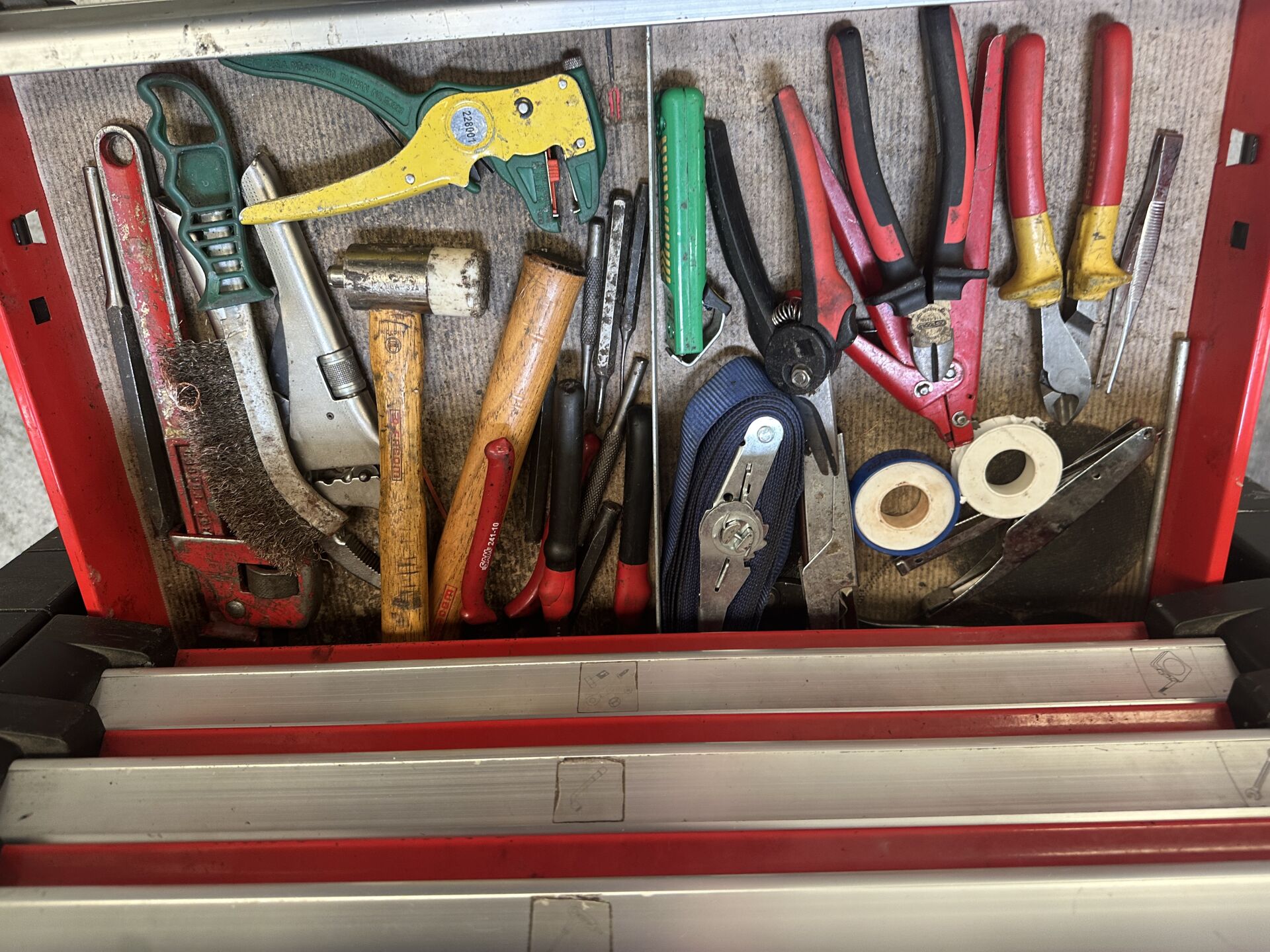 1 servante d'atelier FACOM modèle Jet + 3, 6 tiroirs, garnie d'outillage manuel : clés, pinces, tournevis ... avec étau mors parallèles (frais de mise à disposition 10 € TTC)
