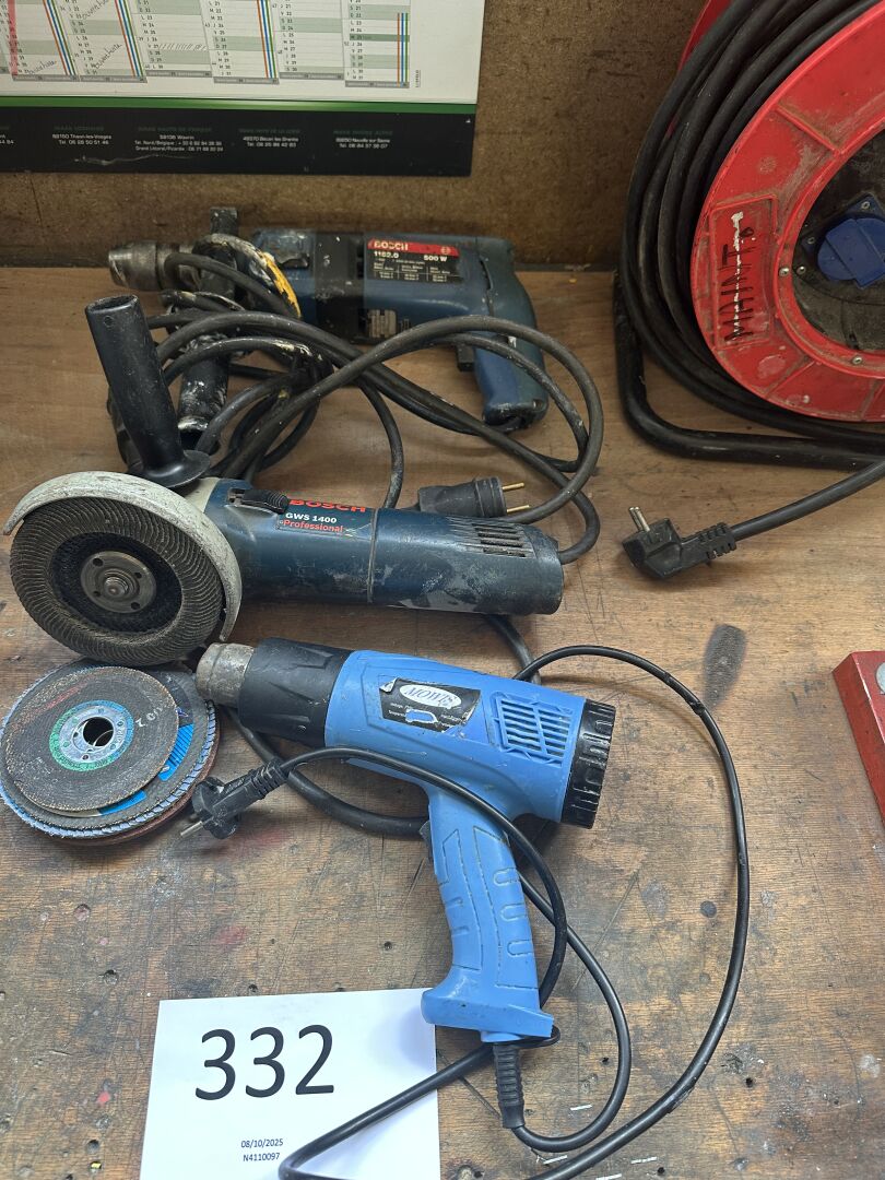 1 meuleuse d'angle BOSCH GWS 1400 diam 125 mm , 1 perforateur BOSCH 1182.0 et 1 torche à air chaud MOWIS avec 1 rallonge électrique sur touret CEBA (frais de mise à disposition 10 € TTC)