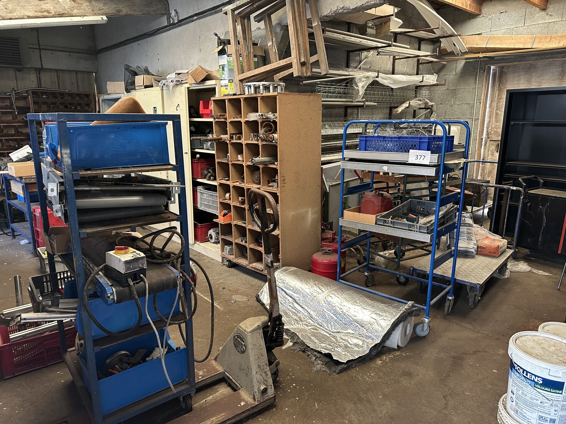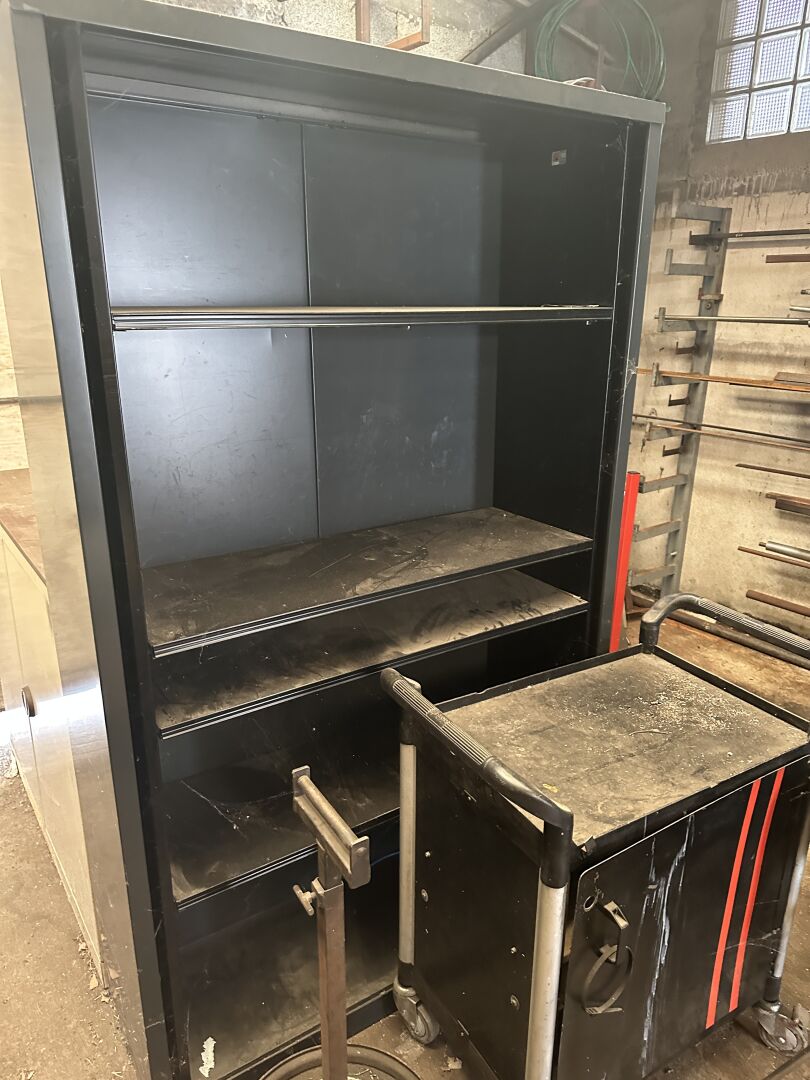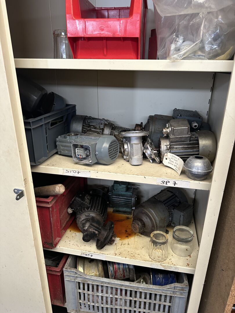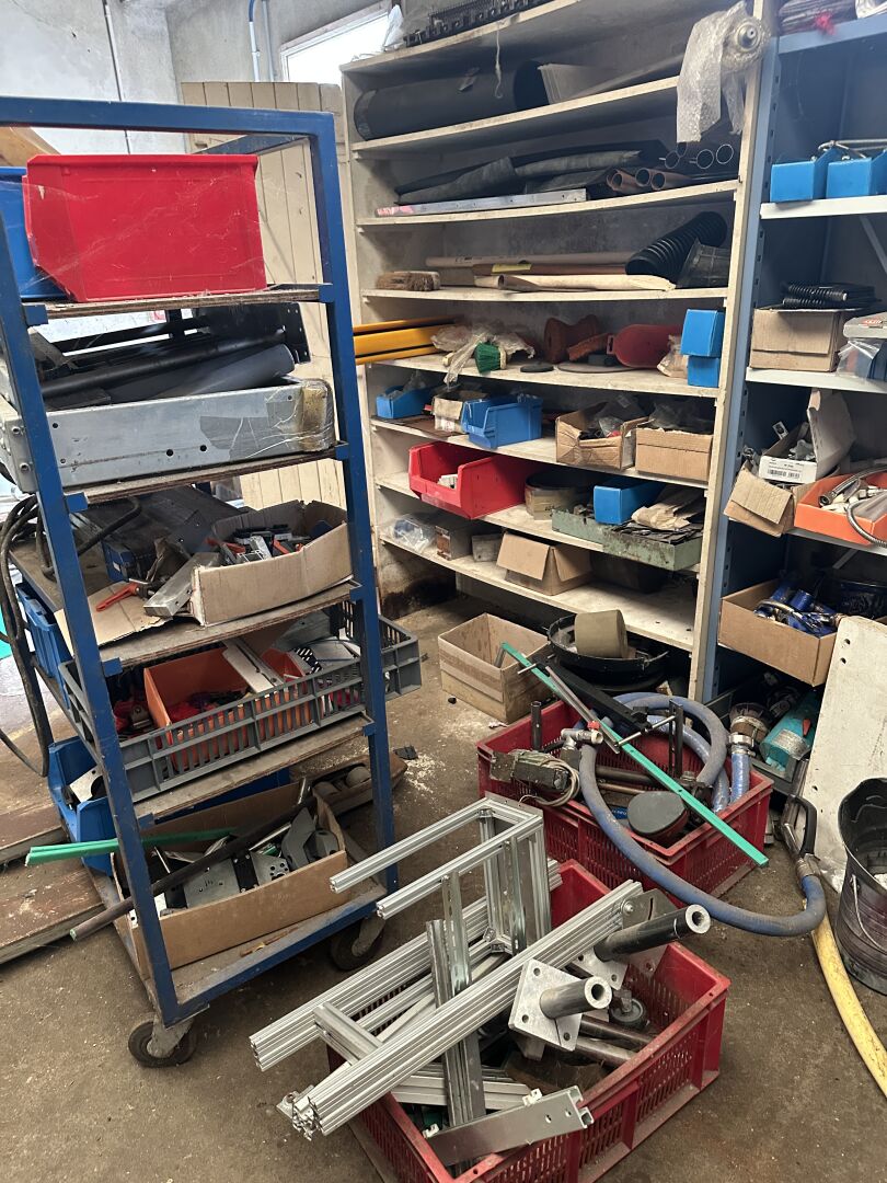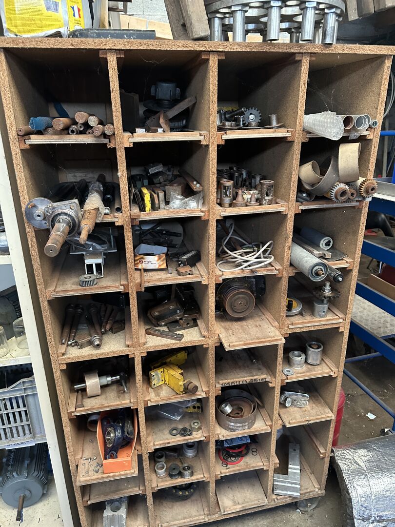 1 ensemble de mobilier et chariots en état moyen comprenant : 4 chariots verticaux métal bleu - 2 chariots de manutention - 3 armoires métal beige 2 portes - 3 étagères à pièces en bois 1 étagère métal bleu - 1 étagère métal gris - 2 étagères hautes métal - 1 étagère blanche - 1 étagère métal noir - 3 modules d'étagères - 2 servantes à rouleaux - 1 chariot archives -1 placard bas métal beige - 1 escabeau bois et tube état moyen - 1 module de vestiaires 2 cases métal gris - 1 établi plateau bois métal rouge équipé d'un étau mors parallèles - 1 vestiaire métal gris 2 cases - 1 vestiaire métal gris et bleu 2 cases 1 lot de pièces détachées de récupération essentiellement plomberie : raccords, vannes, ... et moteurs de convoyeurs, résistances thermiques, flexibles, gaines, pièces détachées diverses, roues de chariots, pièces rebutées, ventilateurs HS, transpalettes HS, chemins de câble, tubes PVC, petit stock de ferraille dont plats, tubes, carrés acier en 3 m (frais de mise à disposition 30 € TTC)