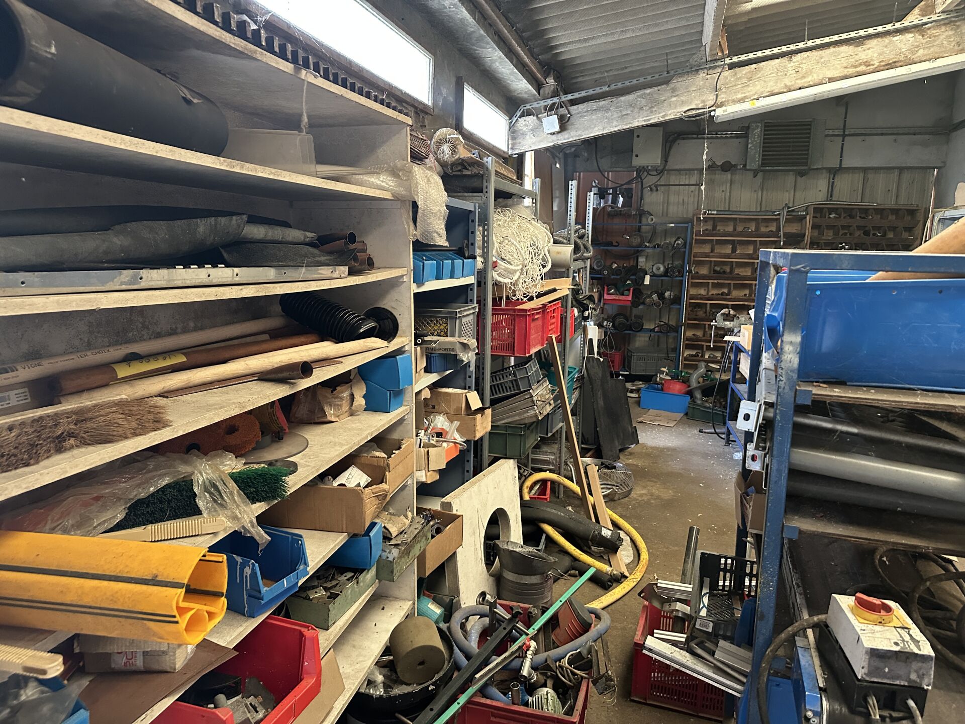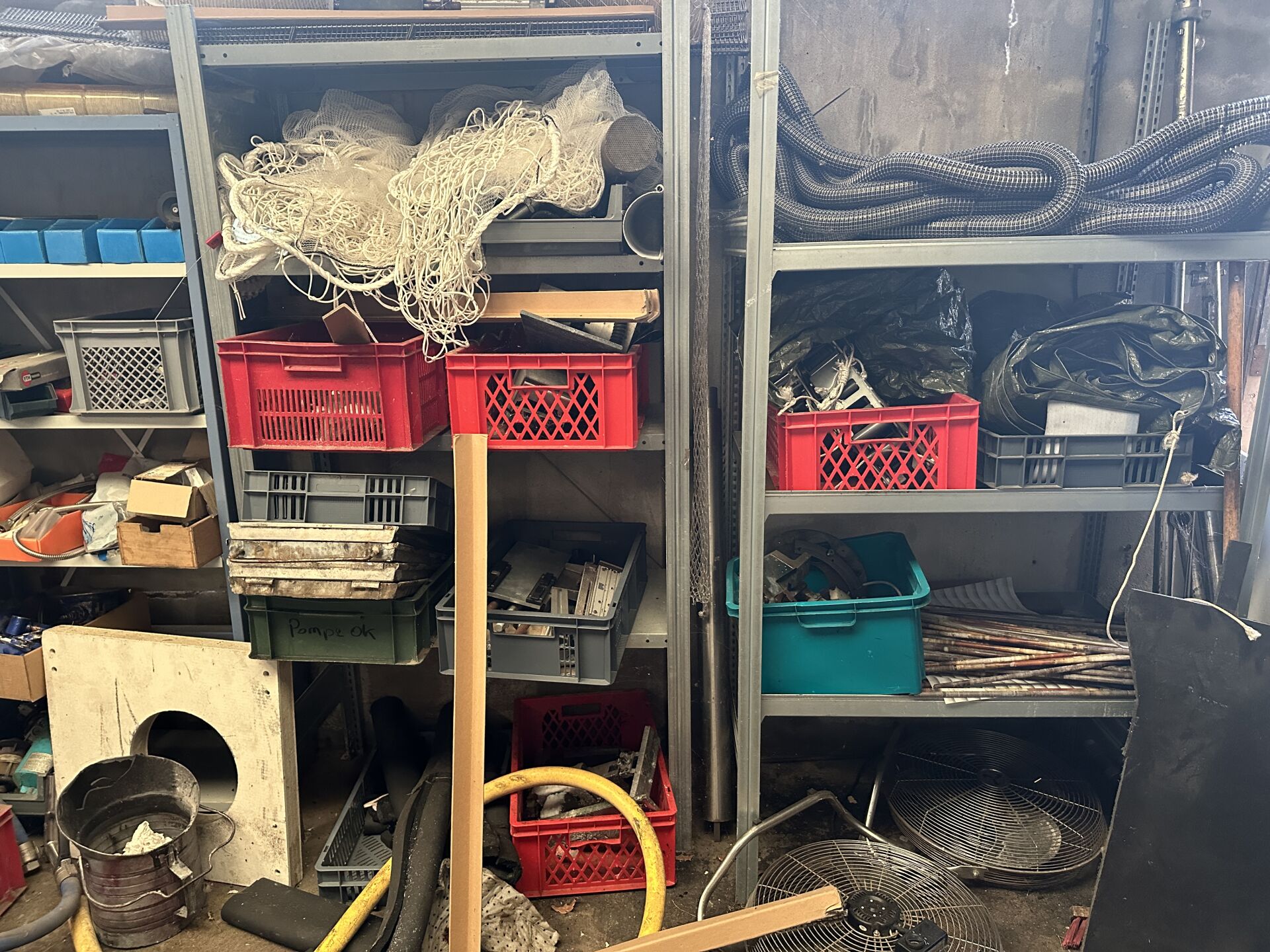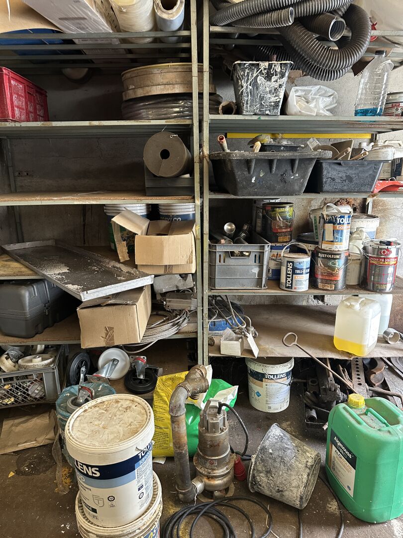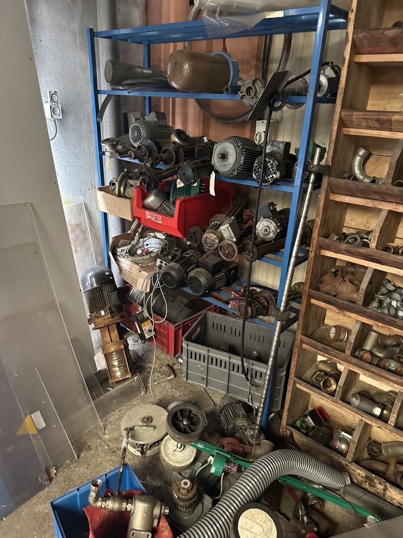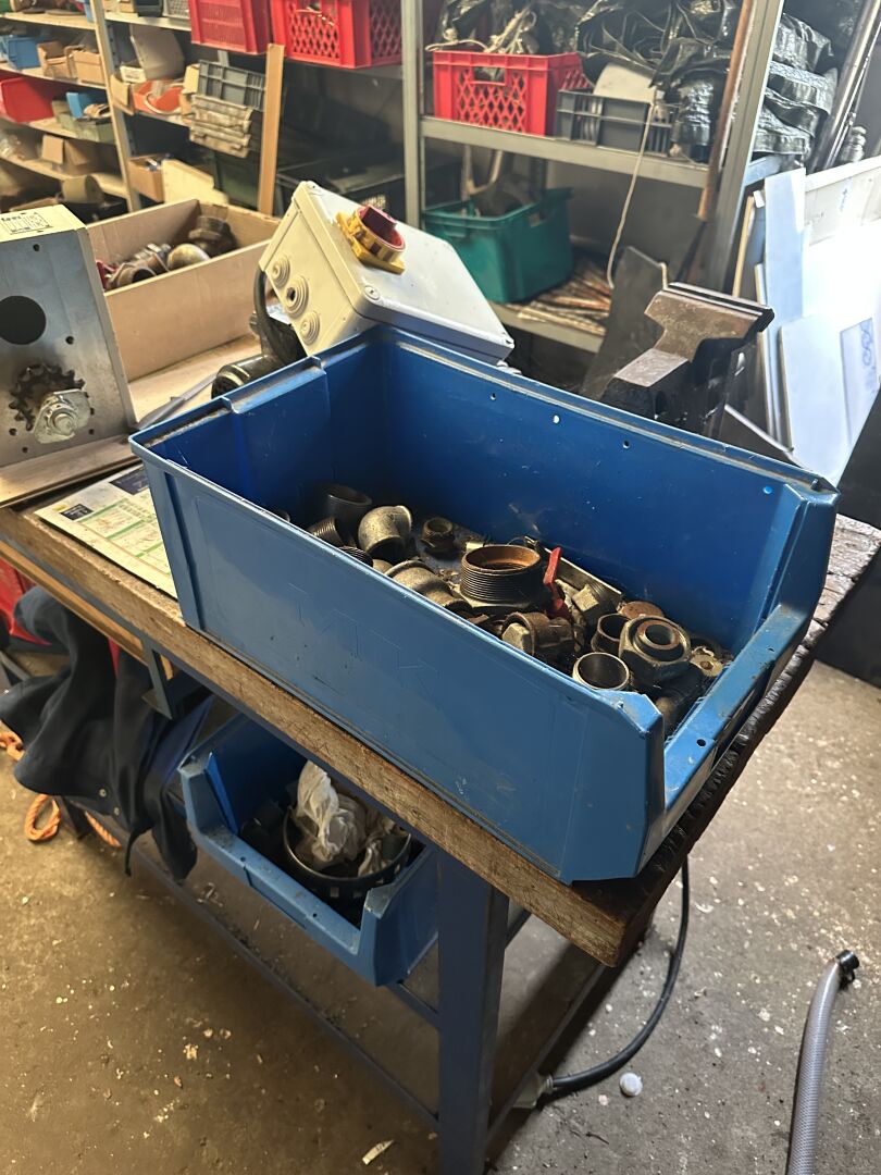 1 ensemble de mobilier et chariots en état moyen comprenant : 4 chariots verticaux métal bleu - 2 chariots de manutention - 3 armoires métal beige 2 portes - 3 étagères à pièces en bois 1 étagère métal bleu - 1 étagère métal gris - 2 étagères hautes métal - 1 étagère blanche - 1 étagère métal noir - 3 modules d'étagères - 2 servantes à rouleaux - 1 chariot archives -1 placard bas métal beige - 1 escabeau bois et tube état moyen - 1 module de vestiaires 2 cases métal gris - 1 établi plateau bois métal rouge équipé d'un étau mors parallèles - 1 vestiaire métal gris 2 cases - 1 vestiaire métal gris et bleu 2 cases 1 lot de pièces détachées de récupération essentiellement plomberie : raccords, vannes, ... et moteurs de convoyeurs, résistances thermiques, flexibles, gaines, pièces détachées diverses, roues de chariots, pièces rebutées, ventilateurs HS, transpalettes HS, chemins de câble, tubes PVC, petit stock de ferraille dont plats, tubes, carrés acier en 3 m (frais de mise à disposition 30 € TTC)