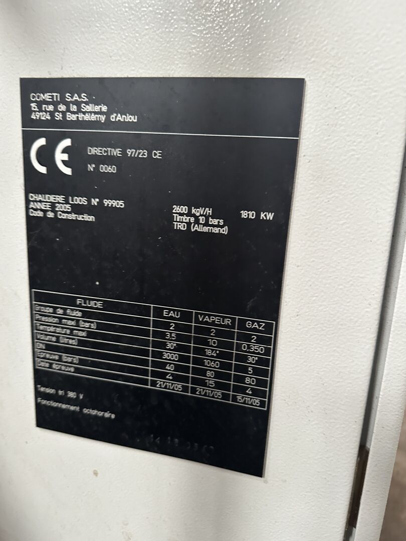 1 chaudière gaz LOOS type UL-S de 2005 (HORS SERVICE) pression max : 10 bars, pression épreuve 19 bars , température max 184° , débit vapeur 2600 KG/h, cuve de 4060 Litres 330cm, diam 190 cm A démonter proprement sans dommage à l'immeuble (frais de mise à disposition 500 € TTC)