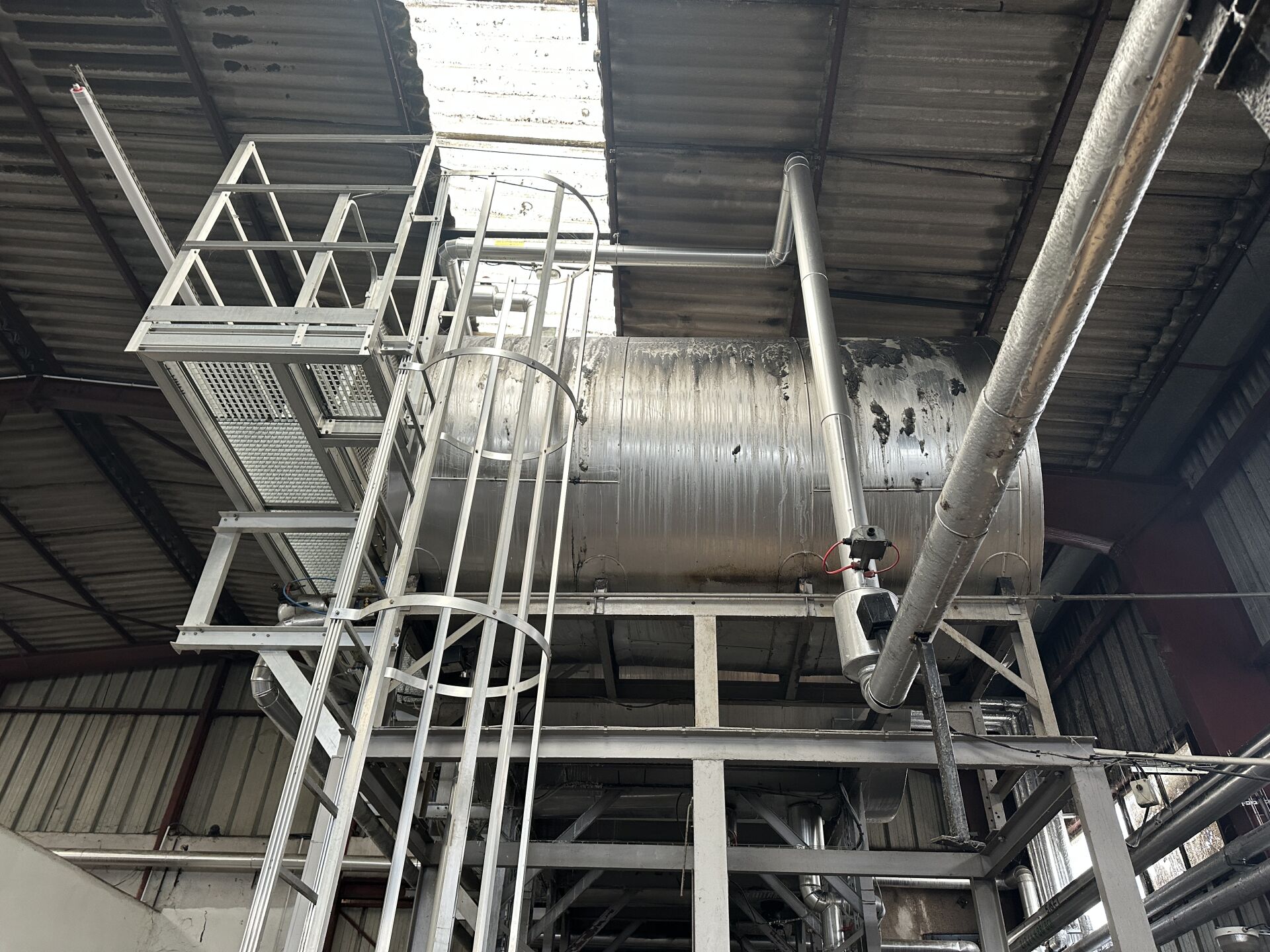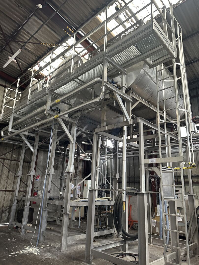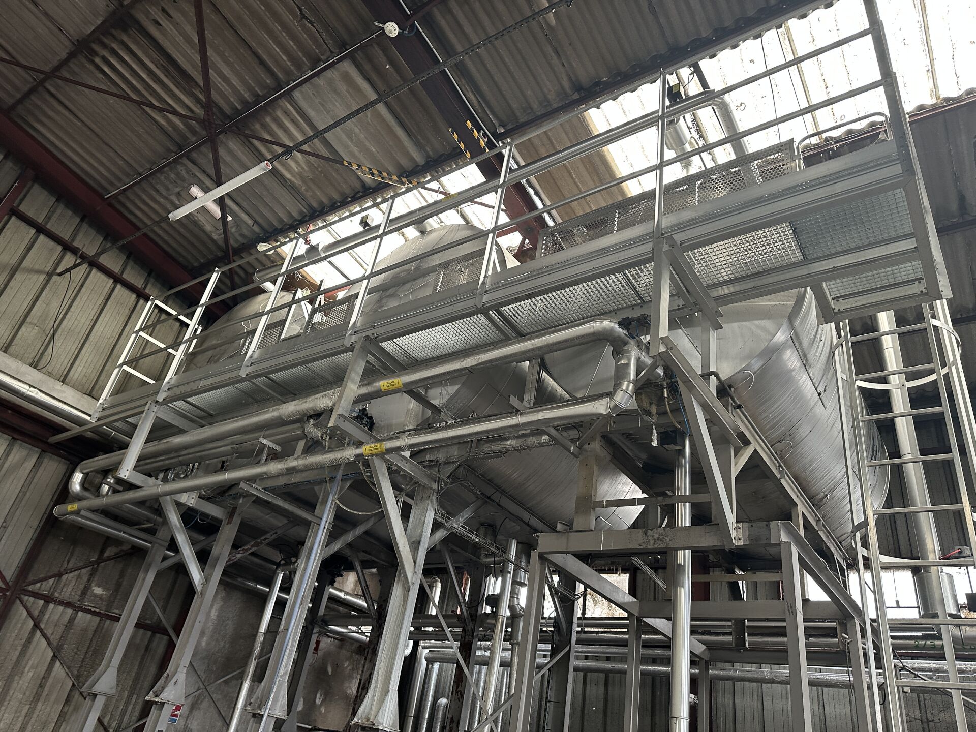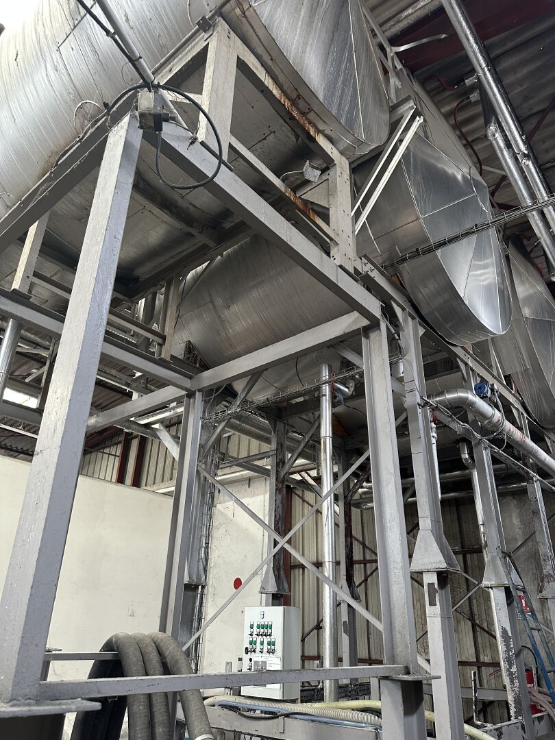 3 cuves aériennes cylindriques inox double peau 12 000 L, 12 000 L et 7500 L sur structure métallique hauteur 430 cm, L 680 m, P 300 cm, avec échelle de service et passerelle à démonter proprement en respectant l'étanchéité (frais de mise à disposition 50 € TTC)