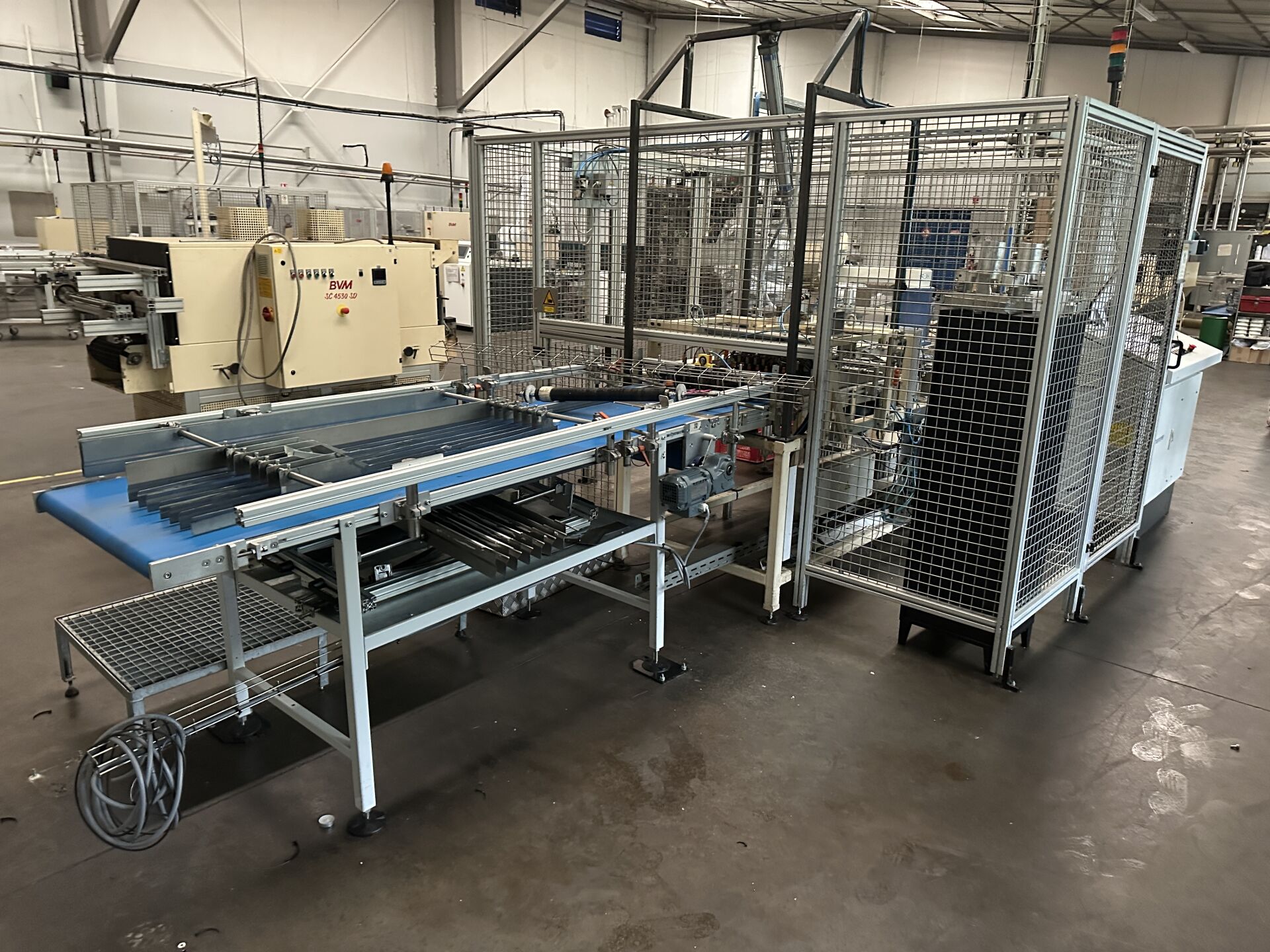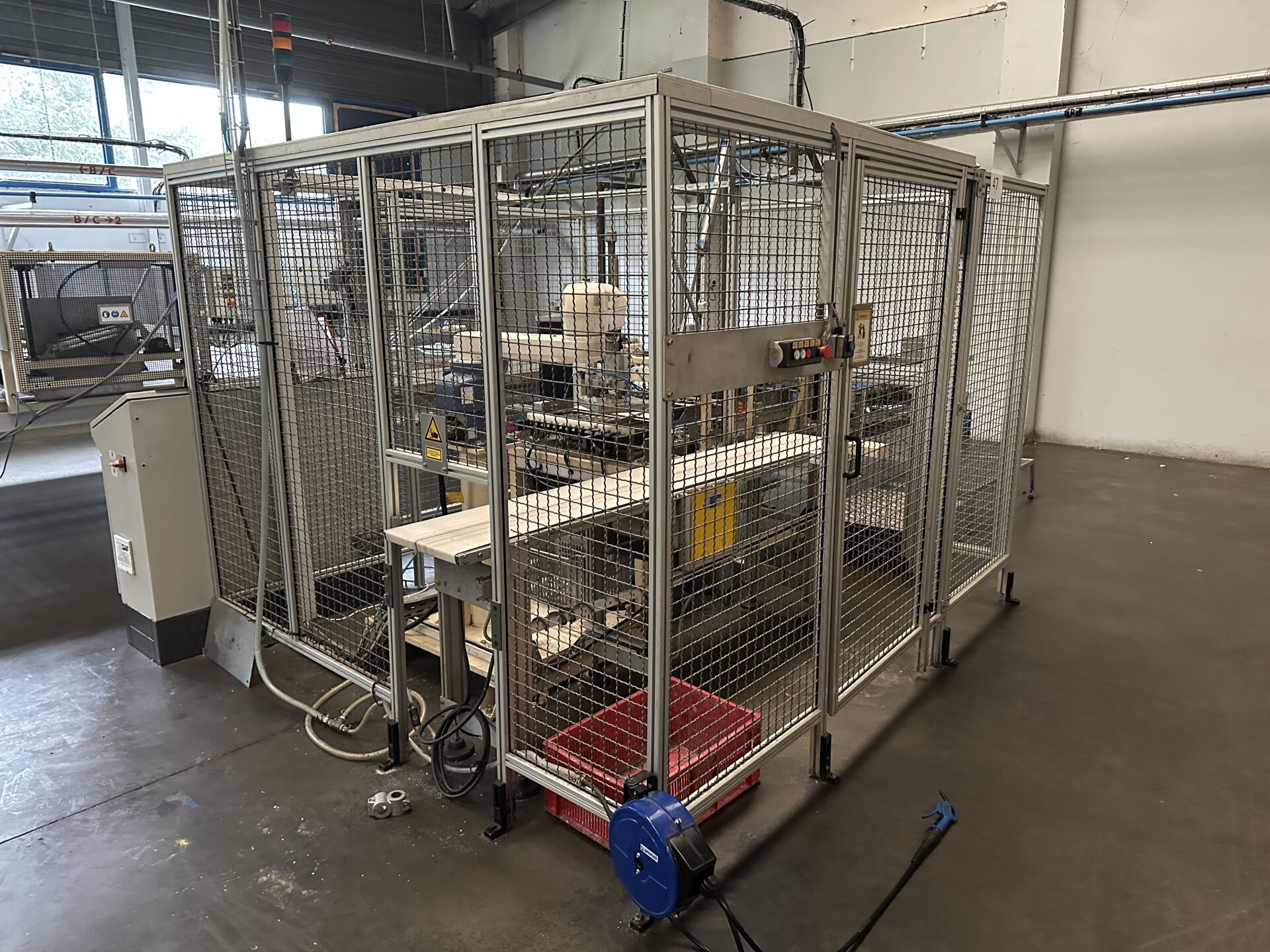 Vendu sur désignation le 04 11 2025 à 10h à NANTES, 24 rue du marché commun, visible le 03/11/2025 de 14h à 16h à GETIGNé, Enlèvement jusqu'au 19 décembre 2025 HALL 1 : CP1 - (partie de la ligne de production de chauffe-plats (utilisée couleur) -2 tapis de convoyage à bande 2000 x 700 mm , 1600 x 700 mm -1 robot d'empilage DENSO XY 2 axes HM4AAO2M de 2015 avec télécommande -1 convoyeur à bande sortie Robot 2300 x 400 mm le tout dans enclos de sécurité grillagé 295 x 300 cm (frais de mise à disposition 200 € TTC)