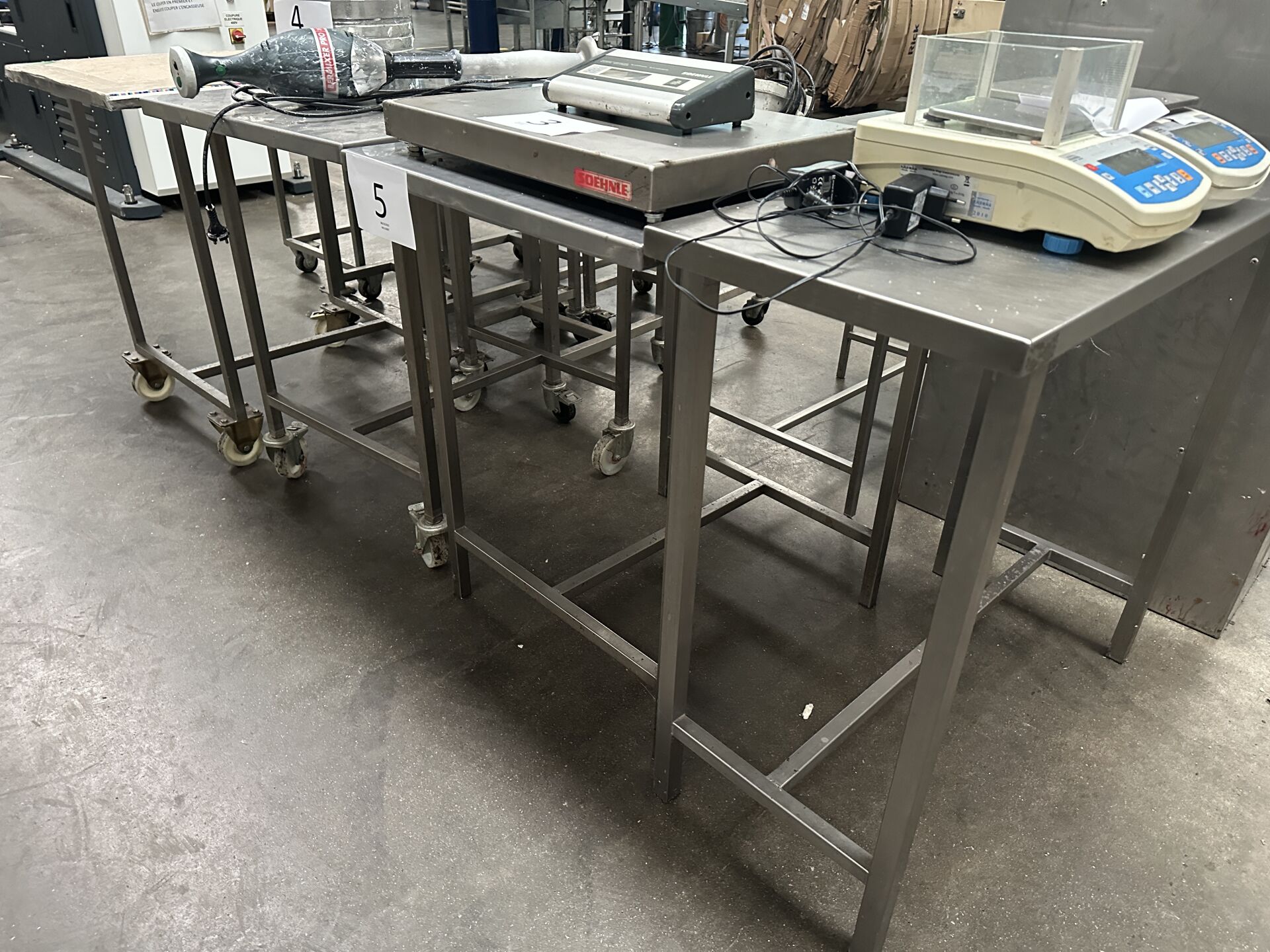 4 dessertes inox (2 en 81 x 61 cm mobiles) et (1 en 81 x 60 cm et 1 en 96 x 40 cm fixes) (frais de mise à disposition 10 € TTC)